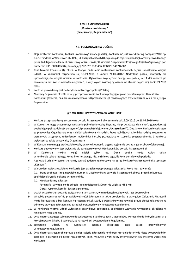 REGULAMIN KONKURSU „Konkurs urodzinowy” (dalej zwany „Regulaminem”) § 1. POSTANOWIENIA OGÓLNE 1. 2. 3. 4. Organizatorem konkursu „Konkurs urodzinowy” zwanego dalej „Konkursem” jest World Dating Company WDC Sp. z o.o. z siedzibą w Warszawie (02-026), ul. Raszyńska 32/44/81, wpisaną do rejestru przedsiębiorców prowadzonego przez Sąd Rejonowy dla m. st. Warszawy w Warszawie, XII Wydział Gospodarczy Krajowego Rejestru Sądowego pod numerem KRS: 0000465907, posiadającą NIP: 7010383466, REGON: 146716082 Czas trwania konkursu (tj. okres, w którym nadesłanie materiałów konkursowych będzie umożliwiało wzięcie udziału w konkursie) rozpoczyna się 15.09.2016, a kończy 26.09.2016r. Nadesłane później materiały nie upoważniają do wzięcia udziału w Konkursie. Ogłoszenie zwycięzców nastąpi nie później niż 4 dni robocze po zamknięciu możliwości nadsyłania zgłoszeń, a więc wyniki zostaną ogłoszone na stronie najpóźniej do 30.09.2016 roku. Konkurs prowadzony jest na terytorium Rzeczypospolitej Polskiej. Niniejszy Regulamin określa zasady przeprowadzania Konkursu polegającego na przesłaniu przez Uczestnika Konkursu zgłoszenia, na adres mailowy: [email protected] zawierającego treść wskazaną w § 7 niniejszego Regulaminu. § 2. WARUNKI UCZESTNICTWA W KONKURSIE 1. 2. 3. 4. 5. 6. 7. 8. 9. 10. 11. 12. 13. Konkurs przeprowadzony zostanie na portalu Przeznaczeni.pl w terminie od 15.09.2016 do 26.09.2016 roku. W Konkursie mogą uczestniczyć wyłącznie pełnoletnie osoby fizyczne, nie prowadzące działalności gospodarczej, posiadające pełną zdolność do czynności prawnych (dalej zwane: „Uczestnikami”). Z udziału w Konkursie wyłączeni są pracownicy Organizatora oraz najbliżsi członkowie ich rodzin. Przez najbliższych członków rodziny rozumie się: wstępnych, zstępnych, rodzeństwo, małżonków i osoby pozostające w stosunku przysposobienia. Z konkursu wyłączeni są także pracownicy Organizatora W Konkursie nie mogą brać udziału osoby prawne i jednostki organizacyjne nie posiadające osobowości prawnej. Konkurs dedykowany jest wyłącznie dla zarejestrowanych Użytkowników portalu Przeznaczeni.pl W Konkursie można wziąć udział tylko raz. Dana osoba może wziąć udział w Konkursie tylko z jednego konta internetowego, niezależnie od tego, ile kont e-mailowych posiada. Aby wziąć udział w konkursie należy wysłać zadanie konkursowe na adres [email protected] z tematem „Konkurs”. Warunkiem wzięcia udziału w Konkursie jest przesłanie poprawnego zgłoszenia, które musi zawierać: 7.1. Dane osobowe: imię, nazwisko, numer ID Użytkownika w serwisie Przeznaczeni.pl oraz pracę konkursową spełniającą kryteria opisane w regulaminie. 7.2. Możliwe formy zgłoszeń: Fotografia. Wymogi co do zdjęcia - nie mniejsze nić 300 px nie większe niż 2 MB. Obraz, rysunek, komiks, życzenia pisemne. Udział w Konkursie i podanie związanych z tym danych, w tym danych osobowych, jest dobrowolne. Wszelkie pytania odnośnie prawidłowej treści Zgłoszenia, a także problemów z przyjęciem Zgłoszenia Uczestnik może kierować na adres [email protected]. Każdy z Uczestników ma również prawo złożyć reklamację na odmowę przyjęcia Zgłoszenia na zasadach opisanych w §7 niniejszego Regulaminu. W Konkursie wezmą udział wyłączenie prawidłowe Zgłoszenia, spełniające wszystkie wymagania określone w niniejszym Regulaminie. Organizator zastrzega sobie prawo do wykluczenia z Konkursu tych Uczestników, w stosunku do których Komisja, o której mowa w §5 pkt. 1 stwierdzi, że naruszyli oni postanowienia Regulaminu. Zgłoszenie udziału w Konkursie oznacza akceptację jego zasad przewidzianych w niniejszym Regulaminie. Organizator zastrzega sobie prawo do nieprzyjęcia zgłoszeń do Konkursu, które nie dotarły do niego w odpowiednim terminie, z przyczyn od niego niezależnych, m.in. wskutek awarii łączy internetowych czy systemu Uczestnika Konkursu. 14. Zwycięzca Konkursu nie może przenieść prawa do otrzymania nagrody na osoby trzecie, ani zamienić jej na ekwiwalent pieniężny. §3. NAGRODY W Konkursie zostanie przyznanych 11 nagród (jedenaście nagród), zwane dalej: „Nagrody”. 1.1. Za miejsca 1-11( jeden-jedenaście) przewidziano Nagrody w postaci 11 (jedenastu) rocznych abonamentów Konta Premium w serwisie Przeznaczeni.pl o wartości 1166 zł (tysiąc sto sześćdziesiąt sześć złotych) brutto. 2. Zwycięzcom nie przysługuje prawo przeniesienia wymiany Nagród na ekwiwalent pieniężny. 3. Organizator nie ponosi odpowiedzialności za brak możliwości pprzekazania Nagród z przyczyn leżących po stronie uczestnika. §4 ZASADY PRZYZNAWANIA I SPOSÓB WYDANIA NAGRÓD W KONKURSIE 1. 2. 3. Zadanie Uczestników Konkursu polega na przesłaniu życzeń urodzinowych dla portalu Przeznaczeni.pl. Odpowiedź należy przesłać w terminie do: 26.09.2016 r., do godziny 23:59, na adres [email protected] Uczestnik Konkursu wraz z przesłaniem Odpowiedzi do Konkursu oświadcza, że posiada prawa autorskie do przesłanej Odpowiedzi oraz wyraża nieodpłatnie zgodę na rozpowszechnianie/wykorzystywanie przez Organizatora konkursu swojej pracy konkursowej oraz w przypadku zgłoszenia pracy z wizerunkiem uczestnika, uczestnik wyraża zgodę na nieodpłatne rozpowszechnianie/wykorzystywanie przez Organizatora konkursu swojego wizerunku przedstawionego w zgłoszeniu konkursowym w zakresie i na polach eksploatacji określonych w niniejszym Regulaminie. Uczestnik Konkursu oświadcza że osoby, których dane i wizerunek zostały wykorzystane w Odpowiedzi wyraziły nieodpłatnie zgodę na ich wykorzystanie/rozpowszechnianie przez Organizatora Konkursu w zakresie i na polach eksploatacji określonych w niniejszym Regulaminie. Uczestnik Konkursu oświadcza, iż ma poświadczoną ww. zgodę innych osób na piśmie. Organizator zastrzega sobie prawo do odmowy przyjęcia Odpowiedzi która narusza obowiązujące p