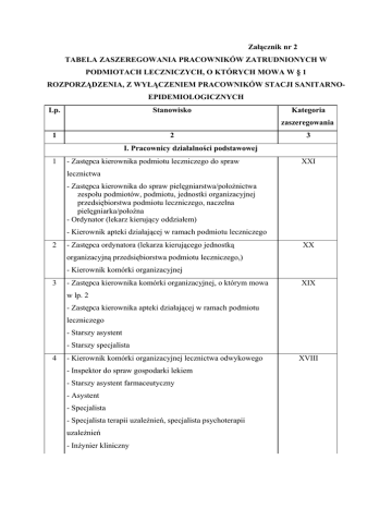 Załącznik nr 2 TABELA ZASZEREGOWANIA PRACOWNIKÓW ZATRUDNIONYCH W PODMIOTACH LECZNICZYCH, O KTÓRYCH MOWA W § 1 ROZPORZĄDZENIA, Z WYŁĄCZENIEM PRACOWNIKÓW STACJI SANITARNOEPIDEMIOLOGICZNYCH Lp. Stanowisko Kategoria zaszeregowania 1 2 3 I. Pracownicy działalności podstawowej 1 - Zastępca kierownika podmiotu leczniczego do spraw XXI lecznictwa - Zastępca kierownika do spraw pielęgniarstwa/położnictwa zespołu podmiotów, podmiotu, jednostki organizacyjnej przedsiębiorstwa podmiotu leczniczego, naczelna pielęgniarka/położna - Ordynator (lekarz kierujący oddziałem) - Kierownik apteki działającej w ramach podmiotu leczniczego 2 - Zastępca ordynatora (lekarza kierującego jednostką XX organizacyjną przedsiębiorstwa podmiotu leczniczego,) - Kierownik komórki organizacyjnej 3 - Zastępca kierownika komórki organizacyjnej, o którym mowa XIX w lp. 2 - Zastępca kierownika apteki działającej w ramach podmiotu leczniczego - Starszy asystent - Starszy specjalista 4 - Kierownik komórki organizacyjnej lecznictwa odwykowego - Inspektor do spraw gospodarki lekiem - Starszy asystent farmaceutyczny - Asystent - Specjalista - Specjalista terapii uzależnień, specjalista psychoterapii uzależnień - Inżynier kliniczny XVIII - Inspektor ochrony radiologicznej typu S(IOR/S) 5 - Asystent farmaceutyczny XVII - Koordynator pobierania i przeszczepiania komórek, tkanek i narządów - Młodszy asystent 6 - Starszy felczer, felczer XVI - Przełożona pielęgniarek - Kierownik techniczny pracowni stomatologicznej - Kierownik zespołu techników medycznych - Inspektor ochrony radiologicznej typu R (IOR/R) oraz inspektor ochrony radiologicznej typu 3 (IOR-3) - Specjalista do spraw epidemiologii lub higieny i epidemiologii 7 - Kierownik komórki organizacyjnej: opiekuńczo-leczniczej, XV leczniczo-wychowawczej - Kierownik sekcji statystyki medycznej i dokumentacji chorych - Zastępczyni przełożonej pielęgniarek - Pielęgniarka koordynująca i nadzorująca pracę innych pielęgniarek - Pielęgniarka oddziałowa - Zastępczyni pielęgniarki oddziałowej - Specjalista pielęgniarka - Specjalista technik dentystyczny - Specjalista technik radioterapii - Perfuzjonista - Kapelan szpitalny 8 - Starsza: pielęgniarka, pielęgniarka środowiskowa XIV - Starsza higienistka stomatologiczna - Starszy: technik medyczny, instruktor higieny, terapeuta zajęciowy, instruktor terapii uzależnień, dyspozytor, ratownik medyczny 9 - Pielęgniarka XIII - Pielęgniarka środowiskowa - Higienistka stomatologiczna - Technik medyczny, instruktor higieny, terapeuta zajęciowy, dyspozytor, ratownik medyczny - Starszy: ortoptysta, statystyk medyczny, pracownik socjalny, dietetyczka, opiekunka dziecięca 10 - Instruktor terapii uzależnień, ortoptysta, opiekunka dziecięca, XII dietetyczka, pracownik socjalny 11 - Starsza: sekretarka medyczna, rejestratorka medyczna XI - Statystyk medyczny - Asystentka stomatologiczna - Asystentka pielęgniarska 12 - Sekretarka medyczna, rejestratorka medyczna X - Sanitariusz szpitalny 13 - Wykwalifikowana pomoc dentystyczna IX - Dezynfektor, laborant - Operator ciśnieniowych sterylizatorów gazowych i parowych - Starsza: salowa, pomoc laboratoryjna 14 - Sanitariusz, salowa, fasowaczka, pomoc laboratoryjna, pomoc VIII apteczna II. Pracownicy administracyjni, techniczni i ekonomiczni 1 - Kierownik podmiotu leczniczego XXII 2 - Zastępca kierownika podmiotu leczniczego XXI - Główny księgowy 3 - Zastępca głównego księgowego 4 - Radca prawny 5 - Kierownik komórki organizacyjnej przedsiębiorstwa podmiotu XIX XVIII XVI leczniczego - Główny specjalista - Asystent kierownika zakładu 6 - Starszy: specjalista, informatyk XV 7 - Specjalista, informatyk XIV - Specjalista do spraw bezpieczeństwa i higieny pracy 8 - Inspektor do spraw bezpieczeństwa i higieny pracy XIII - Inspektor do spraw obronnych i rezerw - Inspektor ochrony przeciwpożarowej - Starszy: inspektor, rewident zakładowy, księgowy, technik informatyk - Kierownik świetlicy - Starszy bibliotekarz 9 - Inspektor, księgowy, technik informatyk, starszy kasjer XII 10 - Starszy magazynier XI - Kierownik kancelarii - Starszy referent - Bibliotekarz, intendent, kasjer 11 - Magazynier X 12 - Referent, archiwista, sekretarka IX 13 - Telefonistka VIII III. Pracownicy gospodarczy i obsługi 1 - Laborant w kotłowni XII - Konserwator urządzeń technicznych - Starszy mistrz 2 - Mistrz XI 3 - Hydraulik, ślusarz, elektromechanik, tokarz, elektryk, spawacz, IX szef kuchni, operator oczyszczalni ścieków i inne - Palacz - Pracownik ochrony 4 - Pomocnik palacza, robotnik nawęglania i odżużlowania VIII 5 - Kierowca VII 6 - Robotnik gospodarczy VI - Pracownik przyuczony na stanowisku robotniczym - Starszy strażnik 7 - Starszy: dozorca, portier V 8 - Dozorca, portier, strażnik, szatniarz, sprzątaczka, dźwigowy i IV inne 9 - Pracownik w okresie nauki zawodu lub przyuczania do zawodu III
