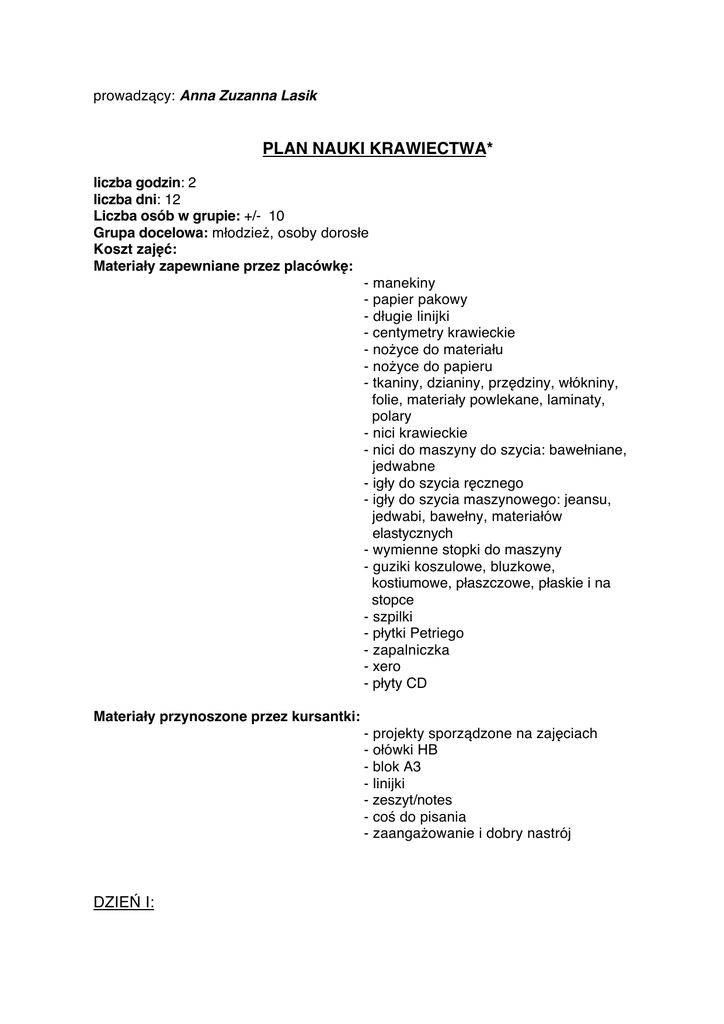 prowadzący: Anna Zuzanna Lasik PLAN NAUKI KRAWIECTWA* liczba godzin: 2 liczba dni: 12 Liczba osób w grupie: +/- 10 Grupa docelowa: młodzież, osoby dorosłe Koszt zajęć: Materiały zapewniane przez placówkę: - manekiny - papier pakowy - długie linijki - centymetry krawieckie - nożyce do materiału - nożyce do papieru - tkaniny, dzianiny, przędziny, włókniny, folie, materiały powlekane, laminaty, polary - nici krawieckie - nici do maszyny do szycia: bawełniane, jedwabne - igły do szycia ręcznego - igły do szycia maszynowego: jeansu, jedwabi, bawełny, materiałów elastycznych - wymienne stopki do maszyny - guziki koszulowe, bluzkowe, kostiumowe, płaszczowe, płaskie i na stopce - szpilki - płytki Petriego - zapalniczka - xero - płyty CD Materiały przynoszone przez kursantki: - projekty sporządzone na zajęciach - ołówki HB - blok A3 - linijki - zeszyt/notes - coś do pisania - zaangażowanie i dobry nastrój DZIEŃ I: Zapoznanie się ze słuchaczkami Przedstawienie planu zajęć Zapoznanie się z ludzką sylwetką: dziecko, młodzież, osoby dorosłe: kobieta, mężczyzna Ćwiczenia na szablonach DZIEŃ II i III: Podstawy materiałoznawstwa - rodzaje materiałów, włókien, splotów, rozpoznawanie tworzyw Zajęcia teoretyczne DZIEŃ IV i V: Sposoby projektowania ubiorów na szablonie- spódnica z koła, z półkola, spodnie, spódnico-spodnie, bluzki, marynarki, kurtki, płaszcze DZIEŃ VI: Kontynuacja zajęć z projektowania na szablonie Odwzorowanie projektów płaskich na materiale-wstęp do wykroju DZIEŃ VII: Zapoznanie kursantek z metodami upiannia i modelowania na manekinie różnego rodzaju tkanin DZIEŃ VIII: Upinanie na manekinie wykrojonych wcześniej elementów stroju, fastrygowanie DZIEŃ IX: Nauka szycia na maszynie- zapoznanie się z maszyną- sposoby nawlekania, nawijania, wyminy nici, igieł, stopki, bębenka Podstawowe informacje o ściegach, ich szerokościach, gęstości Ćwiczenia DZIEŃ X: Powtórka przedstawionego materiału Rozmowy w grupie, wyjaśnienia wszelkich pytań i nieścisłości Ćwiczenia w szyciu na maszynie Wstęp do szycia wybranej części garderoby DZIEŃ XI i XII: Szycie na maszynie wybranego przez kursantki elementu garderoby Zakończenie zajęć krótkim pokazem mody- udokumentowanie na CD * program autorski