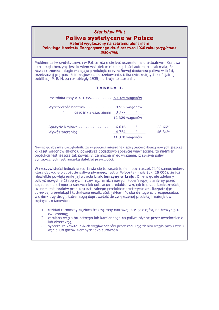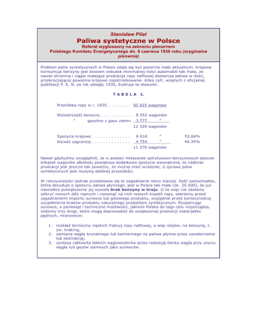 Stanisław Pilat Paliwa systetyczne w Polsce Referat wygłoszony na zebraniu plenarnem Polskiego Komitetu Energetycznego dn. 6 czerwca 1936 roku (oryginalna pisownia) Problem paliw syntetycznych w Polsce zdaje się być pozornie mało aktualnym. Krajowa konsumcja benzyny jest bowiem wskutek minimalnej ilości automobili tak mała, że nawet skromna i ciągle malejąca produkcja ropy naftowej dostarcza paliwa w ilości, przekraczającej poważnie krajowe zapotrzebowanie. Kilka cyfr, wziętych z oficjalnej publikacji P. E. N. za rok ubiegły 1935, ilustruje te stosunki. TABELA I. Przeróbka ropy w r. 1935. . . . . . . . . 50 925 wagonów Wytwórczość benzyny . . . . . . . . . . . " gazoliny z gazu ziemn. 8 552 wagonów 3 777 " 12 329 wagonów Spożycie krajowe . . . . . . . . . . . . . . 6 616 " 53.66% Wywóz zagranicę . . . . . . . . . . . . . . 4 754 " 46.34% 11 370 wagonów Nawet gdybyśmy uwzględnili, że w postaci mieszanek spirytusowo-benzynowych jeszcze kilkaset wagonów alkoholu powiększa dodatkowo spożycie wewnętrzne, to nadmiar produkcji jest jeszcze tak poważny, że można mieć wrażenie, iż sprawa paliw syntetycznych jest muzyką dalekiej przyszłości. W rzeczywistości jednak przedstawia się to zagadnienie nieco inaczej. Ilość samochodów, która decyduje o spożyciu paliwa płynnego, jest w Polsce tak mała (ok. 25 000), że już niewielkie powiększenie jej wywoła brak benzyny w kraju. O ile więc nie zdołamy odkryć nowych złóż ropnych i rozwinąć na nich nowych kopalń ropy, staniemy przed zagadnieniem importu surowca lub gotowego produktu, względnie przed koniecznością uzupełnienia braków produktu naturalnego produktem syntetycznym. Rozpatrując surowce, a poniekąd i techniczne możliwości, jakiemi Polska do tego celu rozporządza, widzimy trzy drogi, które mogą doprowadzić do zwiększonej produkcji materjałów pędnych, mianowicie: 1. 2. 3. rozkład termiczny ciężkich frakcyj ropy naftowej, a więc olejów, na benzynę, t. zw. kraking; zamiana węgla brunatnego lub kamiennego na paliwa płynne przez uwodornienie lub ekstrakcję; synteza całkowita lekkich węglowodorów przez redukcję tlenku węgla przy użyciu węgla lub gazów ziemnych jako surowców. Stanisław Pilat Paliwa systetyczne w Polsce Referat wygłoszony na zebraniu plenarnem cz. 2 Pierwsza metoda opiera się na produktach naftowych jako surowcu i ma tę niezaprzeczoną zaletę, że stanowi sposób fabrykacji w ostatnich 15 latach dokładnie opracowany i w dwóch naszych rafinerjach od kilku lat stosowany. Natomiast sprawa surowca do tego procesu poważnie ogranicza ilości, jakieby przy obecnym stanie produkcji ropy można tą metodą uzyskać. Z zestawień P. E. N. wynika, że mamy około 6 500 wag. rocznie olejów lekkich i smarowych, którebyśmy mogli przerobić przez kraking na około 3 000 wag. benzyny. Przyjmuję, że spożycie nafty świetlnej nie pozwala na użycie jej jako materjału wyjściowego do fabrykacji benzyny. Również nie zostanie zużyty na ten cel nadmiar parafiny, jako produktu zbyt drogiego. Jeśli chodzi o stronę techniczną tego procesu, to polega on w zasadzie na ogrzewaniu płynącego przez system rur surowca do temperatur zwykle około 450°, w których następuje rozpad większych cząstek na mniejsze. Rozróżniamy kraking w fazie płynnej lub parowej, zależnie od tego, czy przegrzewamy cięższe oleje pod ciśnieniem jako płyny, czy też przeprowadzamy je najpierw w stan pary, a następnie pary te przegrzewamy. Oba urządzenia krakingowe znajdujące się w Polsce, systemu Cross, mają łączną wydajność 15-20 wag. dziennie. Instalacje te są z powodu małego zapotrzebowania benzyny motorowej przeważnie nieczynne, co wynika z tego, że produkcja benzyny krakingowej wynosiła w r. 1935, według zestawień P. E. N., ogółem tylko 102 wagonów. Rozkład termiczny gazu ziemnego nie daje dotąd, mimo licznych prac w tym kierunku, rezultatów, któreby pozwalały spodziewać się, że na tej drodze będzie można większe ilości płynnego paliwa w razie potrzeby uzyskać. Doświadczenia prowadzone w ostatnich latach w licznych laboratoriach dadzą się ująć w ten sposób, że można wprawdzie działaniem wysokich temperatur (około 1 200 °C) otrzymać z gazu ziemnego, wzgl. z metanu, węglowodory płynne typu benzolu, jednak uzyskane wydajności (ok. 6%) są zbyt małe, a temperatury reakcji zbyt wysokie, aby móc na tej metodzie oprzeć fabrykację płynnego paliwa. W Polsce, gdzie dysponujemy praktycznie nieograniczonemi zasobami węgla i bardzo poważnemi ilościami gazu ziemnego, produkcja paliw syntetycznych z tych materiałów wyjściowych nie jest praktycznie ograniczona ilością surowca i może być wskutek tego dostosowana do zapotrzebowania. Istnieje zatem teoretyczna możliwość daleko idącej motoryzacji, opartej na własnych materjałach pędnych. Przeróbka węgla kamiennego lub brunatnego może być prowadzona albo przez ekstrakcję, albo przez uwodornienie, albo też drogą zupełnej syntezy z tlenku węgla i wodoru przez gaz wodny. Ekstrakcja węgla kamiennego w temperaturach bliskich do temp. rozkładu węgla, t. j. około 400° C, mieszaninami tetraliny i krezolu według pomysłu Pott'a i Brachego pozwala uzyskać z węgla około 80 % i więcej stałej substancji, wolnej zupełnie od popiołu. Ekstrakt ten, o konsystencji smoły, może być podobno użyty wprost jako paliwo w silnikach Diesela, a w każdym razie jest doskonałym materjałem do dalszej przeróbki przez uwodornienie. Ponieważ metoda ta jest stosunkowo nowa, więc nie mamy jeszcze technicznych danych z jej przebiegu, w każdym jednak razie należy przypuszczać, że będzie ona miała dla przeróbki węgla poważne znaczenie. Stanisław Pilat Paliwa systetyczne w Polsce Referat wygłoszony na zebraniu plenarnem cz.3 Porównanie składu chemicznego węgla kamiennego i brunatnego, teru węglowego, ropy naftowej z benzyną według tabeli II, wskazuje, ż