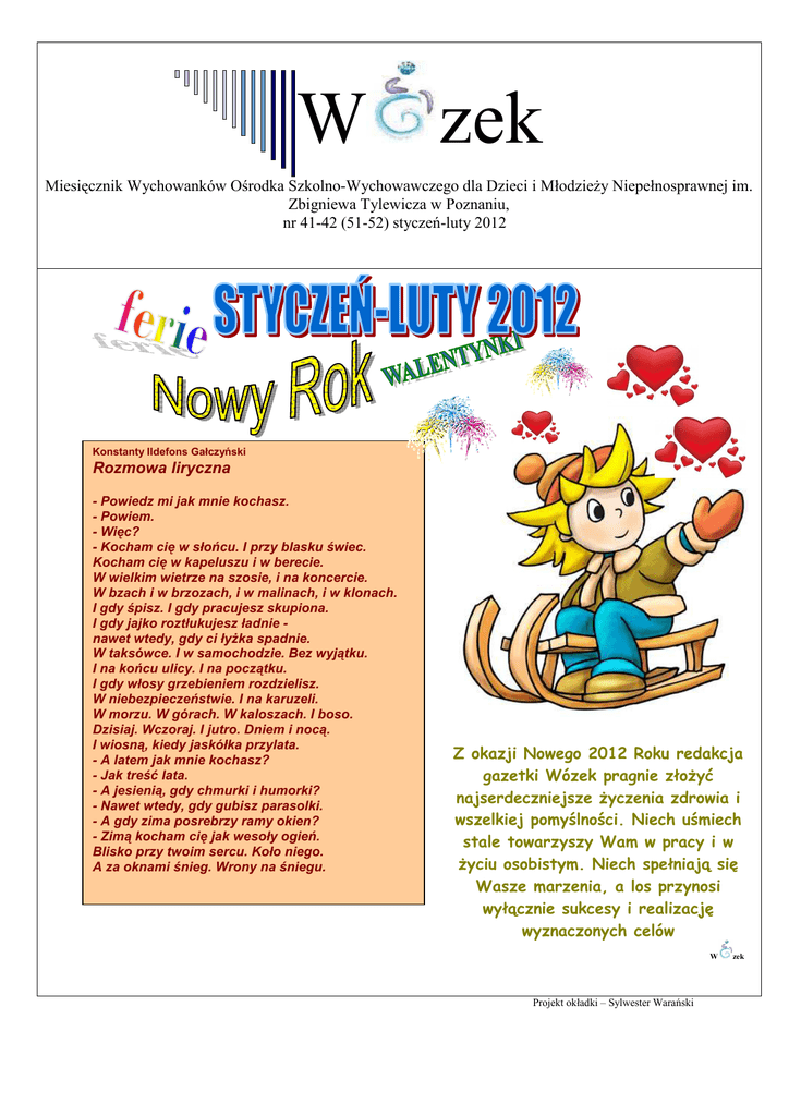 W zek Miesięcznik Wychowanków Ośrodka Szkolno-Wychowawczego dla Dzieci i MłodzieŜy Niepełnosprawnej im. Zbigniewa Tylewicza w Poznaniu, nr 41-42 (51-52) styczeń-luty 2012 Konstanty Ildefons Gałczyński Rozmowa liryczna - Powiedz mi jak mnie kochasz. - Powiem. - Więc? - Kocham cię w słońcu. I przy blasku świec. Kocham cię w kapeluszu i w berecie. W wielkim wietrze na szosie, i na koncercie. W bzach i w brzozach, i w malinach, i w klonach. I gdy śpisz. I gdy pracujesz skupiona. I gdy jajko roztłukujesz ładnie nawet wtedy, gdy ci łyŜka spadnie. W taksówce. I w samochodzie. Bez wyjątku. I na końcu ulicy. I na początku. I gdy włosy grzebieniem rozdzielisz. W niebezpieczeństwie. I na karuzeli. W morzu. W górach. W kaloszach. I boso. Dzisiaj. Wczoraj. I jutro. Dniem i nocą. I wiosną, kiedy jaskółka przylata. - A latem jak mnie kochasz? - Jak treść lata. - A jesienią, gdy chmurki i humorki? - Nawet wtedy, gdy gubisz parasolki. - A gdy zima posrebrzy ramy okien? - Zimą kocham cię jak wesoły ogień. Blisko przy twoim sercu. Koło niego. A za oknami śnieg. Wrony na śniegu. Z okazji Nowego 2012 Roku redakcja gazetki Wózek pragnie złoŜyć najserdeczniejsze Ŝyczenia zdrowia i wszelkiej pomyślności. Niech uśmiech stale towarzyszy Wam w pracy i w Ŝyciu osobistym. Niech spełniają się Wasze marzenia, a los przynosi wyłącznie sukcesy i realizację wyznaczonych celów W Projekt okładki – Sylwester Warański zek Międzynarodowe święto przypadające 1 stycznia kaŜdego roku (w kalendarzu gregoriańskim), w Polsce jest to dzień wolny od pracy. W powszechnie przyjętym zwyczaju obchodzenie święta naleŜy rozpocząć od otworzenia butelki szampana o północy z dnia 31 grudnia na 1 stycznia następnego roku. Dzień poprzedzający Nowy Rok nosi w polskiej tradycji miano Sylwestra. Zwyczaj rozpoczynania nowego roku od pierwszego dnia stycznia wprowadził w swej reformie kalendarzowej Gaius Iulius Caesar (Juliusz Cezar). Rzymianie czcili w ten dzień Janusa, boga bram, drzwi i początków. Wiele języków, w tym angielski i niemiecki przejęły właśnie od Janusa nazwę miesiąca styczeń (ang. January). Wcześniej Rzymianie nowy rok witali 1 marca, dlatego teŜ w wielu językach zapoŜyczone nazwy września, października, listopada i grudnia, czyli 9., 10., 11. i 12. miesiąca roku pochodzą od łacińskich liczebników septem, octo, novem, decem (7, 8, 9, 10). Pierwszym w historii rokiem rozpoczętym 1 stycznia był rok DCCVIII Ab Urbe Condita, tzn. 708 rok od załoŜenia Miasta (Rzymu), czyli wg obecnie stosowanej rachuby czasu 46 r. p.n.e. W Rosji i na Ukrainie, równieŜ w Polsce, prawosławni i grekokatolicy witają Nowy Rok 14 stycznia wg gregoriańskiego, co odpowiada 1 stycznia wg kalendarza juliańskiego, Wyznawcy obrządku wschodniego bawią się na noworocznych balach nocą 13/14 stycznia, zwanych "małankami", witając "Stary Nowy Rok". W Azji dzień Nowego Roku jest ruchomy (jest uŜywany tam bowiem kalendarz księŜycowy; liczący od dwunastu do trzynastu miesięcy), ale zazwyczaj obchodzony jest w styczniu albo w lutym. (na podstawie www.wikipedia.pl) W zek Święto wywodzi się z kultury anglosaskiej, ma ponad pięciowiekową tradycję, a święty Walenty patronuje mu od około XV wieku. Dlaczego w tym dniu, a patrona chorych na epilepsję i choroby umysłowe obrano także patronem zakochanych? Może dlatego, że stan uczuciowy zakochanych niezależnie od ilorazu inteligencji, płci i wieku chwilami przypomina umysłową chorobę? Być może ma też symboliczny związek z okresem godowym ptaków łączących się w pary, który na Wyspach Brytyjskich przypada na ten właśnie czas? Para gołębi przecież także stała się symbolem zakochanych. Walentynki w Polsce nie mają jeszcze swojej tradycji, powszechniej znane od lat 90-tych, napotkały silny opór części społeczeństwa niechętnie patrzącego na wdrażanie w polską kulturę obcych zwyczajów. Tym bardziej niechęć wzbudza skomercjalizowana forma, w której się je podaje w krajach anglosaskich i z czego wzorce zaczyna czerpać rodzimy przemysł. Niemniej sama idea Święta Zakochanych (a może kochających?) jest sympatyczna. Może tylko kolejnego zezowatego pluszaka z uczepionym plastikowym serduszkiem warto zamienić na urodziwy owoc czy jedną pąsową różę, a kiczowatą kartkę czy SMS'a zastąpić prawdziwą poezją? I chociaż wartości uniwersalne, jakimi są miłość i przyjaźń pielęgnować należy stale, bez szukania pretekstu dla słowa "kocham", dlaczego nie zaakceptować dnia okazywania uczuć? Wszak łakną ich wszyscy, niezależnie kto i w jakim dniu im patronuje. W zek 1. Odyseusz zrzucił z siebie Ŝebraczy strój i stanął w całej swojej okazałości przed przeraŜonymi zalotnikami. 2. Dedal potrafił róŜne rzeczy, więc pewnego dnia Ŝona Minosa urodziła dziecko. 3. Kreon sprawił Eteoklesowi huczny pogrzeb. 4. Jednym z filozofów greckich był Demokryt z Abwery. 5. Chłop wolał iść gdzieś pod drzewo, byle nie robić u pana. 6. Chłop był wyciskany przez pana. 7. Na obrazie Chełmońskiego widzimy chłopa i woły, stoją bosi, ubrani w siermięgi i przepasani krajkami. 8. Podczas burzy babcia wystawiła święty obraz, aby piorun uderzył w niego, a nie w dom. 9. Gospodyni doiła krowę i ryczała wniebogłosy. 10. ZamoŜni chłopi nigdy nie wychodzili za mąŜ za biednych, tylko za siebie. 11. Dzieci nie miały od dawna w ustach bochenka chleba. 12. JeŜeli człowieka porazi prąd elektryczny, naleŜy go wyciągnąć z kontaktu i zakopać w ziemi. W zek – Miesięcznik Wychowanków Ośrodka Szkolno-Wychowawczego dla Dzieci i MłodzieŜy Niepełnosprawnej im. Zbigniewa Tylewicza w Poznaniu. Gazetka ukazuje się od 2005r. Redaguje zespół w składzie: Katarzyna Szymankiewicz, Karolina Jończyk, Angelika Kucharzak, Marek Landzwojczak, Aleksandra Tonder, Izabela Czoszyk. Opiekun: mgr Sylwester Warański (od 2007 roku, w latach 2005-2007 mgr 