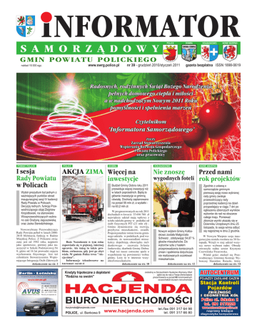 I NFORMATOR S A M O R Z Ą D O W Y POLICE DOBRA KOŁBASKOWO NOWE WARPNO GMIN POWIATU POLICKIEGO www.swrg.police.pl nakład 16 000 egz. nr 39 - grudzień 2010/styczeń 2011 gazeta bezpłatna ISSN 1898-0619 Radosnych, rodzinnych Świąt Bożego Narodzenia pełnych domowego ciepła i miłości a w nadchodzącym Nowym 2011 Roku pomyślności i spełnienia marzeń Czytelnikom "Informatora Samorządowego" życzy Zarząd Stowarzyszenia Wspierania Rozwoju Gospodarczego Powiatu Polickiego oraz pracownicy POWIAT POLICKI POLICE DOBRA KOŁBASKOWO NOWE WARPNO I sesja AKCJA ZIMA Więcej na Nie znoszę Przed nami wygodnych foteli rok projektów Rady Powiatu inwestycje Budżet Gminy Dobra roku 2011 Zgodnie z ustawą o w Policach przewiduje więcej inwestycji niż samorządzie gminnym Wybór prezydium był jednym z ważniejszych punktów obrad inauguracyjnej sesji IV kadencji Rady Powiatu w Policach. Decyzją radnych, funkcję Przewodniczącego objął Zbigniew Kropidłowski, na stanowisko Wiceprzewodniczących wybrano zaś Grażynę Jaguszewską oraz Jacka Sieredzińskiego. Nowowybrany Przewodniczący Rady Powiatu pełnił w latach 20062010 bliźniaczą funkcję w Radzie Miejskiej Police. Z Policami związany jest od 1982 roku, najpierw jako sportowiec, później jako nauczyciel w Szkole Podstawowej Nr 8, gdzie od 16 lat prowadzi zajęcia wychowania fizycznego. Jest też członkiem Stowarzyszenia Wspierającego Integrację Osób Zdrowych dokończenie na str. 2 w latach poprzednich. Będą to głównie inwestycje w gminną oświatę. Dochody zaplanowano na ponad 55 mln zł, a wydatki na 63,2 mln zł. Boże Narodzenie w tym roku zapowiada się w pięknej, śnieżnej oprawie. Ale śnieg to także problem, zwłaszcza, gdy jest go zbyt wiele. W gminie Police trwa "Akcja zima". Informacje teleadresowe na ten temat - na str. 6 W prognozowanych na rok 2011 dochodach w kwocie 55 696 708 zł największy udział mają wpływy z tytułu udziału gminy w podatku od osób fizycznych PIT (21 mln zł) Gmina dynamicznie się rozwija, przybywa mieszkańców, osiedli. Proporcjonalnie rośnie kwota gminnego udziału w podatkach, pod warunkiem, że nowoosiedleni mieszkańcy dopełniają obowiązku meldunkowego - zauważa Jolanta Jankowska, skarbnik Gminy Dobra. - Stąd też nasze coroczne apele o wypełnianie tej powinności wobec gminy. Leży to w interesie wszystkich mieszkańców. dokończenie na str. 10 Nowym wójtem Gminy Kołbaskowo została Małgorzata Schwarz , zdobywając 54,87 % głosów mieszkańców. Do wyborów szła z hasłem przeprowadzenia koniecznych zmian i spełnienia dotychczas nie realizowanych oczekiwań mieszkańców. dokończenie na str. 12 pierwszą sesję nowo wybranej rady gminy zwołuje przewodniczący rady poprzedniej kadencji na dzień przypadający w ciągu 7 dni po ogłoszeniu zbiorczych wyników wyborów do rad na obszarze całego kraju. Ponieważ zbiorcze wyniki ukazały się w Dzienniku Urzędowym dniu 25 listopada, to sesja winna odbyć się najpóźniej w dniu 2 grudnia. W Nowym Warpnie sesja inauguracyjna została zwołana na 30 listopada. Wzięli w niej udział wszyscy nowo wybrani radni. Obrady otworzyła radna senior Krystyna Czerwińska-Twarowska. Wśród gości znalazł się Przewodniczący Gminnej Komisji Wyborczej Stanisław Retecki, który dokończenie na str. 14 POJAZDY ZASILANE GAZEM POWIAT POLICKI str. 2 Radosnych i rodzinnych Świąt Bożego Narodzenia i wszelkiej pomyślności Mieszkańcom Powiatu Polickiego życzy Starosta Policki Leszek Guździoł POWIAT POLICKI Starostwo Powiatowe w Policach ul. Tanowska 8 72-010 Police tel. 091 4328 100 fax 091 317 89 00 e-mail: [email protected] www.powiat.policki.pl Zarząd Powiatu w Policach Leszek Guździoł - starosta Izabela Wesołowska-Kośmider wicestarosta Jacek Stachyra - członek zarządu Sekretariat pokój nr 105 - 091 4328 118 Zbigniew Kropidłowski Przewodniczący Rady Powiatu w Policach Biuro Rady Powiatu pokój nr 202 - 091 4328 127 Mirosław Antoniewicz Sekretarz Powiatu Polickiego pokój nr 108, tel. 091 4328 120 Jurata Dettlaff Skarbnik Powiatu Polickiego pokój nr 209, tel. 091 4328 125 Jolanta Skotnicka Naczelnik Wydziału Administracji i Organizacji pokój nr 103 - 091 4328 112 Kancelaria - pokój nr 18 Tel. 091 4328 100 Szczepan Sawiński Naczelnik Wydziału Architektury i Budownictwa pokój nr 225 - 091 4328 117 Beata Kropidłowska Naczelnik Wydziału Edukacji i Kultury pokój nr 220 - 091 4328 147 Teresa Kalinowska Naczelnik Wydziału Finansów i Budżetu pokój nr 210 - 091 4328 137 Tadeusz Łukasiuk p.o. Geodety Powiatowego - Naczelnika Wydziału Geodezji i Gospodarki Nieruchomościami Police ul. Kresowa 33/34 Pokój nr B17 - 091 4247 997 Ryszard Wójcik Naczelnik Wydziału Komunikacji, Transportu i Dróg pokój nr 2 - 091 4328 104 Krystyna Soroczyńska Naczelnik Wydziału Ochrony Środowiska i Rolnictwa pokój nr 221 - 091 4328 141 Magdalena Kotowska Naczelnik Wydziału Planowania i Rozwoju pokój nr 213 - 091 4328 130 Tomasz Przerwa Naczelnik Wydziału Promocji i Informacji pokój nr 212 - 091 4328 146 Adam Sadowski Kierownik Referatu Informatyki pokój nr 109 - 091 4328 113 Edyta Rudecka Kierownik Referatu Spraw Społecznych i Obywatelskich Pokój nr 16 i 16A - 091 4328 143 Andrzej Podlecki Kierownik Biura Bezpieczeństwa i Porządku Publicznego pokój nr 205 - 091 4328 133 Elżbieta Jaźwińska Powiatowy Rzecznik Konsumentów Pokój nr 106 - 091 432 81 06 Przewodniczący Rady Powiatu Zbigniew Kropidłowski I sesja Rady Powiatu w Policach dokończenie ze str. 1 i Niepełnosprawnych „Warto być” oraz Lokalnej Grupy Działania „Dobre gminy”. Edukacja to również domena Grażyny Jaguszewskiej, która całe swoje życie zawodowe poświeciła nauczaniu dzieci i młodzieży. Będąca już na emeryturze nauczycielka od lat jest również niezwykle zaangażowana społecznie - jest przewodniczącą Parafialnego Zespołu Caritas w Nowym Warpnie oraz współzałożycielką Stowarzyszenia „RAZEM”, którego