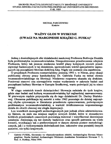 SBORNiK PRĄCI FILOZOFICKE FAKULTY BRNENSKE UNIVERZITY STUDIA MINORA FACULTATIS PHILOSOPHICAE UNIVERSITATIS BRUNENSIS E 40,1995 MICHAŁ PARCZEWSKI Kraków WAŻNY GŁOS W DYSKUSJI (UWAGI NA MARGINESIE KSIĄŻKI G. FUSKA)* Jedną z donioślejszych sfer działalności naukowej Profesora Bofivoja Dostała była problematyka wczesnosłowiańska. Niespodziewane przedwczesne odejście Profesora, który tak jeszcze niedawno kreślił plany kolejnych swoich przed sięwzięć badawczych w tej dziedzinie, spowodowało wśród specjalistów zajmu jących się początkami Słowian dotkliwą lukę. Nigdy nie zostanie ona zapełniona. O projektach Profesora rozmawialiśmy jesienią 1993 r. w Nitrze, przy okazji publicznej obrony pracy kandydackiej Dr. Gabriela Fuska na temat okresu wczesnosłowiańskiego na Słowacji. Niedawno rozprawa ukazała się drukiem. Ponieważ stanowi ona niewątpliwie ważne wydarzenie w zakresie badań nad początkami kultury Słowian w Europie Środkowej, warto poświęcić jej tu nieco uwagi. W ciągu ostatnich trzech dziesięcioleci Słowacja należała do tych krajów, gdzie stan badań nad kulturą wczesnosłowiańską był najbardziej zaawansowany. W pierwszym rzędzie przyczyniła się do tego działalność Dr. Dariny Bialekowej. Obszerna publikacja tej autorki z roku 1962 pozostaje do dzisiaj najczęś ciej chyba cytowanym w literaturze przedmiotu opracowaniem, poświęconym problematyce wczesnosłowiańskiej, a wartość źródłoznawcza wspomnianego dzieła do chwili obecnej nie uległa deprecjacji. Los wszelkich monografii archeologicznych jest jednak silnie zdeterminowa ny faktem, że stale ma miejsce napływ nowych źródeł, które w stosunkowo krótkich przedziałach czasowych pozwalają testować i weryfikować dawniejsze ustalenia. Zmieniają się też metody badawcze oraz sposób patrzenia na wiele kwestii, wynikający tak z preferowanych w danym okresie postaw metodologi cznych, jak i z wykorzystania doświadczeń (tzn. sukcesów oraz porażek) innych autorów, nie tylko krajowych. Gabriel FUSEK, Slovensko vo vćasnoslovanskom obdobl, Archaeologica Slovaca Monographiae. Studia Instituti Archaeologici Nitriensis Academiae Scientiarum Slovacae T. 3, Red. A. Ruttkay, Nitra 1994. 48 MICHAŁ PARCZEWSKI Spośród słowackich badaczy młodszego pokolenia Dr. Gabriel Fusek — uczeń Dr. Dariny Bialekowej — jest niewątpliwie najlepiej przygotowany do tego, aby po wspomnianych trzydziestu latach przedstawić własną wizję począt ków osadnictwa wczesnosłowiańskiego na Słowacji. Ma on na swoim koncie kilka publikacji na ten temat, a także materiały uzyskane podczas badań wyko paliskowych, w których uczestniczył (Chl'aba, Nitra - Mikov dvor, Nitra Hrad, Povaźany). Trwające od pewnego czasu studia G. Fuska nad omawianą problematyką zaowocowały obszernym opracowaniem, stanowiącym przedmiot niniejszej wypowiedzi. Książka liczy 384 strony druku, w tym zawiera się tekst narracyjny (s. 7152), katalog znalezisk (s. 153-284), bibliografia (s. 285-302), streszczenie wjęz. niemieckim (s. 303-313), a także część ilustracyjna: tablice I-LXIX (s. 315-383), rozmieszczone w tekście 74 ryciny, 5 mapek i (na osobnej wkład ce) 4 tabele z diagramami. Nie ukrywam, że zarówno tematyka pracy, jak i sposób podejścia Autora do jej realizacji są mi bardzo bliskie. Z życzliwym zainteresowaniem śledzę od lat rozwój naukowy G. Fuska i z satysfakcją stwierdzam, że mamy w jego osobie do czynienia z doskonałym specjalistą o szeroko uznawanych kwalifikacjach. Wyprzedzając tutaj dalsze szczegółowe uwagi na temat tej monografii — w tym zresztą również uwagi krytyczne — chciałbym podkreślić, że uważam pracę G. Fuska za dzieło wybitne o wysokich walorach naukowych. Pod niektó rymi względami, zwłaszcza w zakresie metodycznym (nowe podejście do anali zy formy naczyń ceramicznych, wsparte wyliczeniami opartymi na technice komputerowej), omawiana pozycja ma charakter pionierski. Leży przed nami owoc żmudnej, solidnej i konsekwentnej pracy, opartej w sposób bardzo konkretny na istniejącej bazie źródłowej. Autor włożył wiele wysiłku w zebranie materiału zabytkowego, co udało mu się dokonać w sposób kompletny. Znakomita większość sformułowanych przez G. Fuska wniosków wynika ze skrupulatnie i po nowatorsku przeprowadzonej weryfikacji oraz ana lizy źródeł. Na specjalne podkreślenie zasługuje, że Autor w swoich wywodach stara się ani na chwilę nie oddalać od tego poziomu wiarygodności, który może być zagwarantowany tylko przez stały i bliski kontakt z konkretnym materiałem zabytkowym. Wyrazem wielkiej dbałości o uzyskanie solidnej bazy źródłowej jest część katalogowa pracy, skonstruowana w sposób przemyślany i logiczny. Autor sta rał się poznać z autopsji, zweryfikować i opisać wszystkie aktualnie dostępne materiały. Bardzo wysoką wartość ma część ilustracyjna, zwłaszcza rysunki ce ramiki, które według ujednoliconych kryteriów wykonał sam Autor. Zgromad zony i zareprezentowany w ten sposób materiał zabytkowy można traktować z pełnym zaufaniem. Jedyne moje wątpliwości dotyczą obiektu rozkopanego w Źilinie. Dzięki Dr. Fuskowi miałem okazję zapoznać się z autopsji ze znalezioną tam ceramiką. Otóż nie jestem w 100% przekonany, że mamy do czynienia z materiałem wcze- 49 WAŻNY GŁOS W DYSKUSJI (UWAGI NA MARGINESIE KSIĄŻKI G. FUSKA) snosłowiańskim, wyczuwam w nim jakąś „obcość". Myślę, że zbiór z Źiliny powinno obejrzeć więcej fachowców (zwłaszcza specjalistów od starszych epok), aby wykluczyć możliwość złej interpretacji tego odkrycia. W najogólniejszej zasadzie konstrukcji pracy odzwierciedlają się wyraźnie dwa pierwsze etapy klasycznego dla archeologicznych monografii źródłowych wnioskowania. Dokonano zatem zestawienia wszystkich dostępnych Autorowi materiałów wczesnosłowiańskich ze Słowacji, zamieszczając je w ramach części 6.