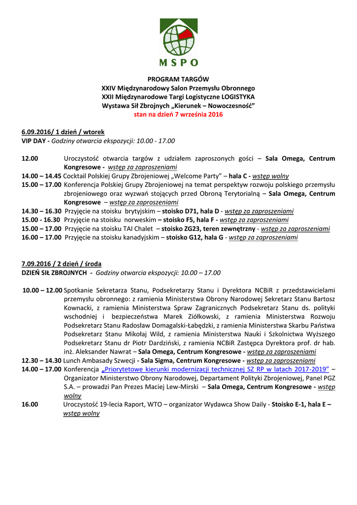 PROGRAM TARGÓW XXIV Międzynarodowy Salon Przemysłu Obronnego XXII Międzynarodowe Targi Logistyczne LOGISTYKA Wystawa Sił Zbrojnych „Kierunek – Nowoczesność” stan na dzień 7 września 2016 6.09.2016/ 1 dzień / wtorek VIP DAY - Godziny otwarcia ekspozycji: 10.00 - 17.00 12.00 Uroczystość otwarcia targów z udziałem zaproszonych gości – Sala Omega, Centrum Kongresowe - wstęp za zaproszeniami 14.00 – 14.45 Cocktail Polskiej Grupy Zbrojeniowej „Welcome Party” – hala C - wstęp wolny 15.00 – 17.00 Konferencja Polskiej Grupy Zbrojeniowej na temat perspektyw rozwoju polskiego przemysłu zbrojeniowego oraz wyzwań stojących przed Obroną Terytorialną – Sala Omega, Centrum Kongresowe – wstęp za zaproszeniami 14.30 – 16.30 Przyjęcie na stoisku brytyjskim – stoisko D71, hala D - wstęp za zaproszeniami 15.00 - 16.30 Przyjęcie na stoisku norweskim – stoisko F5, hala F - wstęp za zaproszeniami 15.00 – 17.00 Przyjęcie na stoisku TAI Chalet – stoisko ZG23, teren zewnętrzny - wstęp za zaproszeniami 16.00 – 17.00 Przyjęcie na stoisku kanadyjskim – stoisko G12, hala G - wstęp za zaproszeniami 7.09.2016 / 2 dzień / środa DZIEŃ SIŁ ZBROJNYCH - Godziny otwarcia ekspozycji: 10.00 – 17.00 10.00 – 12.00 Spotkanie Sekretarza Stanu, Podsekretarzy Stanu i Dyrektora NCBiR z przedstawicielami przemysłu obronnego: z ramienia Ministerstwa Obrony Narodowej Sekretarz Stanu Bartosz Kownacki, z ramienia Ministerstwa Spraw Zagranicznych Podsekretarz Stanu ds. polityki wschodniej i bezpieczeństwa Marek Ziółkowski, z ramienia Ministerstwa Rozwoju Podsekretarz Stanu Radosław Domagalski-Łabędzki, z ramienia Ministerstwa Skarbu Państwa Podsekretarz Stanu Mikołaj Wild, z ramienia Ministerstwa Nauki i Szkolnictwa Wyższego Podsekretarz Stanu dr Piotr Dardziński, z ramienia NCBiR Zastępca Dyrektora prof. dr hab. inż. Aleksander Nawrat – Sala Omega, Centrum Kongresowe - wstęp za zaproszeniami 12.30 – 14.30 Lunch Ambasady Szwecji - Sala Sigma, Centrum Kongresowe - wstęp za zaproszeniami 14.00 – 17.00 Konferencja „Priorytetowe kierunki modernizacji technicznej SZ RP w latach 2017-2019” – Organizator Ministerstwo Obrony Narodowej, Departament Polityki Zbrojeniowej, Panel PGZ S.A. – prowadzi Pan Prezes Maciej Lew-Mirski – Sala Omega, Centrum Kongresowe - wstęp wolny 16.00 Uroczystość 19-lecia Raport, WTO – organizator Wydawca Show Daily - Stoisko E-1, hala E – wstęp wolny 8.09.2016 / 3 dzień / czwartek DZIEŃ SŁUŻB PODLEGŁYCH MSWiA - Godziny otwarcia ekspozycji: 10.00 – 17.00 Wizyta Attache wojskowych akredytowanych w Polsce 10.00 – 13.00 Ogólnopolska Konferencja Naukowa pt. Międzynarodowa współpraca gospodarczo-obronna – organizator INP UJK w Kielcach, Targi Kielce S.A., Warszawska Szkoła Zarządzania, WSEPiNM w Kielcach, WSEiI w Lublinie, Instytut Techniczny Wojsk Lotniczych, Polskie Lobby Przemysłowe, Polska Agencja Przemysłowo-Obronna – Sala G2, Hala G- wstęp za zaproszeniami 11.00 – 13.30 IV Konferencja „Biznes z Wojskiem to pewne pieniądze” – Organizator: Inspektorat Wsparcia Sił Zbrojnych, Fundacja Polskie Forum Bezpieczeństwa, Altair Sp. z o.o., Targi Kielce- Sala Kappa, Centrum Kongresowe - wstęp za zaproszeniami 11.30 Pokaz Straży Granicznej m. in. Orkiestry Reprezentacyjnej - teren zewnętrzny przy hali A wstęp wolny 12.00 Pokaz tresury psów służbowych w policji – teren zewnętrzny przy hali A - wstęp wolny 12.30 Pokaz sprawności jednostek ratowniczych Państwowej Straży Pożarnej przygotowany przez Komendę Miejską PSP w Kielcach – teren zewnętrzny przy hali A - wstęp wolny 13.30 - 14.00 Pokaz "HERTZ SYSTEMS - ochrona obszaru przed penetracją BSL, zdalne wyłączenie obcego drona znajdującego się w locie" – organizator Hertz Systems - teren zewnętrzny przy hali A wstęp wolny 9.09.2016 / 4 dzień / piątek DZIEŃ DEFENDERA - Godziny otwarcia ekspozycji: 10.00 - 15.00 Wizyta Attache akredytowanych w Polsce 10.00 – 13.00 Debata nt. „Bezpieczeństwo Polski w świetle Planu na rzecz Odpowiedzialnego Rozwoju” z udziałem Wicepremiera Mateusza Morawieckiego, Sekretarza Stanu MON Bartosza Kownackiego Ministra Obrony norwegii Mortena Tillera - organizator Gazeta Polska - Sala Lambda, Centrum Kongresowe - wstęp wolny 13.00 – 14.00 Uroczystość wręczenia Nagrody Prezydenta RP, nagród DEFENDER, Wyróżnień Specjalnych: Ministra Obrony Narodowej oraz innych resortów, Nagrody Komendanta Głównego Policji, Komendanta Głównego PSP, Komendanta Głównego Straży Granicznej, Szefa Inspektoratu Wsparcia Sił Zbrojnych, Dowódcy Generalnego Rodzajów Sił Zbrojnych oraz dla Attache Wojskowych za udział w zawodach strzeleckich - Sala Omega, Centrum Kongresowe - wstęp wolny Prezentacje, seminaria, wydarzenia towarzyszące 6.09.2016, wtorek 10.00 – 11.00 Konferencja prasowa nt. „Polski Patriot: Niezawodna obrona i partnerstwo” - organizator Raytheon – Sala E-1, hala E - wstęp za zaproszeniami 10:00 - 13:00 Konkurs strzelecki IBCOL CUP – organizator IBCOL Polska – stoisko D-2, Hala D - wstęp wolny 13:00 Panel dyskusyjny "13-ta z Polską Zbrojną"- organizator Polska Zbrojna – stoisko F-22, hala F - wstęp wolny 13.15 Konkurs strzelecki IBCOL CUP – wręczenie pucharów – organizator IBCOL Polska – stoisko D2, Hala D - wstęp wolny 14.00 – 15.00 #MakeinPoland Briefing prasowy Airbus Group z udziałem Airbus Group a także kadry menadżerskiej podmiotów korzystających z rosnącej obecności Airbus Group w Polsce – Małe Biuro Prasowe, Centrum Kongresowe - wstęp wolny 15.00 – 15.45 Konferencja prasowa nt. „Prezentacja statusu programu uzbrojonego śmigłowca BLACK HAWK i jego międzynarodowych perspektyw rynkowych”- organizator Lockheed Martin Corporation – Sala E-1, hala E - wstęp wolny 16:00 – 17:00 Briefing techniczny Śmigłowce W-3PL Głuszec i AW149, stoisko zewnętrzne Leonardo ZF-8 – przed halą F vis-à-vis Centrum Kongresowe