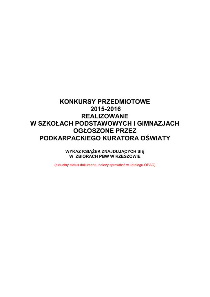 KONKURSY PRZEDMIOTOWE 2015-2016 REALIZOWANE W SZKOŁACH PODSTAWOWYCH I GIMNAZJACH OGŁOSZONE PRZEZ PODKARPACKIEGO KURATORA OŚWIATY WYKAZ KSIĄŻEK ZNAJDUJĄCYCH SIĘ W ZBIORACH PBW W RZESZOWIE (aktualny status dokumentu należy sprawdzić w katalogu OPAC) SZKOŁA PODSTAWOWA MATEMATYKA Podręczniki, zbiory zadań i zeszyty ćwiczeń z matematyki zatwierdzone przez MEN i zgodne z NPP. Literatura 1. Z. Bobiński, P. Nodzyński, M. Uscki, Koło matematyczne w szkole podstawowej; Aksjomat, Toruń, 2008 Sygn. WypRz 240930 2. M. Rosół, Konkursy matematyczne dla szkoły podstawowej: Aksjomat, Toruń, 2008 Sygn. WypRz 234253 PRZYRODA Podręczniki, zeszyty ćwiczeń do przyrody dla uczniów szkół podstawowych dopuszczone do użytku szkolnego przez ministra właściwego do spraw oświaty i wychowania Atlasy przyrodnicze: Np.: Ciało człowieka / [red. Paulina Kędziora ; tł. Agnieszka Osojca]. - Warszawa : "Arti" Artur Rogala, Mariusz Rogala, 2011. Sygn. WypRz 239595 Nowy atlas przyroda "Świat wokół nas" / red., oprac. merytoryczne., graf. i komput. Krystian Chariza [i in.]. - Wyd. 3. - Warszawa : "Nowa Era", 2012 Sygn. WypRz 23948 (uwaga: w katalogu OPAC można szukać poprzesz hasła przedmiotowe: atlasy roślin, atlasy zwierząt) oraz z listy: Ekologia : atlas ilustrowany / [Dorota Kokurewicz]. - Wyd. 3. - Wrocław : "Europa", 2010 Sygn. WypRz 236921 Nasz świat : ciało człowieka / [red. Anna Skrok ; tł. Agnieszka Gołębiowska]. Suchy Las : "Twoje Książki", [2012] Sygn. WypRz 240881 Puls życia 2 : podręcznik do biologii dla gimnazjum / Małgorzata Jefimow. Wyd.4. - Warszawa : "Nowa Era", 2012. Sygn. WypRz 239494 HISTORIA Atlas historyczny : od starożytności do współczesności : szkoła podstawowa / red. i oprac. Izabela Hajkiewicz [i in.]. - Wyd. 2. - Warszawa : "Nowa Era", 2013. Wyd. z 2012 Sygn. WypRz 239488 Ilustrowany atlas historii Polski / red. Witold Sienkiewicz. - Warszawa : "Demart", 2006. Sygn. CzytR 229711 Szkolny słownik historyczny / Jerzy Pilikowski. - Kraków : "Zielona Sowa", 2001. Wyd. z 1999 Sygn. CzytR 222947 Terminy i pojęcia historyczne/ Bogdan Snoch. -Warszawa : Wydawnictwa Szkolne i Pedagogiczne, 1990 Sygn. CzytR 212115; WypRz 212117; WypRz 212116; WypRz 212118 Historia : vademecum : egzamin gimnazjalny 2012 / Edyta Pustuła, Renata Antosik. - Gdynia : "Operon", 2011. Wyd. z 2010 Sygn. WypRz 235951 Od niepodległości do niepodległości : historia Polski 1918-1989 / Adam Dziurok [i in.]. - Warszawa : Instytut Pamięci Narodowej. Komisja Ścigania Zbrodni przeciwko Narodowi Polskiemu, 2010. - s. 9-102, s. 103-204, s.205-492 Wyd. z 2010 Sygn. WypRz 236563 Wyd. z 2011 Sygn. WypRz 239306 JĘZYK POLSKI Lektury ETAP I Hanna Ożogowska, Dziewczyna i chłopak, czyli heca na 14 fajerek, audiobook Edith Nesbit, Pociągi jadą do taty (książka znana także pod tytułem Przygoda przyjeżdża pociągiem), Skrzat, 2009 ETAP II Joanna Chmielewska, Nawiedzony dom, Olesiejczuk, 2015 WypRz 170025 (wyd. 1979), 233378 (wyd. 2008) ETAP III Zbigniew Nienacki, Pan Samochodzik i templariusze, Siedmioróg, 2012 WypRz 243906 Adam Bahdaj, Wakacje z duchami, Literatura, 2014 WypRz 243913 Katarzyna Majgier, Tajemnice starego pałacu. Duch z Niewiadomic, Nasza Księgarnia, 2014 JĘZYK ANGIELSKI Podręczniki, repetytoria oraz obrazkowe słowniki tematyczne An illustrated history of Britain / David McDowall. - 22nd impr. - Harlow : "Longman", 2008. CzytR 235529 Harlow : Longman, 2004. WypRz 242702 WypRz 242703 Angielski i francuski słownik obrazkowy / Jean-Claude Corbeil, Ariane Archambault. Warszawa : "Alfa", 1990. CzytR 211467 English Adventure : słownik obrazkowy. - Harlow : Pearson Education, 2007. WypRz 234285 English grammar in use : a self-study reference and practice book for intermediate students of English : with answers / Raymond Murphy. - 3rd ed. - Cambridge : Cambridge University Press, 2004. WypRz 512 DT English grammar in use : a self-study reference and practice book for intermediate students with answers / Raymond Murphy. - Wyd. 2. - Cambridge : Cambridge University Press, 1994. WypRz 226966 Essential Grammar in Use : a self-study reference and practice book for elementary students of English : with answers / Raymond Murphy. - 3rd ed., reprint. - Cambridge : Cambridge University Press, 2007. WypRz 232746 English vocabulary in use : advanced / Michael McCarthy, Felicity O`Dell. - 1st ed., 8th print. - Cambridge : Cambridge University Press, 2006. WypRz 230222 English vocabulary in use : elementary : with answers / Michael McCarthy, Felicity O`Dell. - Cambridge : Cambridge University Press, 2006. WypRz 230219 English vocabulary in use : pre-intermediate & intermediate : 100 units of vocabulary reference and practice, self-study and classroom use / Stuart Redman. - 2nd ed., 9th print. - Cambridge : Cambridge University Press, 2006. WypRz 230220 English vocabulary in use : upper-intermediate / Michael McCarthy, Felicity O`Dell. 2nd ed., 9th print. - Cambridge : Cambridge University Press, 2005. WypRz 230221 Słownik angielsko-polski : 1351 ilustrowanych słówek dla dzieci i młodzieży / [il. Giuseppe Donghi, tekst LeeAnn Bortolussi ; oprac. red. Krystyna Koziorowska]. Warszawa : "Wilga", cop. 1995. WypRz 234286 Test your english vocabulary in use : pre-intermediate and intermediate / Stuart Redman, Ruth Gairns. WypRz 243911 Wielki słownik obrazkowy polsko-angielski / [aut. il. Susanna Addario i in. ; tł. Karolina Wojtkowska i in.] - Warszawa : "Buchmann", cop. 2008. WypRz 236570 Inne pozycje dostępne w bibliotece Angielski : repetytorium leksykalno-tematyczne / [Joanna Szyke, Berenika Wilczyńska]. - Warszawa : "Edgard", 2009. WypRz 237106 Discover English 1: książka ucznia / Izabella, Hearn, Jayne Wildman ; konsult. Mariola Bogucka. - Warszawa: Pearson Central Europe, 2012. WypRz 242287 Evolution 1 : książka ucznia / Nick Beare. - Warszawa : Macmillan Polska, 2012. WypRz 239471 Evolution 2 : książka ucznia / Nick Beare. - Warszawa : Macmillan Polska, 2