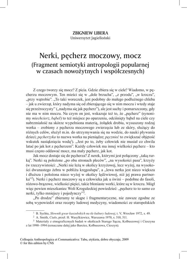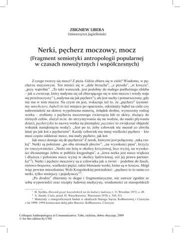 Zbigniew Libera Uniwersytet Jagielloński Nerki, pęcherz moczowy, mocz (Fragment semiotyki antropologii popularnej w czasach nowożytnych i współczesnych) Z czego tworzy się mocz? Z picia. Gdzie zbiera się w ciele? Wiadomo, w pęcherzu moczowym. Ten mieści się w „dole brzucha”, „z przodu”, „w kroczu”, „przy wątrobie”. „To taki woreczek, jest podobny do małego podłużnego chleba – jak u zwierząt, który nadyma się od zbierającego się w nim moczu i wtedy staje się przeźroczysty” („nadyma się jak pęcherz”), ale jest suchy i pomarszczony, gdy nie ma w nim moczu. Na czym on jest, wskazuje też to, że „pęcherz” (synonimy miechcierz, bąbel) to też miejsce po oparzeniu, odciśnięty bąbel na ciele czy nabrzmiałość na skórze wypełniona materią, żołądek drobiu, wysuszony rodzaj worka – zrobiony z pęcherza moczowego zwierzęcia lub ze skóry, służący do różnych celów, służył m.in. do utrzymywania się na wodzie, do nauki pływania dzieci; pęcherzyka to nazwa worka na pieniądze; pęcznieć to zwiększać objętość wskutek nasiąknięcia wodą1). „Jest po to, żeby człowiek nie musiał co chwila latać po jak kot z pęcherzem”. Każdy człowiek ma innej wielkości pęcherz – kto musi często oddawać mocz, ma mały pęcherz, jak kot. Jak mocz dostaje się do pęcherza? Z nerek, którymi jest połączony „taką rurką”. Nerki są położone „po obu stronach pleców”, „na wysokości pasa”, krzyży (w rzeczywistości: „Nerki nie leżą w okolicy krzyżowej, lecz wyżej, na wysokości dwunastego żebra w pobliżu kręgosłupa”, a „lewa nerka jest nieco większa i dłuższa i położona nieco wyżej w okolicy lędźwiowej, niż jej prawa partnerka”2). Nerki i pęcherz moczowy są u człowieka jak u świni – podobne do fasoli, różowo-brązowe, wielkości pięści, takie błoniaste worki, które są w kroczu. Mógł więc pewien mieszkaniec Woli Kroguleckiej powiedzieć: „pęcherz to to samo co nerki, tylko mniejszy i pojedynczy”3. „Po drodze” zbieramy te skąpe i fragmentaryczne, nie zawsze zgodne ze sobą wypowiedzi oraz recepty ludowej medycyny, wiadomości ze staropolskich 1 B. Sychta, Słownik gwar kaszubskich na tle kultury ludowej, t. V, Wrocław 1972, s. 49. Smith, Ciało, przeł. H. Wasylkiewicz, Warszawa 1970, s. 510, 511. 3 Materiały z etnograficznych badań w okolicach Starego Sącza, Kolbuszowej i Cieszyna z lat 1990–1994 (oznaczane dalej jako Barcice, Kolbuszowa, Cieszyn). 2 A. Colloquia Anthropologica et Communicativa: Tabu, etykieta, dobre obyczaje, 2009 © for this edition by CNS 136 Zbigniew libera zielników, aby dowiedzieć się, że: bez jednej nerki można żyć („Nasz ojciec choruje na nerki. On leży w szpitalu, gdzie mu wyjęli prawą nerkę”4), ale bez obu – nie. „Sprzątają” (oczyszczają) one ciało ze szkodliwych płynów, nadmiaru wody w ciele (ich niewydolność stąd właśnie pochodzi, a wtedy cierpi się na wodną puchlinę), „zbierają” one krew (stąd mocz bywa czerwony), filtrują płyny – to co konieczne idzie do krwi, niepotrzebne do pęcherza; bywa że dostaje się do nich żółć (np. od uderzenia nerek), bo współpracują one z wątrobą. Przyjmują one to, co się pije („Mocz jest żółty, biały, zależy, co się pije. Jak się pije, to mocz musi być”, „dużo sika, bo dużo pije albo siedział na kamieniu”), ale też resztki jedzenia – mają połączenia z żołądkiem i jelitami5. Wszystkie choroby nerek są z picia i jedzenia, zwłaszcza ostrego. Tak mówiła kilkanaście lat temu pewna starsza kobieta z Przysietnicy, niemal dokładnie to samo, co ponad sto lat wcześniej Ukraińcy: nerki psuje głównie ostre, kwaśne i słone jedzenie, zła woda (z niej tworzą się kamienie w pęcherzu)6. Z tych właśnie substancji tworzy się mocz w nerkach, który spływa następnie do pęcherza. W takim razie mocz jest informatorem o funkcjonowaniu nerek i innych wewnętrznych organów ciała. Schorzenia nerek objawiają się skąpym moczem, a więc jest to sygnał, że nie spływa on całkowicie do pęcherza. Zbiera się wtedy pod skórą, idzie do nóg (np. z powodu kamieni nerkowych, a te powstają m.in. od wstrzymywania moczu), dostaje się do krwi (z odbicia nerek pękają „żyły”, co tworzy obrzęki, opuchnięcia „całego dołu”, tj. nóg, okolic brzucha i krzyży, nawet twarzy, może on „iść” nawet do płuc7. Oprócz leków przeciw opuchliźnie są tu zalecane środki moczopędne. Krzyże i „boki” są przedmiotem leczenia (okłady, maści, stawianie ciętych baniek itd.) w razie dolegliwości nerek (zapalenia, kolek, kamieni nerkowych, schorzeń pęcherza moczowego), a jako leki podaje się głównie środki moczopędne8. Chore nerki uwidaczniają się też w brunatnym czy ciemnożółtym moczu, chora zaś wątroba w moczu zielonkawym (żółtawym), wrzód żołądka – mętnym, gorączka – czerwonym, mocz gęsty z białym osadem oznacza choroby stawów lub trzewiów, włosy w moczu zdradzają chorobę z czaru; człowiek zdrowy ma mocz przezroczysty, biały – klarowny, jasny9. 4 B. Sychta, op. cit., t. III, Wrocław 1969, s. 207. Barcice, Kolbuszowa, Cieszyn; A. Paluch, Etnologiczny atlas ciała ludzkiego i chorób, Wrocław 1995, s. 64. 6 J. Talko-Hryncewicz, Zarysy lecznictwa ludowego na Rusi południowej, Kraków 1893, s. 184–187. 7 S. Spittal, Lecznictwo ludowe w Załoźcach i okolicy, Tarnopol 1938, s. 139. 8 J. Talko-Hryncewicz, op. cit., s. 185–187; M. Udziela, Medycyna i przesądy lecznicze ludu polskiego, Warszawa 1891, s. 172; S. Spittal, op. cit., s. 123, 139–140; Z. Kuchowicz, Leki i gusła dawnej wsi. Stan zdrowotny polskiej wsi pańszczyźnianej, Warszawa 1954, s. 129; A. Oniščuk, Z narod’nogo žitja Guculiv, „Materijali do ukrains’koi etnol’ogii” (dalej: „Mdue”), t. XV, 1912, s. 156. 9 H. Biegeleisen, Lecznictwo ludu polskiego, Lwów 1929, s. 225; S. Spitta