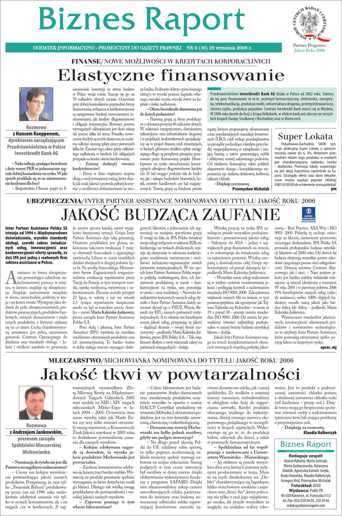 Partner Programu Jakość Roku 2006 FINANSE/NOWE MO¯LIWOŒCI W KREDYTACH KORPORACYJNYCH Elastyczne finansowanie Rozmowa z Hansem Koeppenem, dyrektorem zarządzającym Przedstawicielstwa w Polsce Investkredit Bank AG – Niska inflacja, spadające bezrobocie i duży wzrost PKB to jednoznaczne sygnały dobrej koniunktury na rynku. W jaki sposób przekłada się to na zainteresowanie kredytami dla firm? – Bezpośrednio. Obecnie popyt na fi- nansowanie inwestycji ze strony banków w Polsce wciąż rośnie. Szacuje się go na 70 miliardów złotych rocznie. Oczywiście przy dobrej koniunkturze poprzednie formy finansowania, zwłaszcza te krótkoterminowe są zastępowane bardziej nowoczesnymi instrumentami, jak kredyty długoterminowe i obligacje korporacyjne. Również poziom wymaganych zabezpieczeń jest dużo niższy niż jeszcze kilka lat temu. Ponadto, nowoczesne kredyty są na tyle elastyczne,że możemy odłożyć wymóg spłaty przez pierwszych kilka lat. Zamiast tego, okres spłaty całkowitego zadłużenia w kredycie lub obligacjach przypada na koniec okresu kredytowania. – Zmiany dotknęły również kredytobiorców? – Firmy w dużo większym stopniu dbają o swój zewnętrzny rating, który działa jak znak jakości i pozwala pełniej korzystać z możliwości dofinansowania ze stro- ny banku. Podstawy dobrze opracowanego rating’u to wysoki poziom kapitału własnego, wysokie marże, wysoki zwrot na kapitale i niskie zadłużenie. – Oferta Investkredit skierowana jest do dużych podmiotów? – Pierwszą grupą są firmy produkcyjne z obrotami powyżej 40 milionów złotych. W sektorach energetycznym, chemicznym, rafineryjnym oraz infrastrukturze drogowej i w projektach środowiskowych specjalizujemy się w project finance, czyli inwestycjach, w których głównym źródłem spłaty zaciągniętego długu są przepływy pieniężne generowane przez finansowany projekt. Deweloperom na rynku nieruchomości komercyjnych oferujemy długoterminowe kredyty (do 25 lat) mogące posłużyć tak do budowy, jak i zakupu budynków biurowych, hoteli, centrów handlowych czy hal magazynowych. Trzecią grupą są fundusze private Przedstawicielstwo Investkredit Bank AG działa w Polsce od 2002 roku. Sektory do tej pory finansowane to m.in. przemysł farmaceutyczny, elektronika, energetyka, telekomunikacja, produkcja mebli, infrastruktura drogowa, przemysł browarniczy, chemia ciężka, produkcja pojazdów. Centrala Ivestkredit Bank mieści się w Wiedniu. W 2006 roku doszło do fuzji z Grupą Volksbank, w efekcie bank jest obecny we wszystkich krajach Europy Środkowej i Wschodniej oraz w Niemczech. equity, którym proponujemy sfinansowanie coraz popularniejszych transakcji lewarowanych (LBO), czyli wykup przedsiębiorstwa za pieniądze pochodzące z kredytu przez kadrę wyspecjalizowaną w zarządzaniu i znającą branżę, a zatem gwarantującą szybki i efektywny rozwój nabywanego podmiotu. Od niedawna finansujemy także polskich eksporterów dużego i kompleksowego wyposażenia np. statków, elektrowni, kotłowni, rafinerii i fabryk. – Dziękuję za rozmowę. Przemysław Michalak Super Lokata Południowo-Zachodnia SKOK promuje atrakcyjną Super Lokatę o oprocentowaniu nawet do 6, 3%. Motywem przewodnim reklam tego produktu w mediach jest charakterystyczna niebieska świnka - skarbonka. Promocja lokaty wspomagana jest akcją kuponową (upominek za kupon). Szczegóły oferty oraz dane teleadresowe można uzyskać poprzez infolinię: 0 801 63 00 00 lub w internecie: www.pzskok.pl pm UBEZPIECZENIA/INTER PARTNER ASSISTANCE NOMINOWANY DO TYTU£U JAKOŒÆ ROKU 2006 JAKOŒÆ BUDZ¥CA ZAUFANIE Inter Partner Assistance Polska SA istnieje od 1994 r. Międzynarodowe doświadczenie, wysokie standardy obsługi, szeroki zakres świadczonych usług, innowacyjność oraz konkurencyjność oferty sprawiły, że dziś IPA jest jedną z czołowych firm sektora assistance w Polsce. A ssistance to forma ubezpieczenia gwarantująca udzielenie natychmiastowej pomocy w miejscu, w którym znajduje się ubezpieczony. Znajduje zastosowanie wszędzie: w domu, samochodzie, podróży, w kraju i na końcu świata. Występuje jako dodatek do polis ubezpieczeniowych, produktów gwarancyjnych, produktów bankowych, różnych abonamentów i wielu innych produktów, z którymi stykamy się na co dzień. Cechą charakterystyczną assisatance jest pełna, niezmienna gotowość Centrum Operacyjnego do działania oraz standardy obsługi. – Jakość i wielkość zasobów to gwarancja, że asystor sprosta każdej, nawet wyjątkowo kryzysowej sytuacji. Grupa Inter Partner Assistance daje taką gwarancję. Ostatnim przykładem jest głośna, zakończona sukcesem ewakuacja 5 tysięcy obywateli francuskich z ogarniętego zawieruchą Libanu w czasie izraelskich działań zbrojnych w drugiej połowie lipca br. Na prośbę francuskiego Ministerstwa Spraw Zagranicznych zorganizowaliśmy ewakuację repatriantów przez Turcję do Francji, w tym transport morski, opiekę medyczną, wyżywienie i zakwaterowanie. Zlecenie zostało przyjęte 22 lipca, w sobotę a już we wtorek 2,5 tysiąca repatriantów bezpiecznie zeszło na ląd w tureckim porcie Antalya – mówi Marta Kaleńska-Jaśkiewicz, prezes zarządu Inter Partner Assistance Polska S.A. Poza skalą i jakością, Inter Partner Assisatnce (IPA) wyróżnia się szerokim wachlarzem oferowanych produktów oraz ich innowacyjnością. To bardzo ważne w dobie stałego wzrostu wymagań obsłu- gowych klientów, a jednocześnie ich segmentacji na mniejsze, specyficzne grupy. Z uwagi na fakt, że IPA Polska świadczy swoje usługi wyłącznie w sektorze B2B, nie konkurując na rynkach detalicznych, wpisuje się elastycznie w założenia marketingowe, oczekiwania merytoryczne i możliwości techniczno-organizacyjne swoich partnerów instytucjonalnych. W ten sposób Inter Partner Assistance Polska wspiera politykę marketingową firm, ich kreatywność produktową, w sumie – konk