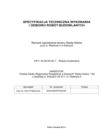 SPECYFIKACJA TECHNICZNA WYKONANIA i ODBIORU ROBÓT BUDOWLANYCH Remont ogrodzenia terenu Radia Kielce przy ul. Radiowa 4 w Kielcach CPV: 45.00.00.00-7 – Roboty budowlane INWESTOR: Polskie Radio Regionalna Rozgłośnia w Kielcach" Radio Kielce " SA z siedzibą w Kielcach 25-317, ul. Radiowa 4 Sporządził Nr. uprawnień mgr inż. Artur Polakowski SWK/0083/POOK/05 Kielce, listopad 2013 r. Podpis ZAWARTOŚĆ 1. Wstęp 1.1 Przedmiot ST 1.2 Zakres stosowania ST 1.3 Zakres robót objęty specyfikacją 1.4 Określenia podstawowe 1.5 Ogólne wymagania dotyczące robót 1.5.1 Informacja o placu budowy 1.5.2 Ochrona środowiska 1.5.3 Ochrona przeciwpożarowa 1.5.4 Bezpieczeństwo i higiena pracy 2. Materiały 2.1 Źródła uzyskania materiałów 2.2 Przechowywanie materiałów 3. Sprzęt 4. Transport 5. Wykonanie robót 5.1 Roboty rozbiórkowe 5.2Roboty budowlano – montażowe 6. Kontrola jakości 6.1 Program zapewnienia jakościowe 6.2 Zasady kontroli jakości 7. Obmiar robót 8. Odbiór robót 9. Podstawa płatności 10.Przepisy związane 2 1. WSTĘP 1.1 Przedmiot ST Przedmiotem niniejszej specyfikacji technicznej są wymagania dotyczące wykonania i odbioru ogrodzenia działki przy budynku studiów radiowych Radia Kielce przy ul. Radiowa 4 w Kielcach . 1.2 Zakres stosowania ST Specyfikacja techniczna jest stosowana jako dokument przetargowy i kontraktowy przy zleceniu i realizacji robót wymienionych pkt. 1.1 1.3 Zakres robót objęty specyfikacją Roboty, których dotyczy specyfikacja obejmują wszystkie czynności związane z demontażem istniejącego ogrodzenia i wykonaniem nowo projektowanego ogrodzenia zgodnie z załącznikiem nr 1 „ Zakres remontu ogrodzenia” . W skład robót na wskazanych odcinkach zgodnie z załącznikiem nr 1 „ Zakres remontu ogrodzenia” wchodzą: a. Roboty rozbiórkowe: - rozebranie słupków istniejącego ogrodzenia i przęseł stalowych, bram, furtek - rozebranie cokołu betonowego b. Roboty budowlano - montażowe; - zabetonowanie słupków pod ogrodzenie w ziemię - montaż płyt cokołu ze stopami oporowymi, –montaż 3 sztuk kompletnych bram samonośnych przesuwnych z profili zamkniętych (2 sztuki w okolicy wejścia głównego i 1 sztuka bramy wjazdowej na działkę) – montaż 2 sztuk furtek ogrodzeniowych (w okolicy wejścia głównego do budynku) – montaż nowego ogrodzenia z przęseł stalowych z profili zamkniętych na odcinkach zgodnie z załącznikiem nr 1 „ Zakres remontu ogrodzenia” - montaż nowego ogrodzenia z przęseł ogrodzenia panelowego na wskazanym odcinku zgodnie z załącznikiem nr 1 „ Zakres remontu ogrodzenia” 1.4 Określenia podstawowe Określenia podane w specyfikacji technicznej /ST / zgodne z obowiązującymi normami i wytycznymi. 1.5 Ogólne wymagania dotyczące robót Wykonawca robót jest odpowiedzialny za jakość wykonywanych robót oraz za zgodność z kosztorysem, specyfikacją techniczną i sztuką budowlaną. Technologia wykonania robót wynikać powinna z dokumentacji Projektowej Zamawiającego, szczegółowych instrukcji producentów, ogólnych przepisów Prawa Budowlanego i Polskich Norm. 1.5.1 Informacja o placu budowy Na okres prowadzenia robót należy wydzielić teren objęty budową, w taki sposób aby utrzymać normalne warunki użytkowania pozostałej części placu i chodników. Na wykonawcy spoczywa odpowiedzialność za teren budowy od chwili przekazania do odbioru końcowego. 1.5.2 Ochrona środowiska Wykonawca ma obowiązek znać i podejmować wszelkie konieczne kroki mające na celu stosowanie się do przepisów i norm dotyczących ochrony środowiska . 3 1.5.3 Ochrona przeciwpożarowa Wykonawca będzie przestrzegać przepisy o ochronie p/pożarowej Wymagany sprzęt przeciwpożarowy będzie utrzymywany zgodnie z wymaganymi przepisami. Materiały łatwopalne będą składowane i zabezpieczone przed dostępem osób trzecich zgodnie z obowiązującymi wymogami. 1.5.4 Bezpieczeństwo i higiena pracy Podczas realizacji robót Wykonawca ma obowiązek zadbać o przestrzeganie przepisów bezpieczeństwa i higieny pracy. W tym, aby personel nie wykonywał pracy w warunkach niebezpiecznych, szkodliwych dla zdrowia i życia oraz nie spełniających odpowiednich warunków sanitarnych . 2. MATERIAŁY 2.1 Źródła uzyskania materiałów Wbudowane materiały budowlane powinny spełniać wymagania jakościowe określone Polskimi Normami i posiadać aprobatami techniczne, świadectwa kwalifikacyjne, atesty. 2.2 Przechowywanie materiałów Wykonawca zapewni, aby materiały przeznaczone do wbudowania były zabezpieczone przed zniszczeniem i zachowały swoją jakość. Najlepiej by były przechowywane w zamkniętych, suchych magazynach, na utwardzonym podłożu. 3. SPRZĘT Roboty należy wykonać przy użyciu dowolnego sprzętu akceptowanego przez inspektora nadzoru pod warunkiem, że użycie jego nie wpłynie niekorzystnie na jakość wykonywanych robót. Sprzęt powinien być utrzymywany w dobrym stanie i gotowości do pracy. 4. TRANSPORT Wyroby do transportu należy zabezpieczyć przed uszkodzeniami mechanicznymi poprzez odpowiednie opakowania. Należy je również zabezpieczyć przed przesunięciami i utratą stateczności. Wykonawca na bieżąco i na własny koszt będzie usuwać wszelkie zabrudzenia spowodowane jego pojazdami na drogach dojazdowych do miejsca robót. 5.WYKONANIE ROBÓT 5.1 Roboty rozbiórkowe - rozebranie starych elementów ogrodzenia – ułożenie materiałów pochodzących z demontażu na odpowiednie składowiska Zdemontowane elementy ogrodzenia należy oddać na złom a następnie fakturę i pieniądze przekazać Inwestorowi. 5.2 Roboty budowlano - montażowe - zabetonować słupki w ziemi zakończone kapturkami - zamontować cokół ze stopami oporowymi 4 – zamontować panele ogrodzeniowe – wykonać słupy przy bramowe i narożne – montaż bram i furtek 6. KONTROLA JAKOŚĆI 6.1 Program zapewnienia jakości Wykonawca jest zobowiązany do opracowania i przedstawienia do zaakce