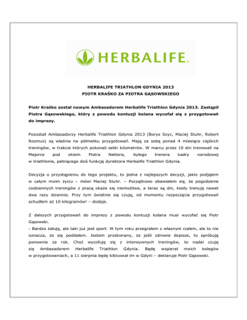 HERBALIFE TRIATHLON GDYNIA 2013 PIOTR KRAŚKO ZA PIOTRA GĄSOWSKIEGO Piotr Kraśko został nowym Ambasadorem Herbalife Triathlon Gdynia 2013. Zastąpił Piotra Gąsowskiego, który z powodu kontuzji kolana wycofał się z przygotowań do imprezy. Pozostali Ambasadorzy Herbalife Triathlon Gdynia 2013 (Borys Szyc, Maciej Stuhr, Robert Rozmus) są właśnie na półmetku przygotowań. Mają za sobą ponad 4 miesiące ciężkich treningów, w trakcie których pokonali setki kilometrów. W marcu przez 10 dni trenowali na Majorce pod okiem Piotra Nettera, byłego trenera kadry narodowej w triathlonie, pełniącego dziś funkcję dyrektora Herbalife Triathlon Gdynia. Decyzja o przystąpieniu do tego projektu, to jedna z najlepszych decyzji, jakie podjąłem w całym moim życiu – mówi Maciej Stuhr. – Początkowo obawiałem się, że pogodzenie codziennych treningów z pracą okaże się niemożliwe, a teraz są dni, kiedy trenuję nawet dwa razy dziennie. Przy tym świetnie się czuję, od momentu rozpoczęcia przygotowań schudłem aż 10 kilogramów! – dodaje. Z dalszych przygotowań do imprezy z powodu kontuzji kolana musi wycofać się Piotr Gąsowski. - Bardzo żałuję, ale taki już jest sport. W tym roku przegrałem z własnym ciałem, ale to nie oznacza, że się poddałem. Jestem przekonany, że jeśli zdrowie dopisze, to spróbuję ponownie się za rok. Ambasadorem Choć wycofuję Herbalife się Triathlon z intensywnych Gdynia. Będę treningów, wspierał to nadal moich czuję kolegów w przygotowaniach, a 11 sierpnia będę kibicował im w Gdyni – deklaruje Piotr Gąsowski. Nowym Ambasadorem Herbalife Triathlon Gdynia 2013 został Piotr Kraśko, prezenter i dziennikarz telewizyjny, szef redakcji Wiadomości w TVP. - To naprawdę wspaniałe wyzwanie, do tego w takim towarzystwie to już czysta przyjemność. Dla mnie genialna przygoda, bo co prawda po paru maratonach nie mam takich obaw o bieganie, ale rowerem szosowym nie jeździłem właściwie nigdy w życiu. Po paru treningach jestem pewien dwóch rzeczy, jeszcze dużo pracy, a przede wszystkim potu przede mną, ale to naprawdę fantastyczne! I już żałuje, że nie zabrałem się do tego kilka lat temu. Podobnie z pływaniem. Teoretycznie każdy z nas pewnie myśli, że świetnie pływa, ale po spotkaniu z trenerem okazuje się, że wszystko jest do poprawienia. Ale właśnie to czyni triathlon tak rewelacyjnym. Żadne inne zawody tak nie mobilizują do naprawdę porządnych treningów – mówi Piotr Kraśko. Ambasadorzy Herbalife Triathlon Gdynia przygotowują się do startu na dystansie długim (1,9 km pływania – 90 km jazdy na rowerze i 21,1 km biegu). W zawodach, które odbędą się 11 sierpnia wystartuje rekordowa liczbą 1,5 tysiąca zawodników. Wśród nich będą również polscy olimpijczycy z Pekinu i Londynu – Maria Cześnik i Marek Jaskółka. Zwycięzca i zwyciężczyni zawodów otrzymają w nagrodę po 5000 dolarów. Start w Herbalife Triathlon Gdynia zapowiedzieli ponadto m.in. aktorzy Piotr Adamczyk, Tomasz Karolak, Bartłomiej Topa, Piotr Nowak oraz Waldemar Błaszczyk, a także prezenterzy i dziennikarze telewizyjni – Maciej Dowbor, Paulina Sykut i Marek Kacprzak. Więcej informacji na www.herbalifetriathlon.com