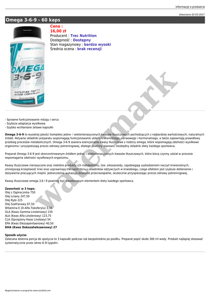Informacje o produkcie Utworzono 02-03-2017 Omega 3-6-9 - 60 kaps Cena : 16,00 zł er m ar k Producent : Trec Nutrition Dostępność : Dostępny Stan magazynowy : bardzo wysoki Średnia ocena : brak recenzji - Sprawne funkcjonowanie mózgu i serca - Szybsza adaptacja wysiłkowa - Szybko wchłaniane żelowe kapsułki Omega 3-6-9 to wysokiej jakości kompleks jedno- i wielonienasyconych kwasów tłuszczowych pochodzących z najbardziej wartościowych, naturalnych źródeł. Aktywne składniki preparatu wspomagają funkcjonowanie układu krwionośnego, nerwowego i hormonalnego, a także zapewniają prawidłowy przebieg procesów metabolicznych. Omega 3-6-9 zawiera esencjonalne kwasy tłuszczowe z rodziny omega, które wspomagają zdolności wysiłkowe organizmu i przyspieszają proces odnowy potreningowej, dlatego powinny stanowić niezbędny składnik diety każdego sportowca. Preparat Omega 3-6-9 jest skoncentrowanym źródłem jedno- i wielonienasyconych kwasów tłuszczowych, które biorą czynny udział w procesie wspomagania zdolności wysiłkowych organizmu. at Kwasy tłuszczowe nienasycone oraz niektóre produkty ich metabolizmu, tzw. eikozanoidy, zapobiegają uszkodzeniom naczyń krwionośnych, zmniejszają krzepliwość krwi oraz usprawniają transport tlenu i składników odżywczych w krwiobiegu, czego efektem jest szybsze dotlenienie i dożywienie pracujących mięśni. Jednocześnie wykazują działanie przeciwzapalne, skutecznie przyspieszając proces odnowy potreningowej. Kwasy tłuszczowe omega 3,6 i 9 powinny być nieodzownym elementem diety każdego sportowca. w Zawartość w 3 kaps: Olej z Ogórecznika 750 Olej Lniany 247,50 Olej Rybi 225 Olej Szafranowy 67,50 Witamina E (D-Alfa-Tokoferylu) 3,33 GLA (Kwas Gamma-Linolenowy) 150 ALA (Kwas Alfa-Linolenowy) 123,75 CLA (Sprzężony Kwas Linolowy) 54 EPA (Kwas Eikozapentaenowy) 40,50 DHA (Kwas Dokozaheksaenowy) 27 Sposób użycia: Zalecana dzienna porcja do spożycia to 3 kapsułki podczas lub bezpośrednio po posiłku. Preparat popić około 300 ml wody. Produkt najlepiej stosować systematycznie przez okres 6–8 tygodni. Wygenerowano w programie www.oscGold.com