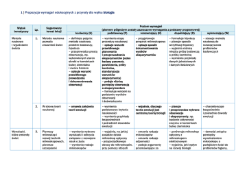 1 | Propozycja wymagań edukacyjnych z przyrody dla wątku biologia Wątek tematyczny Metoda naukowa i wyjaśnianie świata Wynalazki, które zmieniły świat Lp. Sugerowany temat lekcji konieczny (K) Poziom wymagań (pismem półgrubym zostały zaznaczone wymagania z podstawy programowej) podstawowy (P) rozszerzający (R) dopełniający (D) wykraczający (W) 1. Metoda naukowa pozwala zrozumieć świat – definiuje pojęcia: metoda naukowa, problem badawczy, hipoteza – przeprowadza prostą obserwację, np. wybarwionych ziaren skrobi w komórkach bulwy ziemniaka i owocu banana – opisuje warunki prawidłowego prowadzenia i dokumentowania obserwacji – wymienia etapy procedury naukowej – opisuje warunki prawidłowego planowania i przeprowadzania eksperymentów (jeden badany parametr, powtórzenia, próby kontrolne, standaryzacja warunków eksperymentu) – podaje różnicę pomiędzy obserwacją a eksperymentem – formułuje wnioski na podstawie wyników obserwacji i doświadczenia – przygotowuje preparat mikroskopowy – opisuje sposób dokumentowania wyników eksperymentów – formułuje hipotezy – planuje sposób weryfikacji hipotezy – wyjaśnia różnicę między próbą badawczą a próbą kontrolną – wymienia przykłady danych jakościowych i danych ilościowych – stosuje metodę naukową do rozwiązywania problemów badawczych 2. W stronę teorii naukowej – omawia założenia teorii ewolucji – wymienia podstawowe kryteria naukowości – wymienia przykłady bezpośrednich i pośrednich dowodów ewolucji – wyjaśnia, dlaczego teoria ewolucji jest centralną teorią biologii – planuje i przeprowadza wybrane obserwacje i eksperymenty, np. badanie aktywności enzymu w komórkach bulwy ziemniaka – charakteryzuje bezpośrednie i pośrednie dowody ewolucji 3. Pierwszy mikroskop i rozwój technik mikroskopowych, pierwsze szczepionki – wymienia wybrane wynalazki i odkrycia związane z rozwojem nauk o życiu – wymienia rodzaje mikroskopów – wyjaśnia, na jakiej zasadzie działa mikroskop optyczny - przyporządkowuje obrazy do mikroskopów, przy pomocy których – omawia rodzaje mikroskopów – omawia rodzaje odporności – podaje argumenty przemawiające za – porównuje mikroskop optyczny z mikroskopem elektronowym – wyjaśnia, jaki wpływ na rozwój biologii – dowodzi związku pomiędzy wynalezieniem mikroskopu a podejściem ludzi do problemów higieny, 2 | Propozycja wymagań edukacyjnych z przyrody dla wątku biologia Energia – od Słońca do żarówki – wyjaśnia, czym są i jak działają szczepienia ochronne – definiuje pojęcia: antygen, przeciwciało zostały one uzyskane – wyszukuje informacje na temat pierwszego mikroskopu i rozwoju technik mikroskopowych oraz pierwszych szczepionek – rozróżnia rodzaje odporności i podaje ich przykłady powszechnością szczepień i medycyny miało wynalezienie mikroskopu – analizuje naukowe i społeczne znaczenie rozwoju technik mikroskopowych i wynalezienia szczepionek chorób zakaźnych, leczenia – wyjaśnia, czym są szczepionki skojarzone 4. Od antybiotyków po łańcuchową reakcję polimerazy – definiuje pojęcia: antybiotyk, łańcuchowa reakcja polimerazy (PCR), biotechnologia – wyszukuje informacje na temat pierwszych antybiotyków oraz analizuje naukowe i społeczne znaczenie ich odkrycia – określa znaczenie biotechnologii tradycyjnej i biotechnologii nowoczesnej – omawia historię odkrycia penicyliny – wyszukuje informacje na temat odkrycia termostabilnej polimerazy DNA i rozwoju biotechnologii molekularnej – podaje przykłady zastosowania techniki PCR w życiu człowieka – wyjaśnia, na czym polegała jakościowa zmiana w medycynie po odkryciu i upowszechnieniu antybiotyków – omawia historię wybranych odkryć i wynalazków, analizując proces dokonywania odkrycia lub wynalazku i wskazując uwarunkowania tego procesu – wyjaśnia różnicę między działaniem związków chemicznych o charakterze bakteriobójczym a działaniem związków chemicznych o charakterze cytostatycznym – wyjaśnia przyczyny powstawania oporności bakterii na antybiotyki i wiąże ten proces z niewłaściwymi zachowaniami ludzi – uzasadnia, że mutacje mają znaczenie dla powstania oporności bakterii na antybiotyki – analizuje znaczenie naukowe i społeczne odkrycia termostabilnej polimerazy DNA i rozwoju biotechnologii molekularnej – analizuje kolejne etapy łańcuchowej reakcji polimerazy – ocenia znaczenie poszczególnych odkryć i wynalazków, wybiera najważniejsze odkrycia i wynalazki oraz uzasadnia swój wybór 5. Fotosynteza i oddychanie – omawia znaczenie fotosyntezy – wskazuje chloroplasty jako – wyjaśnia, na czym polegają fotosynteza i oddychanie tlenowe – zapisuje reakcje – omawia przebieg fotosyntezy – wyjaśnia związek pomiędzy budową ATP – wyjaśnia, skąd pochodzi zielone zabarwienie roślin – porównuje – wykazuje różnice między oddychaniem tlenowym a oddychaniem 3 | Propozycja wymagań edukacyjnych z przyrody dla wątku biologia miejsce zachodzenia fotosyntezy – omawia znaczenie oddychania komórkowego – wskazuje mitochondria jako miejsce zachodzenia oddychania tlenowego fotosyntezy i oddychania tlenowego – określa funkcje ATP – wyjaśnia znaczenie wymiany gazowej – wymienia przykłady organizmów przeprowadzających: fotosyntezę, oddychanie tlenowe, oddychanie beztlenowe, fermentację a jego funkcją jako przenośnika użytecznej biologicznie energii chemicznej – określa znaczenie oddychania beztlenowego i fermentacji fotosyntezę z oddychaniem beztlenowym i fermentacją 6. Energia w ekosystemie – wyjaśnia role producentów, konsumentów i destruentów w ekosystemie – definiuje pojęcie łańcuch pokarmowy – przestawia schematycznie przepływ energii przez ekosystem – omawia przepływ energii przez ekosystemy wodne i lądowe – rysuje piramidę energii – wyjaśnia, dlaczego energia przepływa przez e