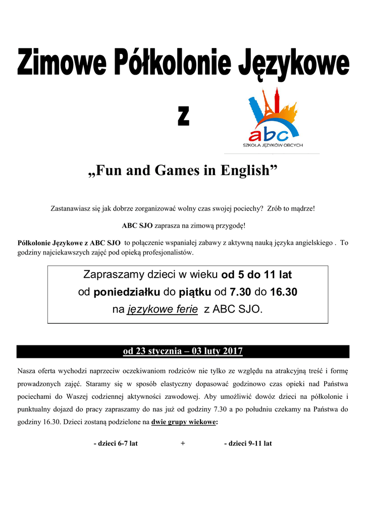 „Fun and Games in English” Zastanawiasz się jak dobrze zorganizować wolny czas swojej pociechy? Zrób to mądrze! ABC SJO zaprasza na zimową przygodę! Półkolonie Językowe z ABC SJO to połączenie wspaniałej zabawy z aktywną nauką języka angielskiego . To godziny najciekawszych zajęć pod opieką profesjonalistów. Zapraszamy dzieci w wieku od 5 do 11 lat od poniedziałku do piątku od 7.30 do 16.30 na językowe ferie z ABC SJO. od 23 stycznia – 03 luty 2017 Nasza oferta wychodzi naprzeciw oczekiwaniom rodziców nie tylko ze względu na atrakcyjną treść i formę prowadzonych zajęć. Staramy się w sposób elastyczny dopasować godzinowo czas opieki nad Państwa pociechami do Waszej codziennej aktywności zawodowej. Aby umożliwić dowóz dzieci na półkolonie i punktualny dojazd do pracy zapraszamy do nas już od godziny 7.30 a po południu czekamy na Państwa do godziny 16.30. Dzieci zostaną podzielone na dwie grupy wiekowe: - dzieci 6-7 lat + - dzieci 9-11 lat Wszystkie zajęcia prowadzone są w formie gier i zabaw, uwzględniając ciągły kontakt z językiem angielskim Na zajęciach języka angielskiego dzieci oglądać będą edukacyjne filmiki w oryginale, po czym rozwiążą związane z nim zadania, nauczą się piosenek i rymowanek. W czasie zajęć plastycznych dzieci wykonywać będą prace z wykorzystaniem różnorodnych technik. Zajęcia sportowe to szereg gier i zabaw na świeżym powietrzu. Cel: aktywny i kreatywny wypoczynek, „English is fun”, czyli całkiem na luzie zajęcia języka angielskiego doskonalenie sprawności językowych poprzez dialogi teatralne, śpiew i zabawę, naturalny, swobodny i atrakcyjny sposób przyswajania języka angielskiego, poszerzanie wiadomości kulturoznawczych, motywowanie dzieci do nauki języka angielskiego, Każdy dzień zaczynamy wprowadzeniem słownictwa, które będzie nam potrzebne podczas dnia. Następnie przechodzimy do gier i zabaw. Słownictwo powtarzamy przy okazji starannie zaplanowanych aktywności. Wszystko to w przyjaznej atmosferze, według programu autorskiego opracowanego w taki sposób, aby dzieci potraktowały język nie jako obcy, ale jako drugi, służący do przeżycia kolejnej przygody. Dzieci pod opieką lektora języka angielskiego będą miały okazje świetnie spędzić czas na wspólnej zabawie, połączonej z odkrywaniem tajników języka angielskiego. Główne bloki tematyczne: język angielski I NT RO DUCING - p rz edst awi ani e si ę FO O D AN D DRIN KS - j edz eni e i pi ci e CL O T H E S - ubrania S H O PPI NG - z akupy WE AT H E R – pogoda W programie: opieka nad dziećmi od poniedziałku do piątku w godz. 7.30 - 16.30 świetna zabawa również na świeżym powietrzu in English nauka języka angielskiego dużą dawką konwersacji, zabaw, gier językowych i konkursów rozwijających wszystkie sprawności językowe dziesięciogodzinny kurs języka angielskiego, 2 godz.dziennie przez 5 dni (1 turnus), projekty językowe (photo story, warsztaty filmowe, cooking club) in English, kręgielnia, wyjście na lodowisko zajęcia plastyczne, zajęcia kulinarne zajęcia experymentalne, wyżywienie (obiad + woda mineralna), pracę w małych, 10 - 14 -osobowych grupach, opiekę wykwalifikowanych lektorów, ubezpieczenie NNW, pamiątkową płytę ze zdjęciami. Zajęcia prowadzone są przez doświadczonych lektorów ABC Szkoły Języków Obcych według autorskiego programu przygotowanego specjalnie na ferie zimowe w salach SP 12, ul.KEN 1A, 15-687 Białystok Gwarantujemy świetną zabawę! Szczegóły organizacyjne: Terminy: - I turnus – 23 – 27.01.2017 (program A) - II turnus – 30.01 - 03.02.2017 (program B) Wiek: 6-11 lat GRUPA WIEKOWA – 6 - 8 lat- CATS GRUPA WIEKOWA – 9 – 11 lat- LIONS Zajęcia trwają (opieka nad dzieckiem) od poniedziałku do piątku od godziny 7.30 do 16:30 Wyżywienie: drugie śniadanie, obiad + woda mineralna Opłata za turnus: 299 zł./ turnus =1 tydzień (od poniedziałku do piątku) 585 zł./ 2 tygodnie W tym: - zajęcia języka angielskiego + zajęcia plastyczne, - różnego rodzaju atrakcje: np.basen, kręgielnia, kino, wyjście na lodowisko - obiad i woda mineralna - wszystkie wstępy, bilety komunikacyjne - opieka nad dzieckiem od 7.30-16.30, - ubezpieczenie NNW, Informacje i zapisy: Zapisy od 10 grudnia 2016 RABATY: - 5% rabatu dla rodzeństwa - 5% rabatu przy równoczesnym zapisie 3 lub więcej osób - 2 turnusy – cena - 585 zł. (23.01 – 03.02.2012) *rabaty nie sumują się Aby zapisać dziecko na Zimowe Półkolonie Językowe – „Fun and Games in English” z ABC SJO należy: Dokonać zgłoszenia osobiście w ABC SJO, ul. KEN 52 lok.2, Białystok lub telefonicznie: 537-799-933 Wpłacić 100 zł zaliczki w ciągu 3 dni od dokonania zgłoszenia na konto ABC Szkoły Językowej Wypełnić kartę zgłoszeniową oraz podpisać regulamin i umowę – Wypełnić oświadczenie dotyczące upoważnienia do odbioru dziecka. Konto na które prosimy kierować opłaty: ABC Szkoła Języków Obcych ul. Komisji Edukacji Narodowej 52 lok.2 15-687 Białystok Bank Zachodni WBK- 86 1500 1344 1213 4010 3665 0000 W tytule wpłaty prosimy podać imię i nazwisko dziecka, adres oraz dopisek „Półkolonie Językowe”.