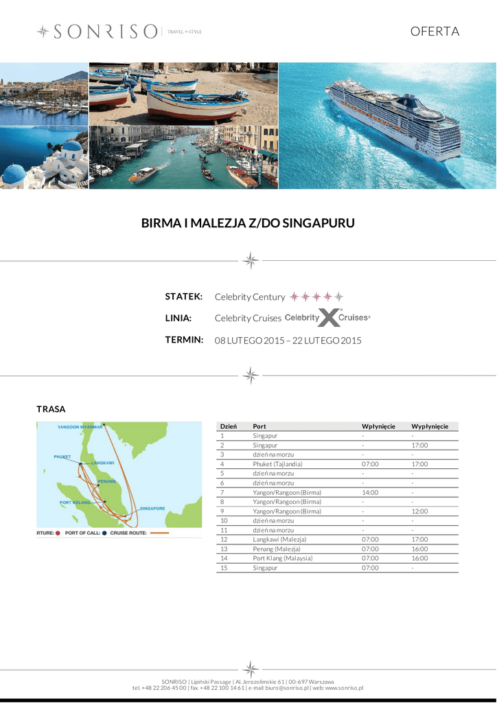 OFERTA BIRMA I MALEZJA Z/DO SINGAPURU STATEK: Celebrity Century LINIA: Celebrity Cruises TERMIN: 08 LUTEGO 2015 – 22 LUTEGO 2015 TRASA Dzień 1 2 3 4 5 6 7 8 9 10 11 12 13 14 15 Port Singapur Singapur dzień na morzu Phuket (Tajlandia) dzień na morzu dzień na morzu Yangon/Rangoon (Birma) Yangon/Rangoon (Birma) Yangon/Rangoon (Birma) dzień na morzu dzień na morzu Langkawi (Malezja) Penang (Malezja) Port Klang (Malaysia) Singapur Wpłynięcie 07:00 14:00 07:00 07:00 07:00 07:00 SONRISO | Lipiński Passage | Al. Jero zo limskie 61 | 00-697 Warszawa tel. +48 22 206 45 00 | fax. +48 22 100 14 61 | e-mail: biuro @so nriso .pl | web: www.so nriso .pl Wypłynięcie 17:00 17:00 12:00 17:00 16:00 16:00 - OFERTA CENA Typ kabiny Cena z osobę Kabina wewnętrzna od 1 233 EUR Kabina z oknem od 1 656 EUR Kabina z balkonem od 2 196 EUR Sky Suite od 3 033 EUR CENA ZAWIERA DOTATKOWE OPŁATY zakwaterowanie w 2 - os. kabinie wybranej kategorii pełne wyżywienie: 3 posiłki, przekąski między posiłakmi, bufet o północy napoje do posiłków: woda stołowa, kawa, herbata oraz sok do śniadania serwis bagażowy podczas wejścia i zejścia ze statku 24 godzinny serwis kabinowy korzystanie z urządzeń sportowo - rekreacyjnych dostępnych na pokładzie (baseny, jacuzzi, boiska sportowe, kluby dla dzieci i młodzieży itp.) udział we wszystkich imprezach organizowanych na pokładzie (przedstawienia, pokazy, aukcje, animacje i inne) obowiązkowe opłaty portowe obowiązkową opłatę serwisową (napiwki) dla obsługi statku dojazd/przelot do portu rozpoczęcia i zakończenia rejsu transfery (lotnisko - port - lotnisko) ewentualne noclegi przed lub po rejsie wycieczki fakultatywne napoje: bezalkoholowe, alkoholowe, woda mineralna dostępne w restauracjach i barach (istnieje możliwość wykupienia pakietów napojów, o szczegóły zapytaj w biurze) korzystanie z mini baru w kabinie korzystanie z usług typu: SPA, salon piękności, pralnia itp. wydatki osobiste tj. zakupy w butikach, internet, kasyno itp. obowiązkowe ubezpieczenie turystyczne koszt wymaganych wiz ewentualna opłata paliwowa (linia w momencie wzrotu cen ropy zastrzega sobie prawo do dodania oplaty paliwowej do każdej rezerwacji) Na życzenie świadczymy dodatkowo usługi: rezerwacje hotelowe na całym świecie, rezerwacje biletów lotniczych, trasferów oraz parkingu w porcie, rezerwacje wycieczek fakultatywnych i innych atrakcji SONRISO | Lipiński Passage | Al. Jero zo limskie 61 | 00-697 Warszawa tel. +48 22 206 45 00 | fax. +48 22 100 14 61 | e-mail: biuro @so nriso .pl | web: www.so nriso .pl