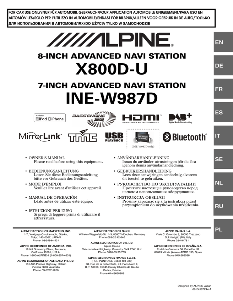 FOR CAR USE ONLY/NUR FÜR AUTOMOBIL GEBRAUCH/POUR APPLICATION AUTOMOBILE UNIQUEMENT/PARA USO EN AUTOMÓVILES/SOLO PER L’UTILIZZO IN AUTOMOBILE/ENDAST FÖR BILBRUK/ALLEEN VOOR GEBRUIK IN DE AUTO/ТОЛЬКО ДЛЯ ИСПОЛЬЗОВАНИЯ В АВТОМОБИЛЯХ/DO UŻYCIA TYLKO W SAMOCHODZIE EN R 8-INCH ADVANCED NAVI STATION X800D-U DE 7-INCH ADVANCED NAVI STATION FR INE-W987D ES IT (INE-W987D only) • OWNER’S MANUAL Please read before using this equipment. • ANVÄNDARHANDLEDNING Innan du använder utrustningen bör du läsa igenom denna användarhandledning. • BEDIENUNGSANLEITUNG Lesen Sie diese Bedienungsanleitung bitte vor Gebrauch des Gerätes. • GEBRUIKERSHANDLEIDING Lees deze aanwijzingen aandachtig alvorens dit toestel te gebruiken. • MODE D’EMPLOI Veuillez lire avant d’utiliser cet appareil. • РУКОВОДСТВО ПО ЭКСПЛУАТАЦИИ Прочтите настоящее руководство перед началом использования оборудования. • MANUAL DE OPERACIÓN Léalo antes de utilizar este equipo. • INSTRUKCJA OBSŁUGI Prosimy zapoznać się z tą instrukcją przed przystąpieniem do użytkowania urządzenia. • ISTRUZIONI PER L’USO Si prega di leggere prima di utilizzare il attrezzatura. ALPINE ELECTRONICS MARKETING, INC. 1-7, Yukigaya-Otsukamachi, Ota-ku, Tokyo 145-0067, JAPAN Phone: 03-5499-4531 ALPINE ELECTRONICS OF AMERICA, INC. 19145 Gramercy Place, Torrance, California 90501, U.S.A. Phone 1-800-ALPINE-1 (1-800-257-4631) ALPINE ELECTRONICS OF AUSTRALIA PTY. LTD. 161-165 Princes Highway, Hallam Victoria 3803, Australia Phone 03-8787-1200 ALPINE ELECTRONICS GmbH Wilhelm-Wagenfeld-Str. 1-3, 80807 München, Germany Phone 089-32 42 640 ALPINE ELECTRONICS OF U.K. LTD. Alpine House Fletchamstead Highway, Coventry CV4 9TW, U.K. Phone 0870-33 33 763 ALPINE ITALIA S.p.A. Viale C. Colombo 8, 20090 Trezzano Sul Naviglio (MI), Italy Phone 02-484781 ALPINE ELECTRONICS DE ESPAÑA, S.A. Portal de Gamarra 36, Pabellón, 32 01013 Vitoria (Alava)-APDO 133, Spain Phone 945-283588 ALPINE ELECTRONICS FRANCE S.A.R.L. (RCS PONTOISE B 338 101 280) 98, Rue de la Belle Etoile, Z.I. Paris Nord Il, B.P. 50016, 95945 Roissy Charles de Gaulle Cedex, France Phone 01-48638989 Designed by ALPINE Japan 68-24567Z44-A SE NL RU PL WYŁĄCZNY DYSTRYBUTOR HORN DISTRIBUTION S.A. UL. KURANTÓW 34 02-873 WARSZAWA TEL.: 0-22 331-55-55 FAX.: 0-22 331-55-00 WWW.ALPINE.COM.PL Centralny Serwis: ul. Kurantów 26, 02-873 Warszawa, tel. 22/331 55 33, [email protected] POLSKI Spis treści Szybkie zmniejszanie głośności ...................21 Typowe operacje Instrukcja obsługi ŚRODKI OSTROŻNOŚCI WAŻNE INFORMACJE, KTÓRE NALEŻY UWAŻNIE PRZECZYTAĆ PRZED UŻYCIEM NINIEJSZEGO PRODUKTU. ............................................. 8 OSTRZEŻENIE Punkty, na które należy zwrócić uwagę w celu bezpiecznego korzystania .......................... 8 OSTRZEŻENIE ......................................... 8 PRZESTROGA ......................................... 9 ŚRODKI OSTROŻNOŚCI ....................... 10 Płyty, które można odtwarzać w tym urządzeniu ...........................................11 Funkcje Automatyczna zmiana ustawień użytkownika ...............................................15 Ulubione ........................................................15 Łatwe określanie ustawień dźwięku w zależności od typu pojazdu (i-Personalize) ............................................16 Informacje o podwójnym ekranie ...............16 Pozycja wyświetlania podwójnego ekranu ......................................................17 Wprowadzenie Lista akcesoriów ............................................18 Rozmieszczenie elementów sterujących ..................................................18 Włączanie i wyłączanie zasilania .................19 Włączanie systemu ........................................19 Pierwsze uruchomienie systemu ..................19 Wkładanie/wyjmowanie płyty .....................19 Wkładanie płyty .........................................19 Wysuwanie płyty ........................................19 Dostosowywanie kąta nachylenia ekranu ........................................................ 20 Zdejmowanie i zakładanie ekranu (Tylko INE-W987D) ................................. 20 Zdejmowanie ............................................ 20 Zakładanie ................................................. 21 Regulacja głośności ...................................... 21 Użycie funkcji Ulubione ..............................21 Rejestracja użytkownika ..............................22 Ustawianie funkcji Ulubione .......................22 Dodawanie ikon Ulubione .......................23 Edytowanie funkcji Ulubione ..................23 Wyświetlanie obrazu z kamery ................24 Ustawienia i-Personalize ..........................24 Tryb Łatwy dostęp audio/tryb BASS ENGINE SQ ..............................................25 Tryb łatwego dostępu audio .....................25 Tryb BASS ENGINE SQ .........................26 Ustawienia podczas przełączania użytkowników ............................................26 Sposób wprowadzania znaków i cyfr (klawiatura) ................................................27 Ustawienie Wygasanie górnego/dolnego banera .........................................................27 Przełączanie źródeł .......................................28 Funkcja wyłączania ekranu ......................28 Funkcja wyświetlania zawartości na monitorze z tyłu .........................................28 Przełączanie podwójnego ekranu ...............29 Obsługa dotykowa ........................................29 Wybór elementu z listy .................................29 Informacje o wyświetlaniu wskaźnika ........30 Funkcja wyświetlania czujników parkowania .................................................30 Dostęp do trybu klimatyzacji .....................