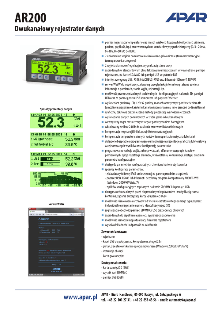 AR200 Dwukanałowy rejestrator danych pomiar i rejestracja temperatury oraz innych wielkości fizycznych (wilgotność, ciśnienie, n Sposoby prezentacji danych Serwer WWW poziom, prędkość, itp.) przetworzonych na standardowy sygnał elektryczny (0/4÷20mA, 0÷10V, 0÷60mV, 0÷850Ω) 2 uniwersalne wejścia pomiarowe nie izolowane galwanicznie (termorezystancyjne, n termoparowe i analogowe) 2 wyjścia alarmowe/regulacyjne z sygnalizacją stanu pracy n zapis danych w standardowym pliku tekstowym umieszczonym w wewnętrznej pamięci n rejestratora, na karcie SD/MMC lub pamięci USB w systemie FAT interfejs szeregowy USB, RS485 (MODBUS-RTU) oraz Ethernet (10base-T, TCP/IP) n serwer WWW do współpracy z dowolną przeglądarką internetową , strona zawiera n informacje o pomiarach, stanie wyjść, rejestracji, itp. możliwość przenoszenia danych archiwalnych i konfiguracyjnych na karcie SD, pamięci n USB oraz za pomocą portu USB komputera lub poprzez EtherNet wyświetlacz graficzny LCD, 128x32 punkty, monochromatyczny z podświetleniem tła n (umożliwia przypisanie każdemu kanałowi pomiarowemu innej jasności podświetlenia) graficzne, tekstowe oraz mieszane metody prezentacji wartości mierzonych n wyświetlanie danych pomiarowych w trybie jedno i dwukanałowym n wewnętrzny zegar czasu rzeczywistego z podtrzymaniem bateryjnym n wbudowany zasilacz 24Vdc do zasilania przetworników obiektowych n kompensacja rezystancji linii dla czujników rezystancyjnych n kompensacja temperatury zimnych końców termopar (automatyczna lub stała) n dołączone bezpłatne oprogramowanie umożliwiające prezentację graficzną lub tekstową n zarejestrowanych wyników oraz konfigurację parametrów programowalne rodzaje wejść, zakresy wskazań, alfanumeryczny opis kanałów n pomiarowych, opcje rejestracji, alarmów, wyświetlania, komunikacji, dostępu oraz inne parametry konfiguracyjne dostęp do parametrów konfiguracyjnych chroniony hasłem użytkownika n sposoby konfiguracji parametrów: n - z klawiatury foliowej IP65 umieszczonej na panelu przednim urządzenia - poprzez USB, RS485 lub Ethernet i bezpłatny program komputerowy ARSOFT-WZ1 (Windows 2000/XP/Vista/7) - z plików konfiguracyjnych zapisanych na karcie SD/MMC lub pamięci USB dostępna ochrona danych przed niepowołanym kopiowaniem i modyfikacją (suma n kontrolna, żądanie autoryzacji karty SD i pamięci USB) możliwość różnicowania archiwów od wielu rejestratorów tego samego typu poprzez n indywidualne przypisanie numeru identyfikacyjnego (ID) sygnalizacja obecności pamięci SD/MMC i USB oraz operacji plikowych n zapis danych do zapełnienia pamięci, sygnalizacja zapełnienia n możliwość samodzielnej aktualizacji firmware rejestratora n wysoka dokładność i odporność na zakłócenia n Zawartość zestawu: - rejestrator - kabel USB do połączenia z komputerem, długość 2m - płyta CD ze sterownikami i oprogramowaniem (Windows 2000/XP/Vista/7) - instrukcja obsługi - karta gwarancyjna Dostępne akcesoria: - karta pamięci SD (2GB) - czytnik kart SD/MMC - pamięć USB (2GB) www.apar.pl APAR - Biuro Handlowe, 05-090 Raszyn, ul. Gałczyńskiego 6 tel. +48 22 101-27-31, +48 22 853-48-56 • email: [email protected] Obudowa i sposób montażu Dane techniczne Uniwersalne wejścia (programowalne): zakresy pomiarowe Mocowanie tablicowe, uchwytami z boku obudowy - Pt100 (RTD, 3- lub 2-przewodowe) -200 ÷ 850 °C Wymiary 96 × 48 × 79 mm - Ni100 (RTD, 3- lub 2-przewodowe) -50 ÷ 170 °C Okno tablicy 92 × 46 mm - termopara J (TC, Fe-CuNi) -40 ÷ 800 °C Materiał samogasnący NORYL 94V-0, poliwęglan - termopara K (TC, NiCr-NiAl) -40 ÷ 1200 °C 300 ÷ 1800 °C - termopara R (TC, PtRh13-Pt) -40 ÷ 1600 °C - termopara T (TC, Cu-CuNi) -25 ÷ 350 °C - termopara E (TC, NiCr-CuNi) -25 ÷ 850 °C - termopara N (TC, NiCrSi-NiSi) -35 ÷ 1300 °C - prądowe (Rwe = 110 Ω) 0/4 ÷ 7 72 17 NORYL 45 -40 ÷ 1600 °C - termopara B (TC, PtRh30PtRh6) poliwęglan - termopara S (TC, PtRh 10-Pt) 20 mA - napięciowe (Rwe = 250 kΩ ) 0 ÷ 10 V - napięciowe (Rwe > 2 M Ω) 0 ÷ 60 mV - rezystancyjne (3- lub 2-przewodowe) 0 ÷ 850 Ω WIDOK OD STRONY UCHWYTU MOCUJĄCEGO Ilość wejść pomiarowych 2 Czas odpowiedzi (10÷90%) 1 ÷ 10 s (programowalny) Rezystancja doprowadzeń (RTD, Ω) Rd < 25 Ω (dla każdej linii) Prąd wejścia rezystancyjnego (RTD, Ω) ~550 μA Listwa zaciskowa i gniazda Błędy przetwarzania (w temperaturze otoczenia 25°C): - podstawowy - dla RTD, mA, V,mV, Ω 0,1 % zakresu pomiarowego ±1 cyfra - dla termopar 0,2 % zakresu pomiarowego ±1 cyfra - dodatkowy dla termopar < 2 °C (temperatura zimnych końców) - dodatkowy od zmian temp. otoczenia < 0,005 % zakresu wejścia /°C Rozdzielczość mierzonej temperatury Interfejsy komunikacyjne - USB (typu A4) 0,1 °C - tryb podrzędny (device) sterowniki dla systemu Windows 2000/XP/Vista/7 - tryb nadrzędny host, obsługa pamięci USB (pendrive) - RS485 protokół MODBUS-RTU, SLAVE, szybkość 2,4 ÷ 115,2 kbit/s, format znaku 8N1, nieseparowany galwanicznie - EtherNet (opcja) 10base-T, RJ45, serwer www, protokoły TCP/IP: DHCP, NetBIOS, ICMP, UDP, TCP, transfer danych ok. 10 kB/s Okres zapisu danych programowalny od 1s do 8 godz. (1) Pamięć danych (nieulotna, zapis do 18 mln. pomiarów dla 2 kanałów i pamięci 1GB): - wewnętrzna 4MB, typu FLASH, system plików FAT12, zapis do 72 tys. pomiarów dla 2 kanałów - zewnętrzna karta SD/MMC FAT16, FAT32, maksymalny rozmiar 2GB, zalecany rozmiar ≤1GB i FAT16, złącze z wyrzutnikiem - zewnętrzna pamięć USB (pendrive) FAT16, FAT32, maksymalny rozmiar 4GB, zalecany rozmiar ≤ 1GB i FAT16, złącze typu A4 Sposób Zamawiania Zegar czasu rzeczywistego (RTC) kwarcowy, uwzględnia lata przestępne, podtrzymanie bateria litowa CR1220 AR200 / o /o /o Wyjścia (2 ze wspólnym - przekaźnikowe 5A / 250V~ (dla obciążeń rezyst.), SPST tykiem) tranzystorowe typu NPN OC, 24V, rezystancja wewnętrzna 850 Ω - SSR (opcja) Wyświetlacz 