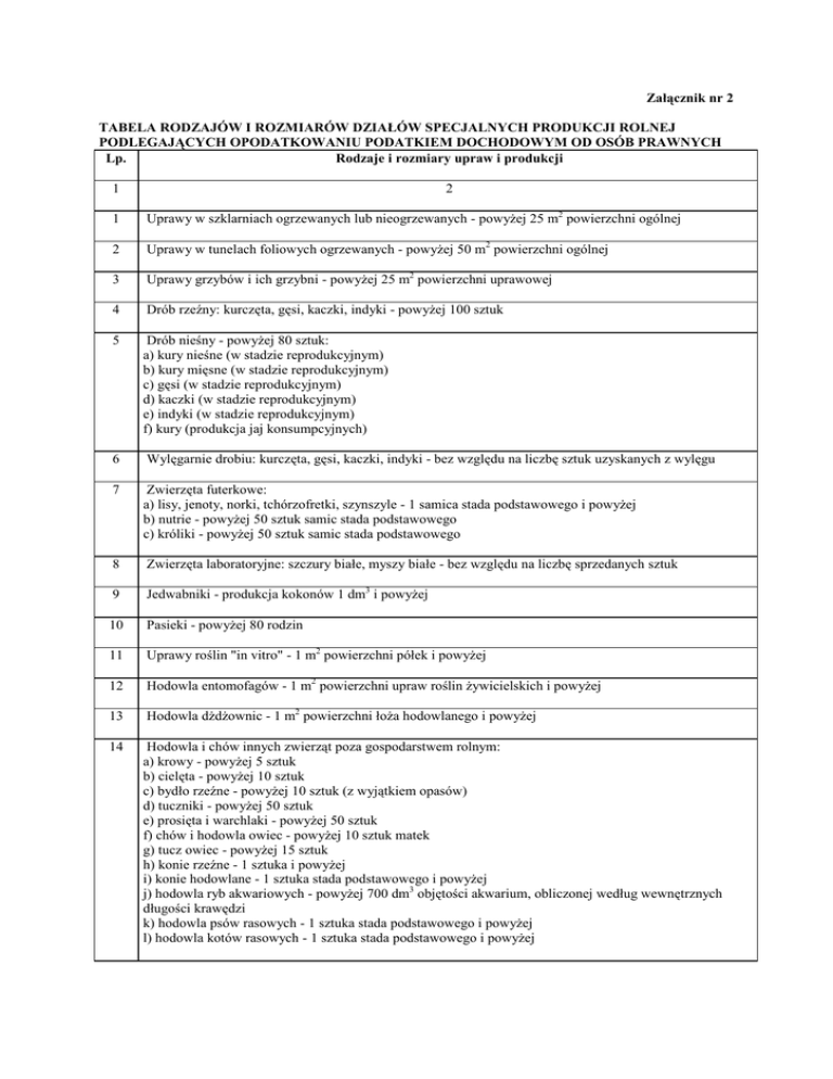 Załącznik nr 2 TABELA RODZAJÓW I ROZMIARÓW DZIAŁÓW SPECJALNYCH PRODUKCJI ROLNEJ PODLEGAJĄCYCH OPODATKOWANIU PODATKIEM DOCHODOWYM OD OSÓB PRAWNYCH Lp. Rodzaje i rozmiary upraw i produkcji 1 2 1 Uprawy w szklarniach ogrzewanych lub nieogrzewanych - powyżej 25 m2 powierzchni ogólnej 2 Uprawy w tunelach foliowych ogrzewanych - powyżej 50 m2 powierzchni ogólnej 3 Uprawy grzybów i ich grzybni - powyżej 25 m2 powierzchni uprawowej 4 Drób rzeźny: kurczęta, gęsi, kaczki, indyki - powyżej 100 sztuk 5 Drób nieśny - powyżej 80 sztuk: a) kury nieśne (w stadzie reprodukcyjnym) b) kury mięsne (w stadzie reprodukcyjnym) c) gęsi (w stadzie reprodukcyjnym) d) kaczki (w stadzie reprodukcyjnym) e) indyki (w stadzie reprodukcyjnym) f) kury (produkcja jaj konsumpcyjnych) 6 Wylęgarnie drobiu: kurczęta, gęsi, kaczki, indyki - bez względu na liczbę sztuk uzyskanych z wylęgu 7 Zwierzęta futerkowe: a) lisy, jenoty, norki, tchórzofretki, szynszyle - 1 samica stada podstawowego i powyżej b) nutrie - powyżej 50 sztuk samic stada podstawowego c) króliki - powyżej 50 sztuk samic stada podstawowego 8 Zwierzęta laboratoryjne: szczury białe, myszy białe - bez względu na liczbę sprzedanych sztuk 9 Jedwabniki - produkcja kokonów 1 dm3 i powyżej 10 Pasieki - powyżej 80 rodzin 11 Uprawy roślin "in vitro" - 1 m2 powierzchni półek i powyżej 12 Hodowla entomofagów - 1 m2 powierzchni upraw roślin żywicielskich i powyżej 13 Hodowla dżdżownic - 1 m2 powierzchni łoża hodowlanego i powyżej 14 Hodowla i chów innych zwierząt poza gospodarstwem rolnym: a) krowy - powyżej 5 sztuk b) cielęta - powyżej 10 sztuk c) bydło rzeźne - powyżej 10 sztuk (z wyjątkiem opasów) d) tuczniki - powyżej 50 sztuk e) prosięta i warchlaki - powyżej 50 sztuk f) chów i hodowla owiec - powyżej 10 sztuk matek g) tucz owiec - powyżej 15 sztuk h) konie rzeźne - 1 sztuka i powyżej i) konie hodowlane - 1 sztuka stada podstawowego i powyżej j) hodowla ryb akwariowych - powyżej 700 dm3 objętości akwarium, obliczonej według wewnętrznych długości krawędzi k) hodowla psów rasowych - 1 sztuka stada podstawowego i powyżej l) hodowla kotów rasowych - 1 sztuka stada podstawowego i powyżej