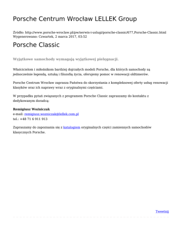 Porsche Centrum Wrocław LELLEK Group Źródło: http://www.porsche-wroclaw.pl/pw/serwis-i-uslugi/porsche-classic/677,Porsche-Classic.html Wygenerowano: Czwartek, 2 marca 2017, 03:52 Porsche Classic Wyjątkowe samochody wymagają wyjątkowej pielęgnacji. Właścicielom i miłośnikom bardziej dojrzałych modeli Porsche, dla których samochody są jednocześnie legendą, sztuką i filozofią życia, oferujemy pomoc w renowacji oldtimerów. Porsche Centrum Wrocław zaprasza Państwa do skorzystania z kompleksowej oferty usług renowacji klasyków oraz ich naprawy wraz z oryginalnymi częściami. W przypadku pytań związanych z programem Porsche Classic zapraszamy do kontaktu z dedykowanym doradcą: Remigiusz Woźniczak e-mail: [email protected] tel.: +48 71 6 911 913 Zapraszamy do zapoznania się z katalogiem oryginalnych części zamiennych samochodów klasycznych Porsche. Tweetnij