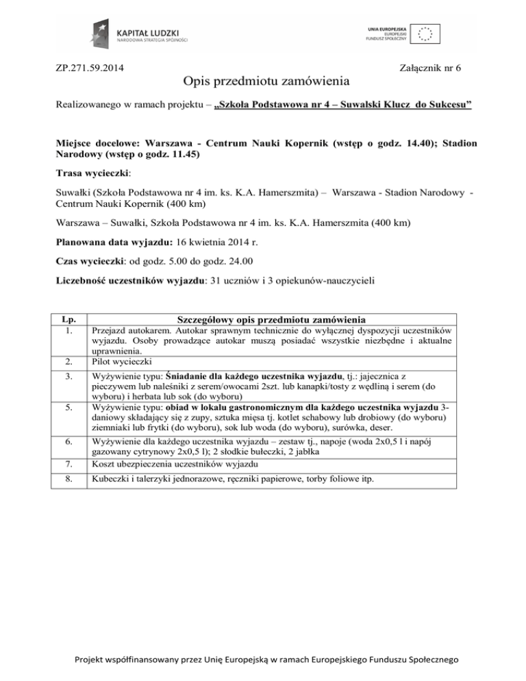 ZP.271.59.2014 Załącznik nr 6 Opis przedmiotu zamówienia Realizowanego w ramach projektu – „Szkoła Podstawowa nr 4 – Suwalski Klucz do Sukcesu” Miejsce docelowe: Warszawa - Centrum Nauki Kopernik (wstęp o godz. 14.40); Stadion Narodowy (wstęp o godz. 11.45) Trasa wycieczki: Suwałki (Szkoła Podstawowa nr 4 im. ks. K.A. Hamerszmita) – Warszawa - Stadion Narodowy Centrum Nauki Kopernik (400 km) Warszawa – Suwałki, Szkoła Podstawowa nr 4 im. ks. K.A. Hamerszmita (400 km) Planowana data wyjazdu: 16 kwietnia 2014 r. Czas wycieczki: od godz. 5.00 do godz. 24.00 Liczebność uczestników wyjazdu: 31 uczniów i 3 opiekunów-nauczycieli Lp. 1. 2. 3. 5. 6. Szczegółowy opis przedmiotu zamówienia Przejazd autokarem. Autokar sprawnym technicznie do wyłącznej dyspozycji uczestników wyjazdu. Osoby prowadzące autokar muszą posiadać wszystkie niezbędne i aktualne uprawnienia. Pilot wycieczki Wyżywienie typu: Śniadanie dla każdego uczestnika wyjazdu, tj.: jajecznica z pieczywem lub naleśniki z serem/owocami 2szt. lub kanapki/tosty z wędliną i serem (do wyboru) i herbata lub sok (do wyboru) Wyżywienie typu: obiad w lokalu gastronomicznym dla każdego uczestnika wyjazdu 3daniowy składający się z zupy, sztuka mięsa tj. kotlet schabowy lub drobiowy (do wyboru) ziemniaki lub frytki (do wyboru), sok lub woda (do wyboru), surówka, deser. 7. Wyżywienie dla każdego uczestnika wyjazdu – zestaw tj., napoje (woda 2x0,5 l i napój gazowany cytrynowy 2x0,5 l); 2 słodkie bułeczki, 2 jabłka Koszt ubezpieczenia uczestników wyjazdu 8. Kubeczki i talerzyki jednorazowe, ręczniki papierowe, torby foliowe itp. Projekt współfinansowany przez Unię Europejską w ramach Europejskiego Funduszu Społecznego