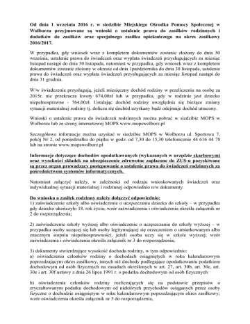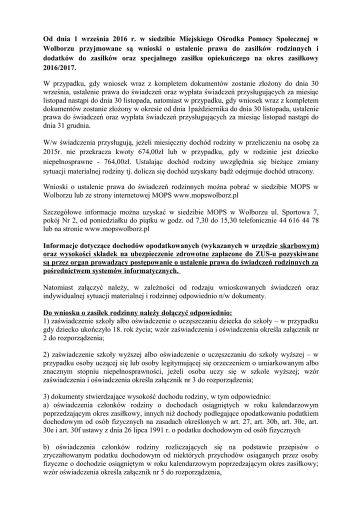 Od dnia 1 września 2016 r. w siedzibie Miejskiego Ośrodka Pomocy Społecznej w Wolborzu przyjmowane są wnioski o ustalenie prawa do zasiłków rodzinnych i dodatków do zasiłków oraz specjalnego zasiłku opiekuńczego na okres zasiłkowy 2016/2017. W przypadku, gdy wniosek wraz z kompletem dokumentów zostanie złożony do dnia 30 września, ustalenie prawa do świadczeń oraz wypłata świadczeń przysługujących za miesiąc listopad nastąpi do dnia 30 listopada, natomiast w przypadku, gdy wniosek wraz z kompletem dokumentów zostanie złożony w okresie od dnia 1października do dnia 30 listopada, ustalenie prawa do świadczeń oraz wypłata świadczeń przysługujących za miesiąc listopad nastąpi do dnia 31 grudnia. W/w świadczenia przysługują, jeżeli miesięczny dochód rodziny w przeliczeniu na osobę za 2015r. nie przekracza kwoty 674,00zł lub w przypadku, gdy w rodzinie jest dziecko niepełnosprawne - 764,00zł. Ustalając dochód rodziny uwzględnia się bieżące zmiany sytuacji materialnej rodziny tj. dolicza się dochód uzyskany bądź odejmuje dochód utracony. Wnioski o ustalenie prawa do świadczeń rodzinnych można pobrać w siedzibie MOPS w Wolborzu lub ze strony internetowej MOPS www.mopswolborz.pl Szczegółowe informacje można uzyskać w siedzibie MOPS w Wolborzu ul. Sportowa 7, pokój Nr 2, od poniedziałku do piątku w godz. od 7,30 do 15,30 telefonicznie 44 616 44 78 lub na stronie www.mopswolborz.pl Informacje dotyczące dochodów opodatkowanych (wykazanych w urzędzie skarbowym) oraz wysokości składek na ubezpieczenie zdrowotne zapłacone do ZUS-u pozyskiwane są przez organ prowadzący postępowanie o ustalenie prawa do świadczeń rodzinnych za pośrednictwem systemów informatycznych. Natomiast załączyć należy, w zależności od rodzaju wnioskowanych świadczeń oraz indywidualnej sytuacji materialnej i rodzinnej odpowiednio n/w dokumenty. Do wniosku o zasiłek rodzinny należy dołączyć odpowiednio: 1) zaświadczenie szkoły albo oświadczenie o uczęszczaniu dziecka do szkoły – w przypadku gdy dziecko ukończyło 18. rok życia; wzór zaświadczenia i oświadczenia określa załącznik nr 2 do rozporządzenia; 2) zaświadczenie szkoły wyższej albo oświadczenie o uczęszczaniu do szkoły wyższej – w przypadku osoby uczącej się lub osoby legitymującej się orzeczeniem o umiarkowanym albo znacznym stopniu niepełnosprawności, jeżeli osoba uczy się w szkole wyższej; wzór zaświadczenia i oświadczenia określa załącznik nr 3 do rozporządzenia; 3) dokumenty stwierdzające wysokość dochodu rodziny, w tym odpowiednio: a) oświadczenia członków rodziny o dochodach osiągniętych w roku kalendarzowym poprzedzającym okres zasiłkowy, innych niż dochody podlegające opodatkowaniu podatkiem dochodowym od osób fizycznych na zasadach określonych w art. 27, art. 30b, art. 30c, art. 30e i art. 30f ustawy z dnia 26 lipca 1991 r. o podatku dochodowym od osób fizycznych b) oświadczenia członków rodziny rozliczających się na podstawie przepisów o zryczałtowanym podatku dochodowym od niektórych przychodów osiąganych przez osoby fizyczne o dochodzie osiągniętym w roku kalendarzowym poprzedzającym okres zasiłkowy; wzór oświadczenia określa załącznik nr 5 do rozporządzenia, c) zaświadczenie właściwego organu gminy, nakaz płatniczy albo oświadczenie o wielkości gospodarstwa rolnego wyrażonej w hektarach przeliczeniowych ogólnej powierzchni w roku kalendarzowym poprzedzającym okres zasiłkowy; wzór oświadczenia określa załącznik nr 6 do rozporządzenia, d) umowę dzierżawy – w przypadku oddania części lub całości znajdującego się w posiadaniu rodziny gospodarstwa rolnego w dzierżawę, na podstawie umowy zawartej stosownie do przepisów o ubezpieczeniu społecznym rolników, albo oddania gospodarstwa rolnego w dzierżawę w związku z pobieraniem renty określonej w przepisach o wspieraniu rozwoju obszarów wiejskich ze środków pochodzących z Sekcji Gwarancji Europejskiego Funduszu Orientacji i Gwarancji Rolnej, e) umowę o wniesieniu wkładów gruntowych – w przypadku wniesienia gospodarstwa rolnego do użytkowania przez rolniczą spółdzielnię produkcyjną, f) odpis podlegającego wykonaniu orzeczenia sądu zasądzającego alimenty na rzecz osób w rodzinie lub poza rodziną lub odpis protokołu posiedzenia zawierającego treść ugody sądowej, lub odpis zatwierdzonej przez sąd ugody zawartej przed mediatorem, zobowiązujących do alimentów na rzecz osób w rodzinie lub poza rodziną, g) przekazy lub przelewy pieniężne dokumentujące wysokość zapłaconych alimentów, jeżeli członkowie rodziny są zobowiązani orzeczeniem sądu, ugodą sądową lub ugodą zawartą przed mediatorem do ich płacenia na rzecz osoby spoza rodziny, h) w przypadku, gdy osoba uprawniona nie otrzymała alimentów albo otrzymała je w wysokości niższej od ustalonej w orzeczeniu sądu, ugodzie sądowej lub ugodzie zawartej przed mediatorem: – zaświadczenie organu prowadzącego postępowanie egzekucyjne o całkowitej lub częściowej bezskuteczności egzekucji alimentów, a także o wysokości wyegzekwowanych alimentów, lub informację właściwego sądu lub właściwej instytucji o podjęciu przez osobę uprawnioną czynności związanych z wykonaniem tytułu wykonawczego za granicą albo o niepodjęciu tych czynności, w szczególności w związku z brakiem podstawy prawnej do ich podjęcia lub brakiem możliwości wskazania przez osobę uprawnioną miejsca zamieszkania dłużnika alimentacyjnego za granicą, jeżeli dłużnik zamieszkuje za granicą, i) dokument określający datę utraty dochodu oraz wysokość utraconego dochodu , j) dokument określający wysokość dochodu uzyskanego przez członka rodziny oraz liczbę miesięcy, w których dochód był osiągany – w przypadku uzyskania dochodu w roku kalendarzowym poprzedzającym okres zasiłkowy, k) dokument określający wysokość