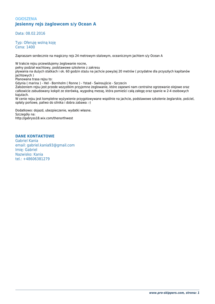 OGłOSZENIA Jesienny rejs żaglowcem s/y Ocean A Data: 08.02.2016 Typ: Oferuję wolną koję Cena: 1400 Zapraszam serdecznie na magiczny rejs 24 metrowym stalowym, oceanicznym jachtem s/y Ocean A W trakcie rejsu przewidujemy żeglowanie nocne, pełny podział wachtowy, podstawowe szkolenie z zakresu pływania na dużych statkach i ok. 60 godzin stażu na jachcie powyżej 20 metrów ( przydatne dla przyszłych kapitanów jachtowych ) Planowana trasa rejsu to: Gdynia ( marina ) - Hel - Bornholm ( Ronne ) - Ystad - Świnoujście - Szczecin Założeniem rejsu jest przede wszystkim przyjemne żeglowanie, które zapewni nam centralne ogrzewanie olejowe oraz całkowicie zabudowany kokpit ze sterówką, wygodną messę, która pomieści całą załogę oraz spanie w 2-4 osobowych kajutach. W cenie rejsu jest kompletne wyżywienie przygotowywane wspólnie na jachcie, podstawowe szkolenie żeglarskie, pościel, opłaty portowe, paliwo do silnika i dobra zabawa :-) Dodatkowo: dojazd, ubezpieczenie, wydatki własne. Szczegóły na: http://gabryss18.wix.com/thenorthwest DANE KONTAKTOWE Gabriel Kania email: [email protected] Imię: Gabriel Nazwisko: Kania tel.: +48606381279 www.pro-skippers.com, strona: 1