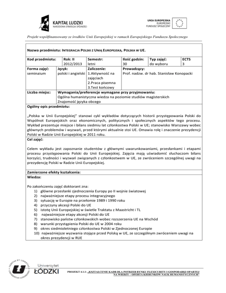 Projekt współfinansowany ze środków Unii Europejskiej w ramach Europejskiego Funduszu Społecznego Nazwa przedmiotu: INTEGRACJA POLSKI Z UNIĄ EUROPEJSKĄ. POLSKA W UE. Kod przedmiotu: Rok: II 2012/2013 Forma zajęć: Język: seminaium polski i angielski Semestr: Ilość godzin: Typ zajęć: ECTS letni 30 do wyboru 3 Zaliczenie: Prowadzący: 1.Aktywność na Prof. nadzw. dr hab. Stanisław Konopacki zajęciach 2.Praca pisemna 3.Test końcowy Liczba miejsc: Wymagania/preferencje wymagane przy przyjmowaniu: Ogólna humanistyczna wiedza na poziomie studiów magisterskich Znajomość języka obcego Ogólny opis przedmiotu: „Polska w Unii Europejskiej” stanowi cykl wykładów dotyczących historii przystępowania Polski do Wspólnot Europejskich oraz ekonomicznych, politycznych i społecznych aspektów tego procesu. Wykład prezentuje miejsce i bilans siedmiu lat członkostwa Polski w UE; stanowisko Warszawy wobec głównych problemów i wyzwań, przed którymi aktualnie stoi UE. Omawia rolę i znaczenie prezydencji Polski w Radzie Unii Europejskiej w 2011 roku. Cel zajęć: Celem wykładu jest zapoznanie studentów z głównymi uwarunkowaniami, przesłankami i etapami procesu przystępowania Polski do Unii Europejskiej. Zajęcia mają uświadomić słuchaczom bilans korzyści, trudności i wyzwań związanych z członkostwem w UE, ze zwróceniem szczególnej uwagi na prezydencję Polski w Radzie Unii Europejskiej. Zamierzone efekty kształcenia: Wiedza: Po zakończeniu zajęć doktorant zna: 1) główne przesłanki zjednoczenia Europy po II wojnie światowej 2) najważniejsze etapy procesu integracyjnego 3) sytuację w Europie na przełomie 1989 i 1990 roku 4) przyczyny akcesji Polski do UE 5) istotę Unii Europejskiej w świetle Traktatu z Maastricht i TL 6) najważniejsze etapy akcesji Polski do UE 7) stanowisko państw członkowskich wobec rozszerzenia UE na Wschód 8) warunki przystąpienia Polski do UE w 2004 roku 9) okres siedmioletniego członkostwa Polski w Zjednoczonej Europie 10) najważniejsze wyzwania stojące przed Polską w UE, ze szczególnym zwróceniem uwagi na okres prezydencji w RUE PROJEKT 4.1.1: „KSZTAŁCENIE KADR DLA POTRZEB RYNKU FLEXICURITY I GOSPODARKI OPARTEJ NA WIEDZY – OFERTA KIERUNKÓW NAUK HUMANISTYCZNYCH” Projekt współfinansowany ze środków Unii Europejskiej w ramach Europejskiego Funduszu Społecznego Umiejętności: Po zakończeniu kursu doktorant potrafi: 1) udowodnić sensowność i potrzebę zjednoczenia Europy po II wojnie światowej 2) wskazać w historii kluczowe etapy integracji europejskiej 3) analizować znaczenie wydarzeń przełomu 1989/1990 roku dla historii Europy 4) zinterpretować model UE w świetle Traktatu z Maastricht i Traktatu z Lizbony 5) zaprezentować przebieg akcesji Polski do Unii Europejskiej 6) przeprowadzić krytyczną interpretację stanowiska państw członkowskich UE wobec rozszerzenia 7) dobierać argumenty dla uzasadnienia swego stanowiska/opinii przy omawianiu problemu związanego z obecnością Polski w UE 8) decydować, które fakty mają istotne znaczenie dla analizowanego problemu 9) formułować adekwatny opis i ocenę zjawisk z zakresu integracji europejskiej/ stosunków międzynarodowych 10) łączyć różne fakty i elementy wydarzeń w sensowną całość oraz wyciągać wnioski 11) korzystać z różnych źródeł przy interpretowaniu procesów i zjawisk politycznych 12) zastosować zdobytą wiedzę dla artykułowania prognoz politycznych Inne kompetencje (postawy): Po ukończeniu kursu doktorant potrafi: 1) krytycznie oceniać przekazywaną wiedzę 2) stosować różnorodne strategie interpretacyjne 3) domyślać się ukrytych intencji, stojących za oficjalnymi stanowiskami politycznymi 4) odnosić konkretne fakty/wydarzenia do kontekstu sytuacyjnego 5) proponować różne scenariusze rozwoju wydarzeń Sposób sprawdzenia osiągnięcia efektów zamierzonych: 1. -‐ Pisemny tekst końcowy sprawdzający podstawową wiedzę studenta w zakresie terminologii oraz wiadomości faktograficznych zdobytych na zajęciach 2. -‐ Praca pisemna związana z tematem seminarium 3. -‐ W trakcie zajęć student będzie musiał odpowiadać na pytania, dyskutować, argumentować w formie zajęć kontaktowych w języku obcym. PROJEKT 4.1.1: „KSZTAŁCENIE KADR DLA POTRZEB RYNKU FLEXICURITY I GOSPODARKI OPARTEJ NA WIEDZY – OFERTA KIERUNKÓW NAUK HUMANISTYCZNYCH” Projekt współfinansowany ze środków Unii Europejskiej w ramach Europejskiego Funduszu Społecznego Szczegółowy opis przedmiotu (treści programowe): 1. Integracja Europy w okresie zimnej wojny; 2. Sytuacja międzynarodowa na przełomie lat 80 i 90 (zwycięstwo „Solidarności” w Polsce; rozpad ZSRR; zjednoczenie Niemiec); 3. Polska po 1989 roku – sytuacja wewnętrzna i polityka zagraniczna; 4. Relacje między Polska a Wspólnotami do 1991 roku; 5. Powstanie Unii Europejskiej w 1992 r.; 6. Droga Polski do UE w końcu XX w.; 7. Układ o Stowarzyszeniu; 8. UE wobec rozszerzenia na Wschód, 9. Negocjacje członkowskie, traktat akcesyjny i warunki członkostwa Polski w UE; 10. UE w świetle Traktatu z Lizbony; 11. Bilans siedmiu lat obecności w UE; Polska wobec problemów UE; 12. Polska promotorem polityki wschodniej UE; 13. Partnerstwo Wschodnie; 14. Prezydencja Polski w RUE w 2011 roku. 15. Polska wobec kryzysu strefy euro. 16. Stanowisko Warszawy wobec wydarzeń dotyczących południowych sąsiadów UE. 17. Jaki model zjednoczonej Europy leży w interesie Polski Uwaga: W języku angielskim odbędą się zajęcia dotyczące okresu po przystąpieniu Polski do UE w 2004 roku i jej miejsca z zjednoczonej Europie. Zalecana literatura: K. Łastawski, Od idei do integracji europejskiej, W-‐wa 2004 K. Popowicz, Historia integracji europejskiej, W-‐wa 2006 P. J. Borkowski, Polityczne teorie integracji międzynarodowej, Warszawa 2007 N. Davis, Europa, Kraków 2001 S. Parzymies, Stosunki międzynarodowe w Europie 1945-‐2004, Warszawa 2004 J. Łuk