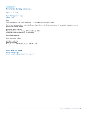 OGłOSZENIA Powrót do Europy na wiosnę Data: 21.10.2014 Typ: Oferuję wolną koję Cena: 2000 Ahoj! Przed nami jeszcze cała jesień i cała zima, a my już myślimy o wiosennym rejsie. Pod koniec marca planujemy powrót do Europy. Wypłyniemy z Karaibów, zatrzymamy się na Azorach i obierzemy kurs na Plymouth w Wielkiej Brytanii. Pokonamy razem 3500 mil. Rejs będzie trwał ponad miesiąc (29 marca-3 maja 2015). Prawdziwe „niedźwiedzie mięso” dla twardzieli! Kompletujemy załogę! Cena za miejsce: 2000 zł [email protected] www.sy.malbork.pl Biuro, Karolina: 882-165-602, Kapitan: 784-334-719 DANE KONTAKTOWE Karolina Dajewska email: [email protected] www.pro-skippers.com, strona: 1