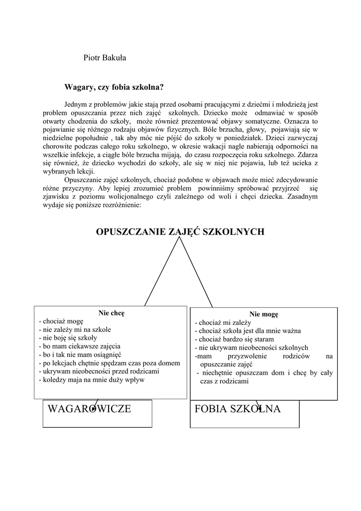 Piotr Bakuła Wagary, czy fobia szkolna? Jednym z problemów jakie stają przed osobami pracującymi z dziećmi i młodzieżą jest problem opuszczania przez nich zajęć szkolnych. Dziecko może odmawiać w sposób otwarty chodzenia do szkoły, może również prezentować objawy somatyczne. Oznacza to pojawianie się różnego rodzaju objawów fizycznych. Bóle brzucha, głowy, pojawiają się w niedzielne popołudnie , tak aby móc nie pójść do szkoły w poniedziałek. Dzieci zazwyczaj chorowite podczas całego roku szkolnego, w okresie wakacji nagle nabierają odporności na wszelkie infekcje, a ciągłe bóle brzucha mijają, do czasu rozpoczęcia roku szkolnego. Zdarza się również, że dziecko wychodzi do szkoły, ale się w niej nie pojawia, lub też ucieka z wybranych lekcji. Opuszczanie zajęć szkolnych, chociaż podobne w objawach może mieć zdecydowanie różne przyczyny. Aby lepiej zrozumieć problem powinniśmy spróbować przyjrzeć się zjawisku z poziomu wolicjonalnego czyli zależnego od woli i chęci dziecka. Zasadnym wydaje się poniższe rozróżnienie: OPUSZCZANIE ZAJĘĆ SZKOLNYCH Nie chcę - chociaż mogę - nie zależy mi na szkole - nie boję się szkoły - bo mam ciekawsze zajęcia - bo i tak nie mam osiągnięć - po lekcjach chętnie spędzam czas poza domem - ukrywam nieobecności przed rodzicami - koledzy maja na mnie duży wpływ W WAGAROWICZE Nie mogę - chociaż mi zależy - chociaż szkoła jest dla mnie ważna - chociaż bardzo się staram - nie ukrywam nieobecności szkolnych -mam przyzwolenie rodziców na opuszczanie zajęć - niechętnie opuszczam dom i chcę by cały czas z rodzicami FOBIA SZKOLNA Fobia szkolna Fobie są zaburzeniem nerwicowym. Klasyfikacja fobii opiera się na rodzaju czynnika wywołującego lęk, którym może być przedmiot lub sytuacja. Na przykład występuje lęk przed pająkami, wężami, grzybami, kwiatami, lub też lęk przed ciemnością, lęk przed zamkniętymi pomieszczeniami, lęk przed podróżą samolotem. Fobia szkolna w obrazie wydaje się być połączeniem fobii sytuacyjnej z fobią przedmiotową. Dziecko sprawia wrażenie, że boi się zarówno sytuacji jak i pewnych miejsc, bądź osób. Tak naprawdę jednak dziecko odczuwa lęk w kontekście sytuacji. Ciemny szkolny korytarz, przemierzany z mamą po zajęciach szkolnych, staje się obiektem całkowicie obojętnym. Wzbudzający trwogę nauczyciel spotkany po lekcjach na zakupach w sklepie staje się uroczym miłym panem, aby znów za kilka godzin przemienić się na lekcji w szkole w „krwiożerczego wampira” Dziecko panicznie bojące się załatwić swoje potrzeby fizjologiczne w toalecie szkolnej podczas zajęć, skorzysta z niej bez większych oporów, gdy przyjdzie z rodzicami na dzień otwarty, bądź mama go tam zaprowadzi. Jednym z założeń teoretycznych jest, że fobia szkolna ma swoje źródła w relacji rodzice - dziecko, a szkoła w pewnych okolicznościach staje się czynnikiem aktywizującym i wzmacniającym zaburzone relacje w rodzinie. Lęk przed separacją ze strony matki, która do tej pory była osobą niezastąpioną w opiece nad dzieckiem, a teraz tę opiekę ma oddać, przynajmniej na kilka godzin dziennie innym osobom, obawy przed krzywdą jaka może spotkać dziecko w nowej relacji interpersonalnej, powodują, że matka bardziej lub mniej świadomie wysyła do dziecka sygnały pełne niepokoju i lęku. Tak rozumiana fobia szkolna nie jest lękiem przed szkołą, a lękiem przed rozstaniem z matką. Również bardzo często dziecko słyszy komunikaty, że nie poradzi sobie w szkole - „a jak on sobie poradzi”, „jest taki malutki”, przecież ona taka chorowita” . Opiekunowie dziecka deprecjonują czasem jego nowe otoczenie społeczne, mówiąc, że w tej klasie „to sami chuligani, łobuzy i dzieci z marginesu. Te obawy rodziców, dziadków, babć dziecko zaczyna przyjmować za swoje i zamiast dzielnie „walczyć na froncie zmagań szkolnych” powoli zaczyna wycofywać się do świata, który już zna, do bezpiecznego świata z mamą, tatą i domem. Kolejną przyczyną mogącą wpływać na rozwój fobii szkolnej, jest mała gotowość rodziny do przejścia na następny etap rozwoju w życiu rodziny. Szczególnie widoczne jest to przy pierwszym – „to już mamy dziecko w szkole?” i ostatnim dziecku - „to już nasze ostatnie maleństwo idzie do szkoły” Rodzice sami nie będąc gotowymi na kolejny etap, nie dają dziecku wystarczającej przestrzeni umożliwiającej jego rozwój i stawanie się autonomiczną od rodziców jednostką. Wygląda to trochę tak, jakby rodzice chcieli zatrzymać czas, tak, aby ich dziecko było ciągle tym słodkim maleństwem. Kilka przyczyn podtrzymujących u dziecka odmowę chodzenia do szkoły • Nagradzające doświadczenia pozaszkolne. Dzieci pragną pozostać w domu, dlatego, że dzięki temu mogą oddawać się ulubionym zajęciom takim jak oglądanie telewizji, grą na komputerze, przebywaniem z rodzicami • • • • • Skupienie uwagi rodziny na dolegliwościach somatycznych dziecka. Dziecko swoimi objawami uzyskuje gratyfikacje ze strony rodziców, opiekunów. Dziecko staje w samym centrum zainteresowania domowników. Wszyscy się o niego troszczą i interesują stanem jego zdrowia Ucieczka od nieprzyjemnych doświadczeń związanych z relacjami interpersonalnymi z rówieśnikami Ucieczka od sytuacji związanych z oceną postępów w nauce Unikanie miejsc w szkole budzących u dziecka lęk Chęć uniknięcia kontaktu z nauczycielem lub nauczycielami wywołującymi u dziecka lęk Diagnoza Aby móc stwierdzić, że to co się dzieje z dzieckiem jest fobią szkolną musimy przeanalizować całość funkcjonowania dziecka w zakresie ogólnym, oraz w odniesieniu do problemu chodzenia do szkoły Bywa tak, ze dziecko odmawia chodzenia do szkoły bojąc się zostawić w domu matkę, która będzie narażona na przemoc ze strony pijącego ojca, lub też musi pilnować swojej
