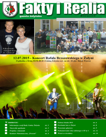 Fakty i Realia - gazeta żołyńska o Miesięcznik Egzemplarz bezpłatny Nr 7 (201) lipiec 2015 ISSN 1733-3253 R.Brzozowski i M.Kątnik-Kowalska fot. J.Tomczyk Niezwykłe spotkanie, czyt. str. 3 12.07.2015 - Koncert Rafała Brzozowskiego w Żołyni O pikniku z firmą DOM-BUD i Gminą Żołynia czyt. na str. 10 (fot. Marek Wawro) W numerze: Zielona Szkoła 2015 str. 6 Informacja o sesji Rady Gminy Żołynia str. 2 Powitanie lata w Żołyni str. 8 Niezwykłe spotkanie str. 3 Warsztaty gitarowe str. 9 Projekty z ekonomii str. 4 Nr nr 7 (201) lipiec 2015 Podsumowanie roku szklonego w SP 1 str. 11 Konkurs Matematyczny „Procent” str. 5 Wieści ze strzelnicy str. 14 2 Fakty i Realia - gazeta żołyńska Sprawy gminy Informacje o sesji Rady Gminy VI sesja Rady Gminy Żołynia odbyła się 23 czerwca 2015 r.. Porządek obrad obejmował informację na temat bezpieczeństwa publicznego w gminie oraz podjęcie dwudziestu uchwał, w tym w sprawie udzielenia wójtowi gminy absolutorium z tytułu wykonania budżetu gminy na 2014 r., a także w sprawie ustalenia stawek opłat za wywóz odpadów. S esja Rady Gminy rozpoczęła się od wystąpienia Komendanta Komendy Powiatowej Policji w Łańcucie, komisarza Andrzeja Żygadło, który przedstawił informację o stanie bezpieczeństwa publicznego w Gminie Żołynia. Sprawozdanie obejmowało okres pięciu pierwszych miesięcy 2015 roku. W statystykach policji łącznie na terenie gminy zanotowano 150 zdarzeń o charakterze kryminalnym oraz związanych z ruchem drogowym, w tym: 6 kradzieży, 3 kradzieże z włamaniem, 2 zniszczenia cudzej rzeczy, 1 przestępstwo narkotykowe, 2 oszustwa internetowe, 2 wypadki drogowe (w nich obrażeń ciała doznały 2 osoby) oraz 14 kolizji. Policja interweniowała 91 razy, w tym 63 w sytuacjach publicznych, 25 w domowych (tu 3 interwencje związane były z przemocą domową). Komisarz określił stan bezpieczeństwa publicznego w gminie jako poprawny, zaznaczając, że w analizowanym okresie nie było przestępstw najcięższych, tj. zbrodni, rozboi, wymuszeń rozbójniczych czy pobić. Komisarz, który pełni obowiązki komendanta łańcuckiej komendy od 1 stycznia 2014 r. powiedział, że zależy mu na bliższej współpracy ze społecznością lokalną, z radnymi i sołtysami. Z okazji 25-lecia samorządu terytorialnego komendant złożył na ręce przewodniczącej rady oraz wójta gminy podziękowania za współpracę i jubileuszowe gratulacje. Następnie radni podjęli uchwały w następujących sprawach: a) zatwierdzenia sprawozdania finansowego Gminy Żołynia za 2014 rok, b) udzielenia Wójtowi Gminy Żołynia absolutorium z tytułu wykonania budżetu za 2014 rok, c) zmian w budżecie Gminy Żołynia Nr 7 (201) lipiec 2015 na 2015 r., d) zmiany Wieloletniej Prognozy Finansowej Gminy Żołynia, e) ustalenia stawki opłaty za gospodarowanie odpadami komunalnymi, f) przyjęcia lokalnego programu wyrównywania szans edukacyjnych dzieci i młodzieży uczęszczających do Zespołu Szkół w Żołyni, g) udzielenia pomocy rzeczowej Powiatowi Łańcuckiemu, h) zaliczenia drogi do kategorii dróg publicznych, i) zmiany uchwały w sprawie przystąpienia do II zmiany Studium Uwarunkowań i Kierunków Zagospodarowania Przestrzennego Gminy Żołynia, j) zmiany Statutu Gminnego Ośrodka Pomocy Społecznej w Żołyni, k) nabycia nieruchomości przez Gminę Żołynia, l) wyrażenia zgody na dzierżawę nieruchomości mienia komunalnego na czas nieoznaczony w trybie bezprzetargowym, m) sprzedaży nieruchomości stanowiącej własność Gminy Żołynia, n) ustanowienia służebności na nieruchomości mienia komunalnego, o) sprzedaży nieruchomości stanowiących własność Gminy Żołynia, p) powołania zespołu ds. opiniowania kandydatów na ławników do orzekania w Sądzie Okręgowym w Rzeszowie oraz Sądzie Rejonowym w Łańcucie. r) uchylenia uchwały w sprawie ustanowienia służebności na nieruchomości mienia komunalnego, s) terminu, częstotliwości i trybu uiszczania opłaty za gospodarowanie odpadami komunalnymi, t) wyrażenia zgody na zawarcie z Gminami z terenu Powiatu Łańcuckiego porozumienia w sprawie wspólnego przeprowadzenia postępowania o udzielenie zamówienia publicznego na dostawę energii elektrycznej, u) zamiany nieruchomości położonych w Brzózie Stadnickiej. Sprawozdanie z wykonania budżetu gminy na 2014 r. było przedmiotem posiedzeń wszystkich komisji rady gminy, tak więc podczas sesji wójt gminy Andrzej Benedyk powrócił tylko do najważniejszych kwestii. Powiedział, że pod względem finansowym tak po stronie dochodów jak i wydatków plan wykonano w 90%, natomiast rzeczowo zaplanowane zadania zostały wykonane. W związku z tym część płatności za zadania roku 2014 zrealizowano w roku 2015. Wójt podał, że zadłużenie gminy na koniec roku 2014 wyniosło 7,7 mln zł, co stanowi 33% rocznych dochodów gminy, natomiast wartość księgowa majątku gminy to 55 mln zł. Po rozpatrzeniu sprawozdania rada jednogłośnie podjęła uchwałę w sprawie udzielenia wójtowi absolutorium z tytułu wykonania budżetu na 2014 r. Warto również zwrócić uwagę na dwie uchwały związane z gospodarką odpadami. Rada ustaliła nowe stawki za wywóz śmieci. Pomimo tego, że przetarg na usługę wywozu przeprowadzano trzykrotnie, uzyskana w jego wyniku cena jest o 45% wyższa od dotychczasowej. Przetarg, z najtańszą ofertą, wygrała firma MZK z Leżajska. Od lipca 2015 r. cena wywozu śmieci wyniesie miesięcznie 19 zł od gospodarstwa domowego przy prowadzeniu selektywnej zbiórki odpadów (dotąd było to 14,60 zł), natomiast gospodarstwa nieprowadzące segregacji zapłacą 38 zł (dotąd - 30 zł). Dodatkowe informacje związane ze zmianą cen wywozu odpadów podajemy na str. 15 niniejszego wydania „Faktów...”. W kolejnej uchwale rada ustaliła, że opłata za wywóz odpadów uiszczana będzie kwartalnie i nie później niż do dwudziestego dnia trzeciego miesiąca kwartału, w kt