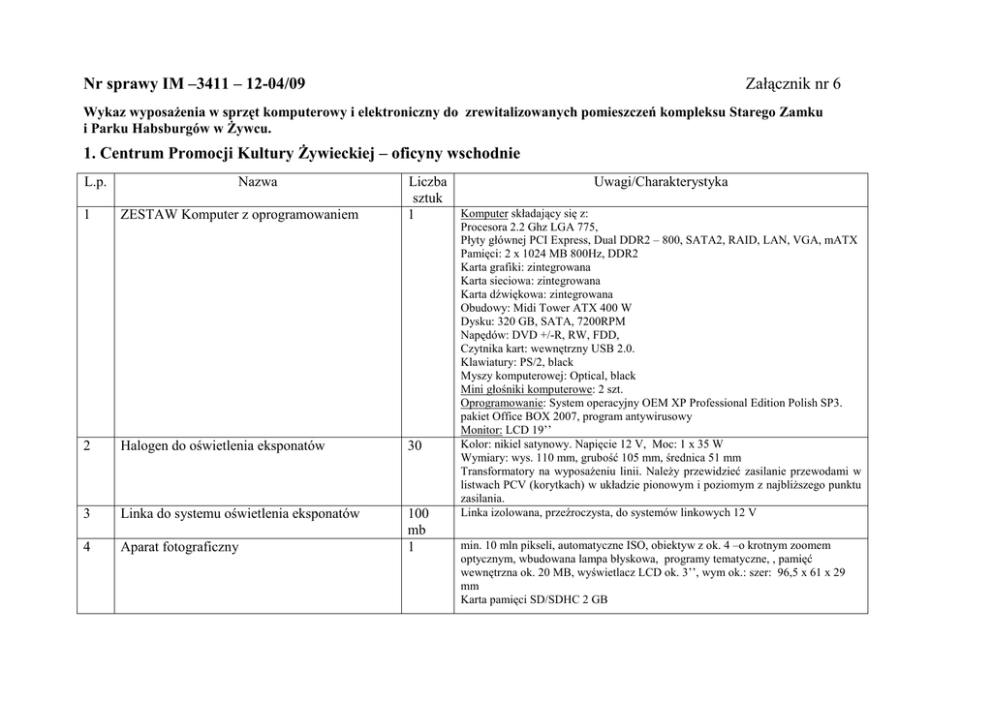 Nr sprawy IM –3411 – 12-04/09 Załącznik nr 6 Wykaz wyposaŜenia w sprzęt komputerowy i elektroniczny do zrewitalizowanych pomieszczeń kompleksu Starego Zamku i Parku Habsburgów w śywcu. 1. Centrum Promocji Kultury śywieckiej – oficyny wschodnie L.p. 1 Nazwa ZESTAW Komputer z oprogramowaniem Liczba Uwagi/Charakterystyka sztuk Komputer składający się z: 1 2 Halogen do oświetlenia eksponatów 30 3 Linka do systemu oświetlenia eksponatów 4 Aparat fotograficzny 100 mb 1 Procesora 2.2 Ghz LGA 775, Płyty głównej PCI Express, Dual DDR2 – 800, SATA2, RAID, LAN, VGA, mATX Pamięci: 2 x 1024 MB 800Hz, DDR2 Karta grafiki: zintegrowana Karta sieciowa: zintegrowana Karta dźwiękowa: zintegrowana Obudowy: Midi Tower ATX 400 W Dysku: 320 GB, SATA, 7200RPM Napędów: DVD +/-R, RW, FDD, Czytnika kart: wewnętrzny USB 2.0. Klawiatury: PS/2, black Myszy komputerowej: Optical, black Mini głośniki komputerowe: 2 szt. Oprogramowanie: System operacyjny OEM XP Professional Edition Polish SP3. pakiet Office BOX 2007, program antywirusowy Monitor: LCD 19’’ Kolor: nikiel satynowy. Napięcie 12 V, Moc: 1 x 35 W Wymiary: wys. 110 mm, grubość 105 mm, średnica 51 mm Transformatory na wyposaŜeniu linii. NaleŜy przewidzieć zasilanie przewodami w listwach PCV (korytkach) w układzie pionowym i poziomym z najbliŜszego punktu zasilania. Linka izolowana, przeźroczysta, do systemów linkowych 12 V min. 10 mln pikseli, automatyczne ISO, obiektyw z ok. 4 –o krotnym zoomem optycznym, wbudowana lampa błyskowa, programy tematyczne, , pamięć wewnętrzna ok. 20 MB, wyświetlacz LCD ok. 3’’, wym ok.: szer: 96,5 x 61 x 29 mm Karta pamięci SD/SDHC 2 GB 5 Zestaw multimedialny 1 kpl. Laptop 15,4’’: procesor 1,8 GHz, 2048 MB DDR2 667 MHz, 160 GB SATA (5400 obr/min), grafika 256 MB, 10/100 Mbps Ethernet, karta sieci bezprzewodowej, bluetooth, DVD +/-RW Oprogramowanie: System operacyjny XP Proffesional Edition SP3. pakiet Office 2007, program antywirusowy Ekran projekcyjny: elektryczny, wym. 210 x 210, stacjonarny, elektrycznie rozwijany. NaleŜy przewidzieć zasilanie przewodami w listwach PCV (korytkach) w układzie pionowym i poziomym z najbliŜszego punktu zasilania. Projektor multimedialny Rozdzielczość: WXGA (1280x800), UXGA (1600x1200) Jasność: 3000 ANSI lumenów Kontrast: 2000:1 Optyka: F=1,58:1,68/f=16,1:19,3mm Wbudowany głośnik 2. Centrum Informacji Kulturalno – Turystycznej L.p. 1 Nazwa Zestaw komputerowy z oprogramowaniem (komputer stacjonarny) Liczba sztuk 1 Uwagi/Charakterystyka Komputer składający się z: procesor Intel Core 2 Quad Q8200 pamięć operacyjna RAM 4 GB karta graficzna NVIDIA GeForce 9800GT dysk twardy 500 GB 2 złącza DVI Monitor 19” Czytnik kart, Klawiatura PS/2 Mysz optyczna Głośniki 2szt Oprogramowanie: System Windows Vista Home Premium z moŜliwością aktualizacji do Windows 7, Office 2007 box, oprogramowanie antywirusowe. 2 Laptop 2 NajwaŜniejsze parametry: matryca 15,4’’ WXGA procesor Intel Core 2 Duo T6400 2.0GHz/800MHz FSB/2MB cache karta graficzna nVidia G120 GT 1024MB dysk twardy 320 GB pamięć operacyjna 4 GB Oprogramowanie: System Windows Vista Home Premium z moŜliwością aktualizacji do Windows 7, Office 2007 box, oprogramowanie antywirusowe. 3 Skaner z oprogramowaniem 1 Zastosowanie: zdjęcia, ilustraje, tekst, OCR, obiekty 3D (odstające od szyby skanera), slajdy i negatywy Rozdzielczość optyczna :3.200 x 6.400 dpi Rozdzielczość interpolowana: 24.000 dpi Kolor: 48 bitów wewn/zewn Obszar skanowania: > A4 1 szt. ADSL/ADSL2 + kompatybilny ze standardami: ANSI T1.413 Issue 2, ITU-T G.dmt, ITU-T G.lite i jest przygotowane do pracy w standardzie Annex A/B, cztery porty LAN FastEthernet 100 Mbps. Przełącznik sieciowy- 16 portów FastEthernet 4 Ruter - 1 szt. Zgodność ze standardami IEEE 802.3, 802.3u i 802.3x 16 złączy kabli typu skrętka 10/100 Mb/s NWay (RJ-45) Automatyczne rozpoznawanie szybkości połączenia NWay (autosensing)) Automatyczne rozpoznawanie trybu pełno-/półdupleksowego NWay (automatyczna negocjacja) Gniazdo rozszerzenia na opcjonalny moduł z 2 złączami światłowodowymi 100 Mb/s (SC) Automatyczne rozpoznawanie adresów sprzętowych uŜytkowników (MAC) Kontrola przepływu w trybie pełnodupleksowym Propagacja natłoku w trybie półdupleksowym Automatyczne dopasowanie do zamiany MDI/MDI-X na kaŜdym złączu Dodatkowo: moŜliwość blokady wybranych stron www VPN DDNS 3. Centrum Informacji Kulturalno – Turystycznej - Publiczny Punkt Dostępu do Internetu L.p. 1 Nazwa Komputer z oprogramowaniem Liczba Uwagi/Charakterystyka sztuk 4 NajwaŜniejsze parametry: Komputer stacjonarny składający się z: procesor Intel Core 2 Quad Q8200 pamięć operacyjna RAM 4 GB karta graficzna NVIDIA GeForce 9800GT dysk twardy 500 GB 2 złącza DVI Monitor 19” Czytnik kart, Klawiatura PS/2 Mysz optyczna Słuchawki z mikrofonem Oprogramowanie: System Windows Vista Home Premium z moŜliwością aktualizacji do Windows 7, Office 2007 box, oprogramowanie antywirusowe. 4. Centrum Informacji Kulturalno – Turystycznej – Sala prelekcyjna Lp 1 Nazwa Laptop Liczba UWAGI/Charakterystyka sztuk NajwaŜniejsze parametry: 1 matryca 17.3" WXGA z podświetleniem LED procesor Intel Core 2 Duo T6400 2.0GHz/800MHz FSB/2MB cache karta graficzna nVidia G120 GT 1024MB dysk twardy 320 GB pamięć operacyjna 4 GB Oprogramowanie: System Windows Vista Home Premium z moŜliwością aktualizacji do Windows 7, Office 2007 box, oprogramowanie antywirusowe. 2 Sprzęt nagłaśniający 1 4 głośniki 100 W, wzmacniacz 4 x 100 W . Zamontowane w sposób zapewniający optymalne nagłośnienie pomieszczenia poddasza 3 Zestaw multimedialny 1 kpl Laptop : matryca 15,4’’ WXGA, procesor Intel Core 2 Duo T6400 2.0GHz/800MHz FSB/2MB cache, karta graf. nVidia G120 GT 1024MB, dysk twardy 320 GB, pamięć operacyjna 4 GB Oprogramowanie: System Windows Vista Home Premium z moŜliwością aktualizacji do Windows 7, Office 2007 box, oprogramowanie ant