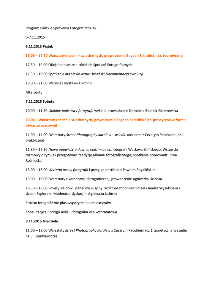 Program Łódzkie Spotkania Fotograficzne #2 6-7.11.2015 6.11.2015 Piątek 16.00 – 17.30 Warsztaty z technik szlachetnych, prowadzenie Bogdan Sałaciński (cz. teoretyczna) 17.30 – 19.00 Oficjalne otwarcie Łódzkich Spotkań Fotograficznych. 17.30 – 19.00 Spotkanie autorskie Artur Urbański Dokumentacja ewolucji 19.00 – 21.00 Wernisaż wystawy Ukraina. Afterparty 7.11.2015 Sobota 10.00 – 11.30 Solidne podstawy fotografii wykład, prowadzenie Dominika Bieniek-Gierszewska 10.00 – Warsztaty z technik szlachetnych, prowadzenie Bogdan Sałaciński (cz. praktyczna w formie otwartej pracowni) 11.00 – 14.00 Warsztaty Street Photography Karolew – osiedle nieznane z Cezarym Pecoldem (cz.1 praktyczna) 11.30 – 12.30 Nowa opowieść o dawnej Łodzi – pokaz fotografii Wacława Bilińskiego. Wstęp do rozmowy o tym jak przygotować reedycje albumu fotograficznego; spotkanie poprowadzi Ewa Rożniecka 13.00 – 16.00 Kryteria oceny fotografii i przegląd portfolio z Pawłem Rogalińskim 13.00 – 16.00 Warsztaty z kompozycji fotograficznej, prowadzenie Agnieszka Ucińska 16.30 – 18.00 Pokazy slajdów i panel dyskusyjny Ocalić od zapomnienia Aleksandra Wysokińska i Urban Explorers. Moderator dyskusji – Agnieszka Ucińska Stoisko fotograficzne plus wypożyczalnia obiektywów Konsultacje z Rodrigo Avila – fotografia wielkoformatowa 8.11.2015 Niedziela 11.00 – 13.00 Warsztaty Street Photography Karolew z Cezarym Pecoldem (cz.1 teoretyczna w studio na ul. Sienkiewicza)