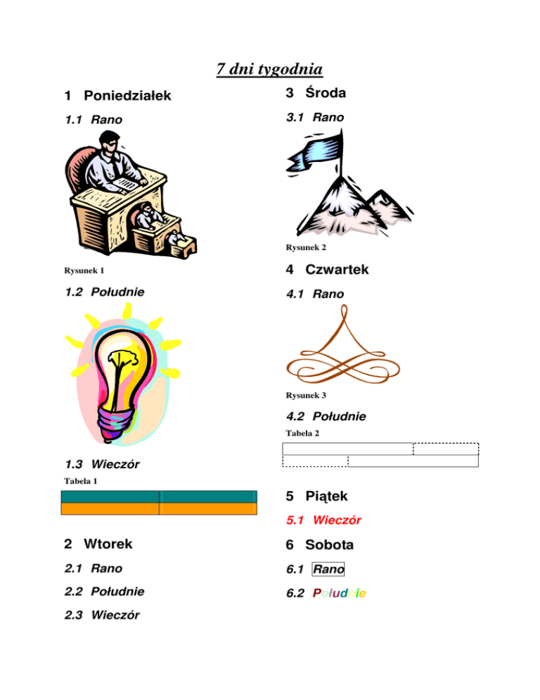 7 dni tygodnia 1 Poniedziałek 3 Środa 1.1 Rano 3.1 Rano Rysunek 2 Rysunek 1 4 Czwartek 1.2 Południe 4.1 Rano Rysunek 3 4.2 Południe Tabela 2 1.3 Wieczór Tabela 1 5 Piątek 5.1 Wieczór 2 Wtorek 6 Sobota 2.1 Rano 6.1 Rano 2.2 Południe 6.2 Południe 2.3 Wieczór 7 Niedziela 7.3 Wieczór 7.1 Rano Rysunek 4 7.2 Południe Rysunek 5 Powyższego dokumentu wygeneruj spisy: a) Spis treści b) spis tabel c) spis ilustarcji Rysunek 6
