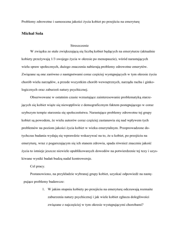 Problemy zdrowotne i samoocena jakości życia kobiet po przejściu na emeryturę Michał Sola Streszczenie W związku ze stale zwiększającą się liczbą kobiet będących na emeryturze (aktualnie kobiety przeżywają 1/3 swojego życia w okresie po menopauzie), wśród narastających wielu spraw społecznych, dużego znaczenia nabierają problemy zdrowotne emerytów. Związane są one zarówno z następstwami coraz częściej występujących w tym okresie życia chorób wielu narządów, a przede wszystkim chorób wewnętrznych, narządu ruchu i ginkologicznych oraz zaburzeń natury psychicznej. Obserwowane w ostatnim czasie wzrastające zainteresowanie problematyką starzejących się kobiet wiąże się niewątpliwie z demograficznym faktem postępującego w coraz szybszym tempie starzenia się społeczeństwa. Narastające problemy zdrowotne tej grupy kobiet są powodem, że wielu autorów coraz częściej zastanawia się nad wpływem tych problemów na poziom jakości życia kobiet w wieku emerytalnym. Przeprowadzone dotychczas badania wydają się wprawdzie wskazywać na to, że u kobiet, po przejściu na emeryturę, wraz z pogarszającym się ich stanem zdrowia, spada również znacznie jakość życia to istnieje jeszcze niewiele opublikowanych dowodów na potwierdzenie tej tezy i uzyskiwane wyniki badań budzą nadal kontrowersje. Cel pracy. Postanowiono, na przykładzie wybranej grupy kobiet, uzyskać odpowiedź na następujące problemy badawcze: 1. W jakim stopniu kobiety po przejściu na emeryturę odczuwają rozmaite zaburzenia natury psychicznej i jak wiele kobiet zgłasza dolegliwości związane z najczęściej w tym okresie występującymi chorobami? 2. Jaki jest poziom wiedzy badanych kobiet na temat zachowań prozdrowotnych? 3. Jaki jest poziom jakości życia kobiet po przejściu na emeryturę? Materiał i metodyka. Badaniom poddano grupę 504 przebywających na emeryturze kobiet w wieku powyżej 60 roku życia. Badania przeprowadzono w 2010 i 2011 roku. Badaniom poddano pacjentki, mieszkanki jednej dzielnicy miasta, zgłaszające się do swojej Przychodni Rejonowej. Celem wizyt były aktualne dolegliwości, kontynuacja leczenia, badania kontrolne i profilaktyczne. Zależnie od wieku kobiety podzielono na trzy podgrupy: 1 podgrupa – 188 kobiet w wieku 60 do 65 lat. 2 podgrupa – 196 kobiet w wieku 66 do 75 lat. 3 podgrupa – 120 kobiet w wieku ponad 75 lat. Badania wykonywano przy pomocy ankiety własnego autorstwa oraz dwóch standaryzowanych kwestionariuszy służących do subiektywnej oceny jakości życia – Skali Cantrila i Skali Samooceny SES. Wyniki badań. Zwrócono uwagę na skalę problemu jakim były u kobiet przebywających na emeryturze choroby narządu ruchu i choroby wewnętrzne oraz wysiłkowe nietrzymanie moczu i zapalenia narządów płciowych. Uzyskane wyniki badań wyraźnie wskazywały na to, że niemal każda przebywająca na emeryturze kobieta, niezależnie od wieku i czasu trwania emerytury, posiadała choroby, które w mniejszym lub większym stopniu były dla niej dokuczliwym problemem zdrowotnym. Głównym problemem zdrowotnym dotyczącym sfery emocjonalnej wybranej grupy kobiet przebywających na emeryturze były, niezależnie od wieku, zakłócenia natury psy- chicznej pod postacią zaburzeń snu, pamięci i trudności w koncentracji. W okresie wczesnej starości coraz więcej kobiet zaczynało też odczuwać osamotnienie, które potęgowało się znacznie w okresie późnej starości, w wieku powyżej 75 roku życia. Wyniki badań własnych pozwoliły na stwierdzenie, że większość przebywających na emeryturze wybranych do badania kobiet wykazywała dużą znajomość zachowań prozdrowotnych i świadomie kierowała stanem swego zdrowia. Wraz z postępującym wiekiem, w miarę upływu lat przebywania na emeryturze, poziom jakości życia kobiet, mierzony skalą Cantrila, stopniowo malał. W okresie obejmującym pierwsze lata po przejściu na emeryturę (60 – 65 lat) prawie połowa badanych kobiet wykazywała wysoki poziom jakości życia. Wraz z wiekiem, w miarę trwania emerytury, w ok.resie wczesnej starości (66 – 75 lat), liczba niezadowolonych z życia kobiet znacznie wzrosła i na tym wysokim poziomie utrzymywała się w późnej starości (wiek ponad 75 lat). Do określenia poziomu jakości życia na podstawie ogólnej samooceny badanych kobiet, czyli skali spostrzegania wartości swojej osoby (samowiedzy), zastosowano skalę samooceny SES M.Rosenberga w adaptacji Dzwonkowskiej i wsp. Różnice w poziomie jakości życia kobiet w trzech badanych grupach okazały się statystycznie istotne z prawdopodobieństwem 0,95. Oznaczało to, że w każdej kolejnej starszej wiekowo badanej grupie 95% kobiet wykazywało niższy poziom jakości życia, niż w grupie młodszej. Dokonane obliczenia statystyczne przy użyciu testu chi-kwadrat potwierdziły powyższe spostrzeżenia i wykazały, że poziom samooceny zależał od wieku kobiet. Im kobiety były starsze, tym poziom samooceny był niższy. Uzyskana wartość współczynnika kontyngencji postaci C = 0,42 wskazywała jednak wyraźnie na umiarkowaną zależność poziomu samooceny od wieku kobiet. Zanotowano, że przeważającą większość (91,5%) kobiet w pierwszych latach na emeryturze, cechował w ocenie jakości życia umiarkowany optymizm. W latach następnych ten umiarkowany optymizm zmniejszył się znacznie i w wieku 75 lat dotyczył 50% kobiet. Wyniki dotyczące oceny poziomu jakości życia otrzymane w oparciu o kwestionariusz SES z wynikami oceny jakości życia uzyskanymi przez ankietowane kobiety w skali Cantrila. Oceniając więc jakość życia za pomocą dwóch służących do jej pomiaru narzędzi można przyjąć, że w wybranej do badania grupie kobiet przebywających na emeryturze, w miarę upływu czasu, liczba niezadowolonych z życia kobiet wzrastała i po 75 roku życia przekroczyła 50%. Dokonując charakterystyki socjoekonomicznej badanej, wybran