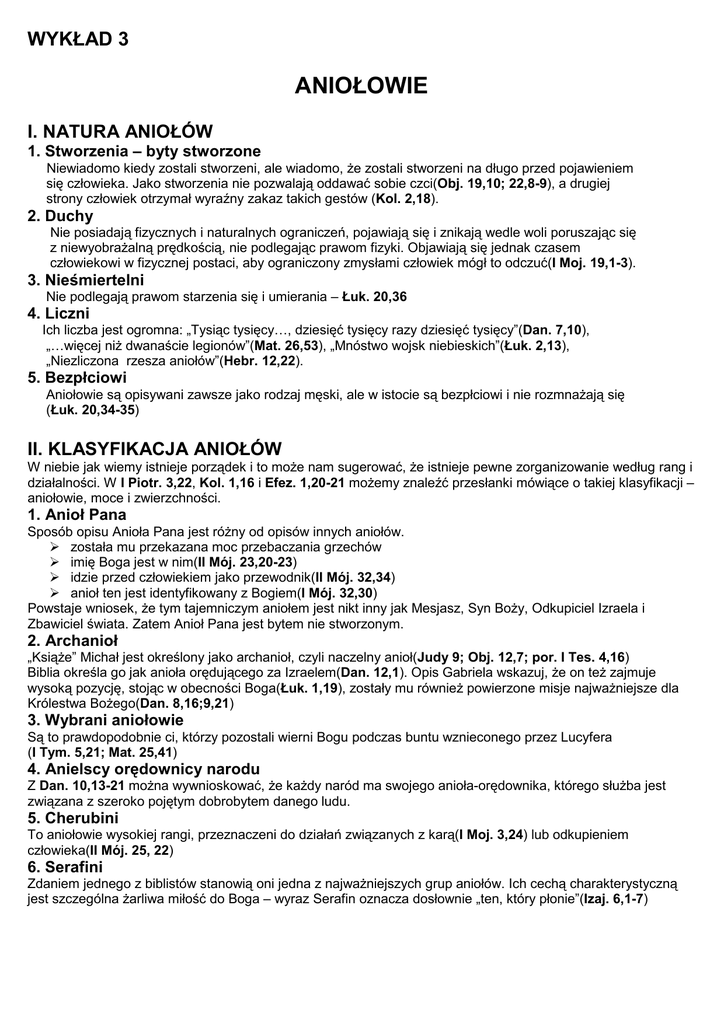 WYKŁAD 3 ANIOŁOWIE I. NATURA ANIOŁÓW 1. Stworzenia – byty stworzone Niewiadomo kiedy zostali stworzeni, ale wiadomo, Ŝe zostali stworzeni na długo przed pojawieniem się człowieka. Jako stworzenia nie pozwalają oddawać sobie czci(Obj. 19,10; 22,8-9), a drugiej strony człowiek otrzymał wyraźny zakaz takich gestów (Kol. 2,18). 2. Duchy Nie posiadają fizycznych i naturalnych ograniczeń, pojawiają się i znikają wedle woli poruszając się z niewyobraŜalną prędkością, nie podlegając prawom fizyki. Objawiają się jednak czasem człowiekowi w fizycznej postaci, aby ograniczony zmysłami człowiek mógł to odczuć(I Moj. 19,1-3). 3. Nieśmiertelni Nie podlegają prawom starzenia się i umierania – Łuk. 20,36 4. Liczni Ich liczba jest ogromna: „Tysiąc tysięcy…, dziesięć tysięcy razy dziesięć tysięcy”(Dan. 7,10), „…więcej niŜ dwanaście legionów”(Mat. 26,53), „Mnóstwo wojsk niebieskich”(Łuk. 2,13), „Niezliczona rzesza aniołów”(Hebr. 12,22). 5. Bezpłciowi Aniołowie są opisywani zawsze jako rodzaj męski, ale w istocie są bezpłciowi i nie rozmnaŜają się (Łuk. 20,34-35) II. KLASYFIKACJA ANIOŁÓW W niebie jak wiemy istnieje porządek i to moŜe nam sugerować, Ŝe istnieje pewne zorganizowanie według rang i działalności. W I Piotr. 3,22, Kol. 1,16 i Efez. 1,20-21 moŜemy znaleźć przesłanki mówiące o takiej klasyfikacji – aniołowie, moce i zwierzchności. 1. Anioł Pana Sposób opisu Anioła Pana jest róŜny od opisów innych aniołów. została mu przekazana moc przebaczania grzechów imię Boga jest w nim(II Mój. 23,20-23) idzie przed człowiekiem jako przewodnik(II Mój. 32,34) anioł ten jest identyfikowany z Bogiem(I Mój. 32,30) Powstaje wniosek, Ŝe tym tajemniczym aniołem jest nikt inny jak Mesjasz, Syn BoŜy, Odkupiciel Izraela i Zbawiciel świata. Zatem Anioł Pana jest bytem nie stworzonym. 2. Archanioł „KsiąŜe” Michał jest określony jako archanioł, czyli naczelny anioł(Judy 9; Obj. 12,7; por. I Tes. 4,16) Biblia określa go jak anioła orędującego za Izraelem(Dan. 12,1). Opis Gabriela wskazuj, Ŝe on teŜ zajmuje wysoką pozycję, stojąc w obecności Boga(Łuk. 1,19), zostały mu równieŜ powierzone misje najwaŜniejsze dla Królestwa BoŜego(Dan. 8,16;9,21) 3. Wybrani aniołowie Są to prawdopodobnie ci, którzy pozostali wierni Bogu podczas buntu wznieconego przez Lucyfera (I Tym. 5,21; Mat. 25,41) 4. Anielscy orędownicy narodu Z Dan. 10,13-21 moŜna wywnioskować, Ŝe kaŜdy naród ma swojego anioła-orędownika, którego słuŜba jest związana z szeroko pojętym dobrobytem danego ludu. 5. Cherubini To aniołowie wysokiej rangi, przeznaczeni do działań związanych z karą(I Moj. 3,24) lub odkupieniem człowieka(II Mój. 25, 22) 6. Serafini Zdaniem jednego z biblistów stanowią oni jedna z najwaŜniejszych grup aniołów. Ich cechą charakterystyczną jest szczególna Ŝarliwa miłość do Boga – wyraz Serafin oznacza dosłownie „ten, który płonie”(Izaj. 6,1-7) III. CHARAKTER ANIOŁÓW 1. Posłuszni Wypełniają swoje zdania nie kwestionując i nie narzekając. Stąd wzięła się modlitwa:”…Bądź wola Twoja, jak w niebie, tak i na ziemi…”(Mat. 6,10; por. PS. 103,20; Judy 6; I Piotra 3,22) 2. UniŜeni Ich pierwszorzędnym zajęciem jest oddawanie chwały Bogu(Neh. 9,6; Filip. 2,9-11; Hebr. 1,6) 3. Mądrzy W Izraelu było powiedzenie: „rozróŜnić dobro i zło jak anioł BoŜy”(por. II Sam. 14,17-20). Ich inteligencja jest o wiele większa od naszej, ale ich wiedza jest skończona jak nasza(I Piotra 1,12), nie mogą oni równieŜ rozpoznawać naszych myśli(I Król. 8,39). 4. Łagodni Nie zachowują urazy ani nie złorzeczą przeciwnikom(II Piotra 2,11; Judy 9). 5. PotęŜni Psalm 103,20 mówi, Ŝe są „potęŜni siłą”. 6. Święci Oddzieleni przez Boga i dla Boga, są „świętymi aniołami”(Obj. 14,10) IV. SŁUśBA ANIOŁÓW 1. Przedstawiciele Boga Są to wykonawcy BoŜych rozkazów i sądów(I Moj. 3,24; IV Moj. 22,22-27; Mat. 13,39,41,49; 16,27, 24,31; Mar. 13,27; I Moj. 19,1; II Sam. 24,16; II Król. 19,35; Dz.Ap. 12,23) 2. Posłańcy Boga Słowo anioł dosłownie oznacza „posłaniec”. Przez aniołów Bóg przekazuje: zwiastowania(Łuk. 1,11-20; Mat. 1,20-21) ostrzeŜenia(Mat. 2,13; Hebr. 2,2) instrukcje(Mat. 28,2-6; Dz.Ap. 10,3; Dan.4,13-17) słowa zachęty(Dz.Ap. 27,23; I Moj. 28,12) objawienia(Dz.Ap. 7,53; Gal. 3,19; Hebr. 2,2; Dan. 9,21-27; Obj. 1,1) 3. Słudzy Boga „Czy nie są oni wszyscy słuŜebnymi duchami, posyłanymi do pełnienia słuŜby gwoli tych, którzy mają dostąpić zbawienia?”(Hebr.1,14). Aniołowie są posyłani w celu: umocnienia(Mat. 4,11; Łuk. 22,43; I Król. 19,5) ochrony(I Moj. 16,7; 24,7; II Moj. 23,20; Obj. 7,1) ratunku(IV Moj.20,16; Ps. 34,7; 91,11; Izaj. 63,9; Dan. 6,22; I Moj.48,16; Mat. 26,53) wstawiennictwa(Zach. 1,12; Obj. 8,3-4) słuŜby(Łuk. 16,22) SZATAN I. Pochodzenie Izaj. 14,12-15 i Ez. 28,12-19 Popularne wyobraŜenie szatana jako rogatego, owłosionego, pokrytego sierścią potwora nie pochodzi z Biblii, lecz z pogańskiej mitologii. Według Biblii szatan był pierwotnie Lucyferem (dosł. „niosący światło”) – najprzedniejszym z aniołów. Jednak pycha i dąŜenie do dorównania NajwyŜszemu spowodowały jego upadek i „potępienie diabelskie”(I Tym. 3,6). Ale dlaczego szatan został przyrównany do królów Babilonu i Tyru? Bo podobnie jak szatan podawali się bluźnierczo za istoty boskie i Ŝądali oddawania im czci (por. Dan. 3,1-12; Obj. 13,15; Ez. 28,2; Dz.Ap. 12,20-23). Wynika z tego jedna lekcja: Skoro Bóg ukarał bluźnierczą pychę najwyŜszego anioła, to zrobi to samo z kaŜdym ziemskim królem. II. Charakter Charakter szatana jest zaznaczony przy pomocy imion i określeń, jakimi nazywa go Biblia. 1. Szatan Oznacza dosłownie „przeciwnik”, która to nazwa pokazuje jego ustawiczne próby zniweczenia planów BoŜych. Wysiłki te wyraźnie widać w próbach przerwania