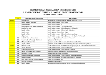 HARMONOGRAM PRZESŁUCHAŃ KONKURSOWYCH II WARSZAWSKIEGO FESTIWALU PIOSENKI FRANCUSKOJĘZYCZNEJ – FRANKOFONIA 2014 – 09:00 10:00 SP 1 2 3 4 5 6 7 8 9 10 11 12 13 14 15 16 17 18 19 20 21 22 23 IMIĘ I NAZWISKO UCZESTNIKA Elisa Debriat Zespół wokalny "Staccato" Bogumiła Bajor Antonina Milewska & Martyna Madej Anaelle Putresza Zespół wokalny Ewa Graczyk Zespół wokalny Alicja Husar Gabriela Sitek & Adrian Sitek Dawid Duda & Anastazja Chteinman Małgorzata Brzozowska Zespół wokalny Cheyene Booth Zespół Wokalny Natalia Napiórkowska Maya Oleksiak & Maria Dzięcielak Phimphisa Truong Helena Zyskowska & Julia Wojda Milena Kudlicka Lena Adamkiewicz & Julia Michałkiewicz Zuzanna Frankiewicz Zespół wokalny NAZWA SZKOŁY Niepubliczna Szkoła Podstawowa Warsaw Montessori School Szkoła Podstawowa nr 33 im. WOPK Szkoła Podstawowa nr 69 Szkoła Podstawowa nr 2 Przymierza Rodzin Szkoła Podstawowa nr 109 im. Batalionów Chłopskich Szkoła Podstawowa nr 209 im. Hanki Ordonówny Szkoła Języków Obcych Euro - Lingua Szkoła Podstawowa nr 293 im. Jana Kochanowskiego Szkoła Podstawowa nr 279 im. Batalionów AK "Gustaw" i "Harnaś" Polsko - Angielska Szkoła Podstawowa "Mentis" Zgłoszenie indywidualne Społeczna Szkoła Podstawowa nr 12 im. Emanuela Bułhaka Społeczna Szkoła Podstawowa Społecznego Towarzystwa Oświatowego nr 11 Szkoła Podstawowa nr 70 z Oddziałami Integracyjnymi im. Bohaterów Monte Cassino Szkoła Podstawowa nr 82 im. Jana Pawła II Szkoła Podstawowa nr 146 im. Janusza Korczaka "Szkoła Przyszłości" Niepubliczna Szkoła Podstawowa Międzynarodowa Szkoła Europejska Szkoła Podstawowa nr 231 im. Generała Mariusza Zaruskiego Szkoła Podstawowa nr 86 Stowarzyszenia Kultury i Edukacji Szkoła Podstawowa nr 341 Zgłoszenie indywidualne Niepubliczna Szkoła Podstawowa "Ecole Antoine de Saint-Exupery" 12:30 13:30 24 25 26 27 28 29 30 31 Jan Jasiński Kaja Bors Zespół wokalno-instrumentalny Aniela Pauly Pola Dzielińska & Roksana Rybicka Felix Sobański Kaja Broda & Monika Gorączko Oliwia Chacińska Szkoła Podstawowa nr 12 im. Powstańców Śląskich Podstawowa Szkoła Międzynarodowa - The International School Zespół Państwowych Szkół Muzycznych nr 4 im. Karola Szymanowskiego Prywatna Szkoła Podstawowa nr 6 Sióstr Nazaretanek Publiczna Szkoła Podstawowa Społecznego Towarzystwa Oświatowego Polsko - Francuska Szkoła Podstawowa "La Fontaine" Zgłoszenie indywidualne Prywatna Szkoła Podstawowa im. Joanny Kolasińskiej nr 62 GIM 1 2 3 4 5 6 7 8 9 10 11 12 13 14 15 16 17 18 IMIĘ I NAZWISKO UCZESTNIKA Paulina Kozłowska & Bernadetta Statkiewicz Paulina Wiadrowska Maja Grabowska Alicja Puchnowska Natalia Kowalska Joanna Oleksy Aleksandra Ptak & Martyna Pierzchanowska Karolina Polesiak Maria Leszczełowska Teresa Spruch Marcin Molski Ola Pęksa Gabriela Maliborska – Szmulewicz Zespół wokalny Alicja Tokarska Jan Cięciara Maria Ciach Maja Krych NAZWA SZKOŁY Gimnazjum nr 1 im. Powstańców Warszawy (Piaseczno ) Gimnazjum nr 23 im. Ireny Sendlerowej Gimnazjum nr 145 im. Jana Pawła II Publiczne Gimnazjum Społecznego Towarzystwa Oświatowego Publiczne Gimnazjum im. Ks. Piotra Skargi Gimnazjum nr 37 im. Krzysztofa Kamila Baczyńskiego Gimnazjum nr 166 (ZS '121) Gimnazjum nr 131 im. Krzysztofa Kamila Baczyńskiego Gimnazjum z Oddziałami Dwujęzycznymi nr 19 im. Bolesława Prusa Prywatne Gimnazjum Sióstr Nazaretanek z Oddziałami Dwujęzycznymi Gimnazjum nr 91 im. Stanisława Staszica Gimnazjum nr 164 z Oddziałami Integracyjnymi i Oddziałami Dwujęzycznymi Gimnazjum Społeczne Milanowskiego Towarzystwa Edukacyjnego (Milanówek) Gimnazjum nr 53 im. Stefanii Sempołowskiej Gimnazjum Dwujęzyczne nr 50 im. gen. Władysława Sikorskiego (ZS ’117) Gimnazjum z Oddziałami Dwujęzycznymi nr 83 im. Konstancji Markiewicz Społeczne Gimnazjum "Startowa" Niepubliczne Gimnazjum nr 9 im. Roberta Schumana 19 20 21 22 23 24 25 26 Zespół wokalny Katarzyna Zbrzeźniak Daria Nowikowska Jannet Capucine Julia Dryjańska Karolina Król Katarzyna Kędziora Florentyna Góralska Prywatne Gimnazjum nr 23 Sióstr Zmartwychwstanek Gimnazjum nr 2 im. Jana Pawła II (Piaseczno) Gimnazjum nr 38 Lycee Francaise De Varsovie Gimnazjum nr 44 im. gen. Pawła Chrzanowskiego Gimnazjum nr 58 im. Króla Władysława IV Gimnazjum nr 1 im. Prymasa Tysiąclecia (Raszyn) The British School Warsaw Podana w harmonogramie godzina przesłuchań jest tylko godziną tzw. „orientacyjną”.