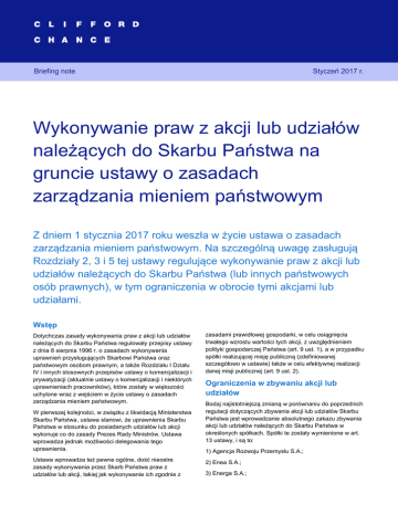 Wykonywanie praw z akcji lub udziałów należących do Skarbu Państwa na gruncie ustawy o zasadach zarządzania mieniem państwowym 1 Styczeń 2017 r. Briefing note Wykonywanie praw z akcji lub udziałów należących do Skarbu Państwa na gruncie ustawy o zasadach zarządzania mieniem państwowym Z dniem 1 stycznia 2017 roku weszła w życie ustawa o zasadach zarządzania mieniem państwowym. Na szczególną uwagę zasługują Rozdziały 2, 3 i 5 tej ustawy regulujące wykonywanie praw z akcji lub udziałów należących do Skarbu Państwa (lub innych państwowych osób prawnych), w tym ograniczenia w obrocie tymi akcjami lub udziałami. Wstęp Dotychczas zasady wykonywania praw z akcji lub udziałów należących do Skarbu Państwa regulowały przepisy ustawy z dnia 8 sierpnia 1996 r. o zasadach wykonywania uprawnień przysługujących Skarbowi Państwa oraz państwowym osobom prawnym, a także Rozdziału I Działu IV i innych stosownych przepisów ustawy o komercjalizacji i prywatyzacji (aktualnie ustawy o komercjalizacji i niektórych uprawnieniach pracowników), które zostały w większości uchylone wraz z wejściem w życie ustawy o zasadach zarządzania mieniem państwowym. W pierwszej kolejności, w związku z likwidacją Ministerstwa Skarbu Państwa, ustawa stanowi, że uprawnienia Skarbu Państwa w stosunku do posiadanych udziałów lub akcji wykonuje co do zasady Prezes Rady Ministrów. Ustawa wprowadza jednak możliwości delegowania tego uprawnienia. Ustawa wprowadza też pewne ogólne, dość nieostre zasady wykonywania przez Skarb Państwa praw z udziałów lub akcji, takiej jak wykonywanie ich zgodnie z zasadami prawidłowej gospodarki, w celu osiągnięcia trwałego wzrostu wartości tych akcji, z uwzględnieniem polityki gospodarczej Państwa (art. 9 ust. 1), a w przypadku spółki realizującej misję publiczną (zdefiniowanej szczegółowo w ustawie) także w celu efektywnej realizacji danej misji publicznej (art. 9 ust. 2). Ograniczenia w zbywaniu akcji lub udziałów Bodaj najistotniejszą zmianą w porównaniu do poprzednich regulacji dotyczących zbywania akcji lub udziałów Skarbu Państwa jest wprowadzanie absolutnego zakazu zbywania akcji lub udziałów należących do Skarbu Państwa w określonych spółkach. Spółki te zostały wymienione w art. 13 ustawy, i są to: 1) Agencja Rozwoju Przemysłu S.A.; 2) Enea S.A.; 3) Energa S.A.; 2 Wykonywanie praw z akcji lub udziałów należących do Skarbu Państwa na gruncie ustawy o zasadach zarządzania mieniem państwowym 4) Giełda Papierów Wartościowych w Warszawie S.A.; 5) Grupa Azoty S.A.; 6) Grupa Azoty Zakłady Chemiczne "Police" S.A.; 7) Grupa Azoty "Puławy" S.A.; 8) Grupa LOTOS S.A.; 9) Jastrzębska Spółka Węglowa S.A.; 10) KGHM Polska Miedź S.A.; 11) Polska Grupa Energetyczna S.A. (w ustawie brakuje słowa "PGE" w nazwie spółki, co może wymagać jej technicznej korekty); 12) Polska Grupa Zbrojeniowa S.A.; 13) Polski Fundusz Rozwoju S.A.; 14) Polskie Górnictwo Naftowe i Gazownictwo S.A.; 15) Polski Holding Nieruchomości S.A.; 16) Polski Holding Obronny sp. z o.o.; 17) Polski Koncern Naftowy Orlen S.A.; 18) PKP Polskie Linie Kolejowe S.A.; 19) PKP Cargo S.A.; 20) Powszechna Kasa Oszczędności Bank Polski S.A.; 21) Powszechny Zakład Ubezpieczeń S.A.; 22) Polska Wytwórnia Papierów Wartościowych S.A.; 23) Totalizator Sportowy sp. z o.o.; 24) Tauron Polska Energia S.A.. Co do udziałów lub akcji należących do Skarbu Państwa lub innej państwowej osoby prawnej (ustawa definiuje przy tym szczegółowo pojęcie państwowej osoby prawnej) w innych spółkach, zbycie ich wymaga zgody Rady Ministrów za wyjątkiem wniesienia ich aportem do spółki będącej w pełni własnością Skarbu Państwa lub innych osób prawnych (art. 11 ustawy). Wyrażając zgodę Rada Ministrów określa tryb zbycia akcji lub udziałów. Dotychczas Rada Ministrów miała także pewne uprawnienia w tym zakresie, to jest miała prawo wyrazić zgodę na zbycie akcji lub udziałów w trybie nie przewidzianym ustawą. Teraz nie przewidziano katalogu takich trybów, dając Radzie Ministrów swobodę w tym względzie. Podmiot uprawniony do zbycia udziałów lub akcji występując o zgodę powinien dołączyć do wniosku szereg dokumentów, w tym w szczególności projekt umowy nabycia (za wyjątkiem sprzedaży akcji w spółce publicznej). Zbycie akcji lub udziałów z naruszeniem art. 11-15 ustawy jest nieważne. Warto na marginesie dodać także, że ustawa uchyla przepisy o prywatyzacji bezpośredniej, co oznacza, że prywatyzacja będzie możliwa tylko poprzez zbycie akcji lub udziałów (prywatyzacja pośrednia). Prywatyzacja pośrednia była zresztą od dłuższego czasu standardem rynkowym. Zgody organów na określone czynności Art. 17 ustawy wprowadza z kolei nowe zasady uzyskiwania zgody walnego zgromadzenia (w spółce z o.o. – zgromadzenia wspólników) lub organu nadzorczego spółek, w którym podmiotem uprawnionym z akcji lub udziałów jest Skarb Państwa lub państwowa osoba prawna. Pierwsza zmiana to rozdzielenie zasad udzielania zgód w spółkach, które są uregulowane właśnie w tym artykule, i innych państwowych osobach prawnych (te ostatnie nie są przedmiotem niniejszego opracowania). Druga zmiana to rozszerzenie tych zasad na wszystkie spółki, w których Skarb Państwa lub inna państwowa osoba prawna posiada akcje lub udziały, to jest nie tylko stosowanie ich do spółek, które są w całości lub w większości państwową własnością (przy czym pozostał w mocy np. art. 19 ustawy o komercjalizacji i niektórych uprawnieniach pracowników, który przewiduje, z zastrzeżeniem szeregu wyjątków, wymóg przeprowadzenia przetargu dla zbywania środków trwałych przez spółki, które powstały w wyniku komercjalizacji i w których ponad połowa ogólnej liczby akcji należy do Skarbu Państwa). Ustawa stanowi, że podmioty uprawnione do wykonywania praw z tych akcji lub udziałów s