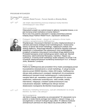 PROGRAM WYDARZEŃ 19 lutego 2012, wtorek 1000 – 1500 Fashion Retail Forum - Forum Handlu w Branży Mody 1000 – 1045 Jak dzięki odpowiedniej promocji zwiększyć liczbę klientów odwiedzających nasz sklep? Skrót wystąpienia: Odpowiedni projekt czy wykrój kreacji to główne narzędzia krawca, a co jest domeną email marketera w branży fashion? Na to oraz inne pytania odpowiem w swojej prezentacji podczas kolejnej edycji Fashion Retail Forum. Zapraszam serdecznie. Prelegent: Maciej Górski – ekspert ds. edukacji w firmie Implix, dostawcy oprogramowania GetResponse. Współpracuje z kluczowymi klientami na rynku międzynarodowym w zakresie planowania strategii email marketingowych, dostarczania wiedzy na temat idei email marketingu, najlepszych praktyk oraz obsługi platformy. Wspomaga klientów w obszarze regulacji prawnych związanych z budowaniem baz adresowych oraz przestrzegania przyjętych przepisów dotyczących komunikacji drogą elektroniczną. Prowadził kampanie email marketingowe takich marek jak: Marriott Warszawa, InterContinental Warszawa, Carrefour, Heppin czy Cyrfowe.pl. Z branżą email marketingu ściśle związany od ponad 3 lat. Uczestnik międzynarodowych konferencji branżowych m.in. w Nowym Jorku, Bostonie i Londynie. Firma: Implix Platforma GetResponse jest produktem firmy Implix posiadającej ponad trzynastoletnie doświadczenie w email marketingu. Z usługi korzysta obecnie ponad 250000 klientów z blisko 200 krajów. GetResponse oferuje wiele praktycznych rozwiązań niezbędnych do prowadzenia efektywnych kampanii email marketingowych z wykorzystaniem narzędzi takich jak: newslettery (ponad 300 gotowych do użycia szablonów), wiadomości automatyczne, video emaile, ankiety internetowe, integracje z mediami społecznościowymi oraz rozbudowane statystyki. GetResponse oferuje również dedykowane rozwiązania dla klientów korporacyjnych. 1100 – 1145 Skuteczny marketing sensoryczny, czyli jak oddziaływać na zmysły klientów, by robili u nas zakupy? Skrót wystąpienia: Jak klienci kupują, racjonalnie czy emocjonalnie? W odpowiedzi na to pytanie w dużej mierze pomaga nam wiedza o naszym mózgu, a w szczególności o różnych funkcjach jego półkul. W odbiorze bodźców zewnętrznych pierwsza do akcji włącza się prawa półkula, która 1 odpowiada za uczucia i emocje. Jeżeli są one pozytywne, to dopiero wówczas uruchamia się prawa półkula, która jest racjonalna i analityczna. Odpowiednie oddziaływanie na zmysły klientów: wzroku, słuchu, powonienia, dotyku i smaku to nie tylko klucz do udanej transakcji, ale tez pomysł budowanie lojalności klientów. Warto poznać tajniki marketingu sensorycznego, by stale zwiększać sprzedaż. Prelegent: Jerzy Osika, prezes firmy Promedia Założyciel, właściciel i prezes firmy Promedia, wydawca i redaktor naczelny 5 czasopism branżowych, w tym 3 z branży mody (Moda Damska, Moda Męska i Fashionbusiness.pl.). Jest wykładowcą na międzynarodowych targach i konferencjach poza Polską (m.in. w Las Vegas, Hongkongu, Bombaju, Frankfurcie nad Menem, Lipsku, Walencji, Porto), jak i w kraju (dla uczestników międzynarodowych targów branżowych, zagranicznych misji handlowych, konferencji, forów i kongresów). Prowadzi także szkolenia z zakresu sprzedaży i marketingu. Wiedzę o branży poszerza uczestnicząc w licznych seminariach i konferencjach w kraju i na świecie. Jest członkiem jury konkursów w Polsce (Złoty Medal Międzynarodowych Targów Poznańskich, Retail Marketing Awards, Fashion Website Awards) i zagranicą (Global Innovation Award w Chicago). Doradza firmom w zakresie strategii biznesowych, marketingu i sprzedaży. Firma: Promedia Od początku swego istnienia (1998 r.) specjalizuje się w kompleksowej obsłudze firm z branży mody. Wydaje fachowe czasopisma dla profesjonalistów z branży mody („Moda Męska”, „Moda Damska”, „Fashionbusiness.pl”). Organizuje fachowe kongresy, konferencje i seminaria, jak np.: Fashion Retail Forum, Kongres Mody, Retail Marketing Forum. Firma prowadzi szkolenia w zakresie trendów w modzie, technik sprzedaży i obsługi klienta, marketingu, zarządzania i działań eksportowych. Promedia to także agencja reklamowa i public relations, wydawca czasopism firmowych dla klientów (m.in. Digel News, Le Mac Magazine, Henri Lloyd News, Krenig Magazine), organizator konkursów (, Retail Marketing Awards, Fashion Website Awards a także polskiej edycji Global Innovation Award). Firma tworzy i obsługuje strony internetowe, prowadzi akcje promocyjne dla sieci handlowych, wdraża karty upominkowe, systemy lojalnościowe, opracowuje standardy obsługi klienta. Promedia jest także firmą consultingowa dla biznesu mody. 1200– 1245 Jak zwiększyć sprzedaż poprzez efektywny coaching? Skrót wystąpienia: Coaching handlowców to jedna z najskuteczniejszych metod podnoszenia kompetencji sprzedażowych. Coaching stosowany coraz szerzej w świecie biznesu, handlu jest doskonałym instrumentem pozytywnych zmian. Metody coachingu stosowane w środowisku handlowców są bardzo efektywnym narzędziem uzupełniającym i wzmacniającym efekty prowadzonych szkoleń. Dlaczego coaching jest tak efektywny? 2 Odbywa się w trakcie bezpośredniego kontaktu z potencjalnym klientem. Trener/Coach całą swoją energię skupia na jednym handlowcu, wspólnie ustalają cel sprzedaży i określają potrzeby klienta. Coach daje feedback podkreślając wszystko to, co sprzedawca zrobił dobrze, dzięki czemu nastawia go pozytywnie. Wszystkie ćwiczone zachowania oraz podjęte ustalenia i zobowiązania muszą zostać spisane i zaakceptowane przez obie strony. Wspólnie tworzą listę pożądanych zachowań, które handlowiec będzie wdrażał samodzielnie. Ustalają te rodzaje zachowań, nad którymi trener i handlowiec będą wspólnie pracowali (obniża to poziomu stresu i pozwala na samodzielne poprawianie własnych kwalifikacji). Coaching to też ćwiczenie umiej
