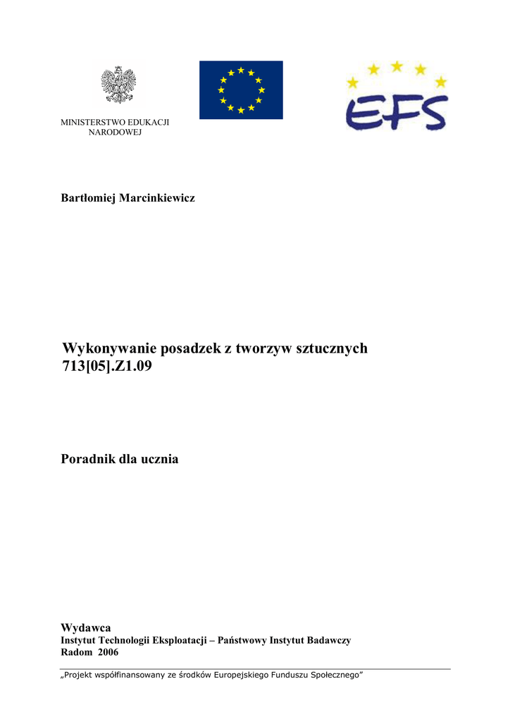 MINISTERSTWO EDUKACJI NARODOWEJ Bartłomiej Marcinkiewicz Wykonywanie posadzek z tworzyw sztucznych 713[05].Z1.09 Poradnik dla ucznia Wydawca Instytut Technologii Eksploatacji – Państwowy Instytut Badawczy Radom 2006 „Projekt współfinansowany ze środków Europejskiego Funduszu Społecznego” Recenzenci: mgr inż. Karolina Białas mgr inż. Radosław Krzyżanowski Opracowanie redakcyjne: mgr inż. Bartłomiej Marcinkiewicz Konsultacja: dr inż. Jacek Przepiórka Korekta: mgr inż. Bartłomiej Marcinkiewicz Poradnik stanowi obudowę dydaktyczną programu jednostki modułowej 713[05].Z1.09 Wykonanie posadzek z tworzyw sztucznych zawartego w modułowym programie nauczania dla zawodu posadzkarz. Wydawca Instytut Technologii Eksploatacji – Państwowy Instytut Badawczy, Radom 2006 „Projekt współfinansowany ze środków Europejskiego Funduszu Społecznego” 1 SPIS TREŚCI 1. Wprowadzenie 2. Wymagania wstępne 3. Cele kształcenia 4. Materiał nauczania 4.1. Rodzaje materiałów posadzkarskich z tworzyw sztucznych 4.1.1. Materiał nauczania 4.1.2. Pytania sprawdzające 4.1.3. Ćwiczenia 4.1.4. Sprawdzian postępów 4.2. Właściwości fizyczne, mechaniczne i chemiczne materiałów z tworzyw sztucznych 4.2.1. Materiał nauczania 4.2.2. Pytania sprawdzające 4.2.3. Ćwiczenia 4.2.4. Sprawdzian postępów 4.3. Wyznaczanie poziomu powierzchni 4.3.1. Materiał nauczania 4.3.2. Pytania sprawdzające 4.3.3. Ćwiczenia 4.3.4. Sprawdzian postępów 4.4. Posadzki ze sztywnych płytek z PVC 4.4.1. Materiał nauczania 4.4.2. Pytania sprawdzające 4.4.3. Ćwiczenia 4.4.4. Sprawdzian postępów 4.5. Posadzki z elastycznych płytek z PVC 4.5.1. Materiał nauczania 4.5.2. Pytania sprawdzające 4.5.3. Ćwiczenia 4.5.4. Sprawdzian postępów 4.6. Posadzki z elastycznych wykładzin z PVC 4.6.1. Materiał nauczania 4.6.2. Pytania sprawdzające 4.6.3. Ćwiczenia 4.6.4. Sprawdzian postępów 4.7. Zasady układania i mocowania wykładzin dywanowych 4.7.1. Materiał nauczania 4.7.2. Pytania sprawdzające 4.7.3. Ćwiczenia 4.7.4. Sprawdzian postępów 4.8. Technika wykonywania posadzek z wykładzin i płytek gumowych 4.8.1. Materiał nauczania 4.8.2. Pytania sprawdzające 4.8.3. Ćwiczenia 4.8.4. Sprawdzian postępów „Projekt współfinansowany ze środków Europejskiego Funduszu Społecznego” 2 5 7 8 10 10 10 10 10 11 12 12 12 12 13 14 14 14 14 15 16 16 16 17 18 19 19 19 19 21 22 22 22 23 24 25 25 26 26 27 28 28 28 28 30 4.9. Współczesne metody łączenia materiałów – klejenie, zgrzewanie 4.9.1. Materiał nauczania 4.9.2. Pytania sprawdzające 4.9.3. Ćwiczenia 4.9.4. Sprawdzian postępów 4.10. Zasady wykonania posadzki z wykładzin kauczukowych 4.10.1. Materiał nauczania 4.10.2. Pytania sprawdzające 4.10.3. Ćwiczenia 4.10.4. Sprawdzian postępów 4.11. Elementy wykończeniowe posadzek z tworzyw sztucznych 4.11.1. Materiał nauczania 4.11.2. Pytania sprawdzające 4.11.3. Ćwiczenia 4.11.4. Sprawdzian postępów 4.12. Posadzki bezspoinowe z kompozycji żywiczno – mineralnych 4.12.1. Materiał nauczania 4.12.2. Pytania sprawdzające 4.12.3. Ćwiczenia 4.12.4. Sprawdzian postępów 4.13. Zasady, metody i materiały do konserwacji 4.13.1. Materiał nauczania 4.13.2. Pytania sprawdzające 4.13.3. Ćwiczenia 4.13.4. Sprawdzian postępów 4.14. Metody dokonywania napraw i remontów posadzek 4.14.1. Materiał nauczania 4.14.2. Pytania sprawdzające 4.14.3. Ćwiczenia 4.14.4. Sprawdzian postępów 4.15. Zasady posługiwania się sprzętem pomiarowym 4.15.1. Materiał nauczania 4.15.2. Pytania sprawdzające 4.15.3. Ćwiczenia 4.15.4. Sprawdzian postępów 4.16. Dokumentacja techniczna 4.16.1. Materiał nauczania 4.16.2. Pytania sprawdzające 4.16.3. Ćwiczenia 4.16.4. Sprawdzian postępów 4.17. Polskie Normy, instrukcje 4.17.1. Materiał nauczania 4.17.2. Pytania sprawdzające 4.17.3. Ćwiczenia 4.17.4. Sprawdzian postępów 4.18. Kalkulacja materiałów 4.18.1. Materiał nauczania 4.18.2. Pytania sprawdzające 4.18.3. Ćwiczenia 4.18.4. Sprawdzian postępów „Projekt współfinansowany ze środków Europejskiego Funduszu Społecznego” 3 31 31 32 32 34 35 35 35 35 36 37 37 37 37 38 39 39 40 40 41 43 43 43 43 44 44 44 44 44 45 47 47 47 48 48 49 49 49 49 50 51 52 52 53 53 54 54 54 55 56 4.19. Przepisy techniczne 4.19.1. Materiał nauczania 4.19.2. Pytania sprawdzające 4.19.3. Ćwiczenia 4.19.4. Sprawdzian postępów 4.20. Zasady przedmiarowania i obmiaru robót 4.20.1. Materiał nauczania 4.20.2. Pytania sprawdzające 4.20.3. Ćwiczenia 4.20.4. Sprawdzian postępów 5. Sprawdzian osiągnięć 6. Literatura „Projekt współfinansowany ze środków Europejskiego Funduszu Społecznego” 4 57 57 58 58 59 60 60 60 60 61 62 68 1. WPROWADZENIE Poradnik będzie Ci pomocny w przyswajaniu wiedzy o posadzkach z tworzyw sztucznych, materiałach stosowanych do ich wykonywania, a także ułatwi Ci wykonywanie posadzek z tworzyw sztucznych oraz ich odbiór. W poradniku zamieszczono: 1. Wymagania wstępne, czyli wykaz niezbędnych umiejętności i wiedzy, które powinieneś mieć opanowane, aby przystąpić do realizacji tej jednostki modułowej. 2. Cele kształcenia tej jednostki modułowej. 3. Materiał nauczania (rozdział 4), który umożliwia samodzielne przygotowanie się do wykonania ćwiczeń i zaliczenia sprawdzianów. Obejmuje on również ćwiczenia, które zawierają wykaz materiałów, narzędzi i sprzętu potrzebnych do realizacji ćwiczeń. Przed ćwiczeniami zamieszczono pytania sprawdzające wiedzę potrzebną do ich wykonania. Po ćwiczeniach zamieszczony został sprawdzian postępów. Wykonując sprawdzian postępów powinieneś odpowiadać na pytania tak lub nie, co oznacza, że opanowałeś materiał albo nie. 4. Sprawdzian osiągnięć, w którym zamieszczono instrukcję dla ucznia oraz zestaw zadań testowych sprawdzających opanowanie wiedzy i umiejętności z zakresu całej jednostki. Zamieszczona została także kartę odpowiedzi. 5. Wykaz literatury obejmujący zakres wiadomości