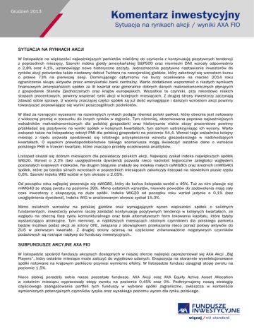 Grudzień 2013 Komentarz inwestycyjny Sytuacja na rynkach akcji / wyniki AXA FIO SYTUACJA NA RYNKACH AKCJI W listopadzie na większości najważniejszych parkietów mieliśmy do czynienia z kontynuacją pozytywnych tendencji z poprzednich miesięcy. Szeroki indeks giełdy amerykańskiej S&P500 oraz niemiecki DAX wzrosły odpowiednio o 2,8% oraz 4,1%, ustanawiając nowe historyczne szczyty. Jednoznacznie pozytywne nastawienie inwestorów do rynków akcji potwierdza także niedawny debiut Twittera na nowojorskiej giełdzie, który zakończył się wzrostem kursu o prawie 73% na pierwszej sesji. Dominującego optymizmu nie burzy oczekiwane na marzec 2014 roku ograniczenie skupu aktywów przez amerykański bank centralny. Warto dodatkowo wspomnieć o niezłych wynikach finansowych amerykańskich spółek za III kwartał oraz generalnie dobrych danych makroekonomicznych płynących z gospodarek Stanów Zjednoczonych oraz krajów europejskich. Wszystkie te czynniki, przy rekordowo niskich stopach procentowych, powinny wspierać rynki akcji w kolejnych miesiącach. Z drugiej strony inwestorzy zaczynają zdawać sobie sprawę, iż wyceny znaczącej części spółek są już dość wymagające i dalszym wzrostom akcji powinny towarzyszyć poprawiające się wyniki poszczególnych podmiotów. W ślad za rosnącymi wycenami na rozwiniętych rynkach podąża również polski parkiet, który obecnie jest notowany z widoczną premią w stosunku do innych rynków w regionie. Tym niemniej, obserwowana poprawa najważniejszych wskaźników makroekonomicznych dla polskiej gospodarki oraz historycznie niskie stopy procentowe powinny przekładać się pozytywnie na wyniki spółek w kolejnych kwartałach, tym samym uatrakcyjniając ich wyceny. Warto wskazać także na listopadowy odczyt PMI dla polskiej gospodarki na poziomie 54,4. Wzrost tego wskaźnika kolejny miesiąc z rzędu pozwala spodziewać się istotnego przyspieszenia wzrostu gospodarczego w nadchodzących kwartałach. O wysokim prawdopodobieństwie takiego scenariusza mogą świadczyć ostatnie dane o wzroście polskiego PKB w trzecim kwartale, które znacząco przebiły oczekiwania analityków. Listopad okazał się dobrym miesiącem dla posiadaczy polskich akcji. Najwięcej zyskał indeks największych spółek WIG20. Wzrost o 2,2% (bez uwzględnienia dywidend) pozwala nieco nadrobić tegoroczne zaległości względem pozostałych krajowych indeksów. Na drugim biegunie znalazły się indeksy małych (sWIG80) oraz średnich (mWIG40) spółek, które po bardzo silnych wzrostach w poprzednich miesiącach zakończyły listopad na niewielkim plusie rzędu 0,6%. Szeroki indeks WIG wzrósł w tym okresie o 2,05%. Od początku roku najlepiej prezentuje się sWIG80, który do końca listopada wzrósł o 46%. Tuż za nim plasuje się mWIG40 ze stopą zwrotu na poziomie 39%. Mimo ostatnich wzrostów, niewiele powodów do zadowolenia mają cały czas inwestorzy z ekspozycją na duże spółki. Indeks WIG20 od początku roku wzrósł jedynie o 0,1% (bez uwzględnienia dywidend). Indeks WIG w analizowanym okresie zyskał 15,3%. Mimo ostatnich wzrostów na polskiej giełdzie oraz wymagających wycen większości spółek o solidnych fundamentach, inwestorzy powinni raczej zakładać kontynuację pozytywnych tendencji w kolejnych kwartałach, ze względu na obecną fazę cyklu koniunkturalnego oraz brak alternatywnych form lokowania kapitału, które byłyby wystarczająco atrakcyjne. Tym niemniej, w najbliższych miesiącach istotnym czynnikiem dla polskiego parkietu będzie możliwa podaż akcji ze strony OFE, związana z obowiązkiem przekazania nieco ponad połowy aktywów do ZUS w pierwszym kwartale. Z drugiej strony szansą na częściowe zrównoważenie negatywnych czynników podażowych są rosnące napływy do funduszy inwestycyjnych. SUBFUNDUSZE AKCYJNE AXA FIO W listopadzie spośród funduszy akcyjnych dostępnych w naszej ofercie najlepiej zaprezentował się AXA Akcji „Big Players”, który ostatnie miesiące może zaliczyć do wyjątkowo udanych. Ekspozycja na starannie wyselekcjonowane spółki notowane na krajowym parkiecie przynosi wymierne efekty. W listopadzie fundusz osiągnął stopę zwrotu na poziomie 1,5%. Nieco słabiej poradziły sobie nasze pozostałe fundusze. AXA Akcji oraz AXA Equity Active Asset Allocation w ostatnim miesiącu wypracowały stopy zwrotu na poziomie 0,45% oraz 0%. Podtrzymujemy naszą strategię częściowego zaangażowania portfeli tych funduszy w wybrane spółki zagraniczne, zwłaszcza w kontekście wymienionych potencjalnych czynników ryzyka oraz wysokiego poziomu wycen dla rynku polskiego. Grudzień 2013 Komentarz inwestycyjny Sytuacja na rynkach akcji / wyniki AXA FIO W okresie od stycznia do końca listopada wyniki wszystkich naszych funduszy akcyjnych prezentują się bardzo korzystnie na tle benchmarków oraz większości innych produktów o zbliżonej strategii. AXA Akcji „Big Players”, AXA Equity Active Asset Allocation oraz AXA Akcji osiągnęły stopy zwrotu odpowiednio na poziomie 16,9%, 16,6%, 14,9%. / Michał Rabiej, Zarządzający funduszami akcji / Niniejszy materiał został przygotowany przez AXA TFI S.A. w dobrej wierze i z należytą starannością, tym niemniej ma on charakter wyłącznie informacyjny i nie należy go traktować jako rekomendacji inwestowania w jakiekolwiek instrumenty finansowe. AXA TFI S.A. nie świadczy usługi doradztwa inwestycyjnego i nie ponosi żadnej odpowiedzialności za decyzje inwestycyjne podjęte na podstawie niniejszej publikacji. Informacje na temat funduszu inwestycyjnego oferowanego przez AXA TFI S.A., w tym szczegółowe informacje na temat ryzyka inwestycyjnego znajdują w Prospekcie informacyjnym AXA FIO, dostępnym na stronie www.tfi.axa.pl oraz w siedzibie Towarzystwa. W związku z polityką inwestycyjną, cena jednostki uczestnictwa poszczególnych subfunduszy może charakteryzować się dużą zmiennością. Uczestnik musi liczyć się z mo