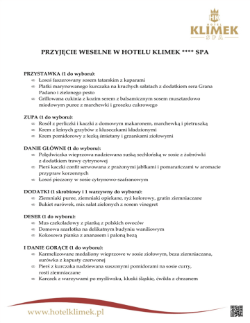 PRZYJĘCIE WESELNE W HOTELU KLIMEK **** SPA PRZYSTAWKA (1 do wyboru): • Łosoś faszerowany sosem tatarskim z kaparami • Płatki marynowanego kurczaka na kruchych sałatach z dodatkiem sera Grana Padano i zielonego pesto • Grillowana cukinia z kozim serem z balsamicznym sosem musztardowo miodowym puree z marchewki i groszku cukrowego ZUPA (1 do wyboru): • Rosół z perliczki i kaczki z domowym makaronem, marchewką i pietruszką • Krem z leśnych grzybów z kluseczkami kładzionymi • Krem pomidorowy z łezką śmietany i grzankami ziołowymi DANIE GŁÓWNE (1 do wyboru): • Polędwiczka wieprzowa nadziewana suską sechlońską w sosie z żubrówki z dodatkiem trawy cytrynowej • Pierś kaczki confit serwowana z prażonymi jabłkami i pomarańczami w aromacie przypraw korzennych • Łosoś pieczony w sosie cytrynowo-szafranowym DODATKI (1 skrobiowy i 1 warzywny do wyboru): • Ziemniaki puree, ziemniaki opiekane, ryż kolorowy, gratin ziemniaczane • Bukiet surówek, mix sałat zielonych z sosem vinegret DESER (1 do wyboru): • Mus czekoladowy z pianką z polskich owoców • Domowa szarlotka na delikatnym budyniu waniliowym • Kokosowa pianka z ananasem i paloną bezą I DANIE GORĄCE (1 do wyboru): • Karmelizowane medaliony wieprzowe w sosie ziołowym, beza ziemniaczana, surówka z kapusty czerwonej • Pierś z kurczaka nadziewana suszonymi pomidorami na sosie curry, rosti ziemniaczane • Karczek z warzywami po myśliwsku, kluski śląskie, ćwikła z chrzanem II DANIE GORĄCE: Grill: • Karczek marynowany w ziołach z chili • Skrzydełka z kurczaka w papryce • Żeberka w winie i miodzie • Kiełbaska grillowa • Szaszłyki drobiowo-wieprzowe z warzywami • Ziemniaki z folii • Ratatouille warzywne III DANIE CIEPŁE (1 do wyboru): • Barszcz czerwony z krokietem lub pasztecikiem • Żur staropolski na domowym zakwasie z kiełbasą • Bogracz z kluseczkami ZIMNY BUFET: • Wędliny • Wybór pieczonych mięs dworskich: o Schab faszerowany śliwką, morelą o Karczek pieczony w ziołach o Boczek faszerowany o Galantyny drobiowe o Rolady z indyka o Półmiski wykwintnych wędlin i kiełbas o Pasztet dworski z żurawiną • Śledzie z czterech stron świata: o Śledź w śmietanie o Śledź po meksykańsku o Śledź w oleju z cebulką o Śledź w sałatce żydowskiej o Tymbaliki z kurczakiem i cytryną DESKA SERÓW Z WINOGRONAMI I ORZECHAMI: • Sery twarde • Sery góralskie (typu oscypek) • Sery pleśniowe SAŁATKI (3 do wyboru): • Tradycyjna jarzynowa • Grecka • Trickolore z wędzonym kurczakiem • Brokułowa z kulkami mozzarelli i pomidorami • Meksykańska • Porowa z żółtym serem i szynką i kukurydzą • Chłopska z ziemniakami, korniszonami i grillowanym boczkiem • Wenezuelska z camembertem, orzechami i suszonymi pomidorami SOSY (3 do wyboru): • Chrzanowy • Cumberland • Barbecue • Tatarski • Czosnkowy • Tzatziki • Andaluzyjski BUFET SŁODKI: • Świeże owoce sezonowe • Trzy rodzaje ciast do wyboru: o Szarlotka krucha o Sernik wiedeński o Snikers o Babeczki królewskie z kremem patisier i owocami NAPOJE: • Kawa, herbata, soki owocowe - bez ograniczeń, do spożycia w lokalu • Napoje gazowane(coca-cola, fanta, sprite) - bez ograniczeń, do spożycia w lokalu • Woda mineralna gazowana i niegazowana - bez ograniczeń, do spożycia w lokalu Chleb na powitanie Państwa Młodych oraz szampan dla wszystkich Gości. Bukiet dekoracyjny na stół Państwa Młodych oraz pokój dla Państwa Młodych. Dodatkowe usługi weselne wyceniane w momencie podjęcia decyzji o organizacji przyjęcia weselnego w Hotelu Klimek **** SPA: Alkohol, tort, fontanna czekoladowa, szynka pieczona w całości lub prosiak faszerowany serwowany przy Gościach na Sali. STÓŁ WIEJSKI: Doskonałym dodatkiem do uczt kulinarnych towarzyszącym organizowanym w Hotelu Klimek **** SPA imprezom jest Stół Wiejski, który chcielibyśmy Państwu zaproponować. Starannie dobrane regionalne wędliny, kiełbasy oraz smalec wyrabiany tradycyjną metodą zadowolą gusta najbardziej wymagających smakoszy. Produktów, które oferujemy nie dostaną Państwo w sklepach, a ich smak na długo pozostanie w Waszej pamięci. W skład zestawu wchodzą: • Pieczony indyk w całości • Pieczone kaczki (2-3 sztuki) • Pieczony łosoś w całości • Pieczone pstrągi • Szaszłyki śledziowe • Sałatki inne niż na stołach (1-2) • Mięsa pieczone: karczek, schab, boczek, łopatka • Wędliny wiejskie • Kiszka • Salceson wiejski • Kabanosy • Golonka wędzona • Smalec • Twarożek • Ogórki kiszone • Chleb wiejski • Oscypki Dzieci do lat trzech bezpłatnie bez świadczeń tylko z miejscem do siedzenia Dzieci do lat dziesięciu za 50% ceny. Hotel Klimek **** SPA 33-370 Muszyna, Złockie 107 tel.: + 48 18 477 82 22 fax: + 48 18 477 71 82 [email protected] marketing@hotel-klimek www.hotelklimek.pl
