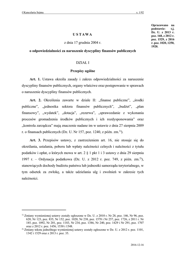 ©Kancelaria Sejmu s. 1/92 Opracowano na podstawie: t.j. Dz. U. z 2013 r. poz. 168, z 2012 r. poz. 1529, z 2016 r. poz. 1020, 1250, 1920. U S T AWA z dnia 17 grudnia 2004 r. o odpowiedzialności za naruszenie dyscypliny finansów publicznych DZIAŁ I Przepisy ogólne Art. 1. Ustawa określa zasady i zakres odpowiedzialności za naruszenie dyscypliny finansów publicznych, organy właściwe oraz postępowanie w sprawach o naruszenie dyscypliny finansów publicznych. Art. 2. Określenia zawarte w dziale II: „finanse publiczne”, „środki publiczne”, „jednostka sektora finansów publicznych”, „budżet”, „plan finansowy”, „wydatek”, „dotacja”, „rezerwa”, „sprawozdanie z wykonania procesów gromadzenia środków publicznych i ich rozdysponowania” oraz „kontrola zarządcza” mają znaczenie nadane im w ustawie z dnia 27 sierpnia 2009 r. o finansach publicznych (Dz. U. Nr 157, poz. 1240, z późn. zm.1)). Art. 3. Przepisów ustawy, z zastrzeżeniem art. 16, nie stosuje się do określania, ustalania, poboru lub wpłaty należności celnych i należności z tytułu podatków i opłat, o których mowa w art. 2 § 1 pkt 1 i 3 ustawy z dnia 29 sierpnia 1997 r. – Ordynacja podatkowa (Dz. U. z 2012 r. poz. 749, z późn. zm.2)), stanowiących dochody budżetu państwa lub jednostki samorządu terytorialnego, w tym odsetek za zwłokę, a także udzielania ulg i zwolnień w zakresie tych należności. Zmiany wymienionej ustawy zostały ogłoszone w Dz. U. z 2010 r. Nr 28, poz. 146, Nr 96, poz. 620, Nr 123, poz. 835, Nr 152, poz. 1020, Nr 238, poz. 1578 i Nr 257, poz. 1726, z 2011 r. Nr 185, poz. 1092, Nr 201, poz. 1183, Nr 234, poz. 1386, Nr 240, poz. 1429 i Nr 291, poz. 1707 oraz z 2012 r. poz. 1456, 1530 i 1548. 2) Zmiany tekstu jednolitego wymienionej ustawy zostały ogłoszone w Dz. U. z 2012 r. poz. 1101, 1342 i 1529 oraz z 2013 r. poz. 35. 1) 2016-12-16 ©Kancelaria Sejmu s. 2/92 DZIAŁ II Odpowiedzialność za naruszenie dyscypliny finansów publicznych Rozdział 1 Zakres odpowiedzialności za naruszenie dyscypliny finansów publicznych Art. 4. 1. Odpowiedzialności za naruszenie dyscypliny finansów publicznych podlegają, z zastrzeżeniem art. 4a: 1) osoby wchodzące w skład organu wykonującego budżet lub plan finansowy jednostki sektora finansów publicznych albo organu zarządzającego podmiotu niezaliczanego do sektora finansów publicznych, któremu przekazano do wykorzystania lub dysponowania środki publiczne, lub zarządzającego mieniem tych jednostek lub podmiotów; 2) kierownicy jednostek sektora finansów publicznych; 3) pracownicy jednostek sektora finansów publicznych lub inne osoby, którym odrębną ustawą lub na jej podstawie powierzono wykonywanie obowiązków w takiej jednostce, których niewykonanie lub nienależyte wykonanie stanowi czyn naruszający dyscyplinę finansów publicznych, z zastrzeżeniem ust. 2; 4) osoby wykonujące w imieniu podmiotu niezaliczanego do sektora finansów publicznych, któremu przekazano do wykorzystania lub dysponowania środki publiczne, czynności związane z wykorzystaniem tych środków lub dysponowaniem tymi środkami. 2. W przypadku naruszenia dyscypliny finansów publicznych określonego w art. 17, osoba obowiązana lub upoważniona do działania w imieniu podmiotu publicznego lub prywatnego, który oferuje pomocnicze działania zakupowe na rynku, któremu kierownik zamawiającego powierzył przygotowanie lub przeprowadzenie postępowania o udzielenie zamówienia publicznego, podlega odpowiedzialności za to naruszenie, jeżeli zamawiający jest jednostką sektora finansów publicznych lub udzielane zamówienie publiczne jest finansowane ze środków publicznych. Art. 4a. Odpowiedzialności za naruszenie dyscypliny finansów publicznych określone w art. 13 podlegają: 1) osoby zobowiązane lub upoważnione do działania w imieniu podmiotu, któremu odrębną ustawą lub na jej podstawie albo na podstawie umowy lub 2016-12-16 ©Kancelaria Sejmu s. 3/92 w drodze porozumienia powierzono określone zadania związane z realizacją programu finansowanego z udziałem środków pochodzących z budżetu Unii Europejskiej, niepodlegających zwrotowi środków z pomocy udzielanej przez państwa członkowskie Europejskiego Porozumienia o Wolnym Handlu (EFTA) lub innych środków pochodzących ze źródeł zagranicznych niepodlegających zwrotowi, zwanych dalej „środkami unijnymi lub zagranicznymi”; 2) osoby zobowiązane do realizacji projektu finansowanego z udziałem środków unijnych lub zagranicznych, którym przekazano środki publiczne przeznaczone na realizację tego projektu lub które wykorzystują takie środki; 3) osoby zobowiązane lub upoważnione do działania w imieniu podmiotu zobowiązanego do realizacji projektu finansowanego z udziałem środków unijnych lub zagranicznych, któremu przekazano środki publiczne przeznaczone na realizację tego projektu lub który wykorzystuje takie środki. Art. 5. 1. Naruszeniem dyscypliny finansów publicznych jest: 1) nieustalenie należności Skarbu Państwa, jednostki samorządu terytorialnego lub innej jednostki sektora finansów publicznych albo ustalenie takiej należności w wysokości niższej niż wynikająca z prawidłowego obliczenia; 2) niepobranie lub niedochodzenie należności Skarbu Państwa, jednostki samorządu terytorialnego lub innej jednostki sektora finansów publicznych albo pobranie lub dochodzenie tej należności w wysokości niższej niż wynikająca z prawidłowego obliczenia; 3) niezgodne z przepisami umorzenie należności Skarbu Państwa, jednostki samorządu terytorialnego lub innej jednostki sektora finansów publicznych, odroczenie jej spłaty lub rozłożenie spłaty na raty albo dopuszczenie do przedawnienia tej należności; 4) (uchylony). 2. (uchylony). 3. Przepisy ust. 1 nie mają zastosowania do należności z tytułu składek, do poboru których są obowiązani Zakład Ubezpieczeń Społecznych i Prezes K
