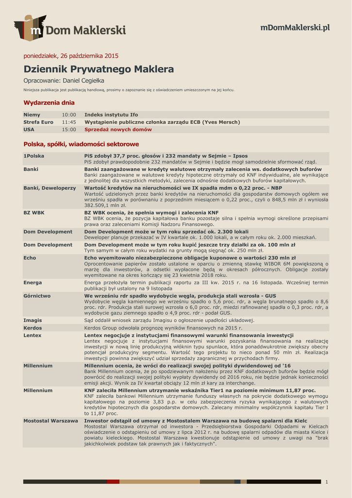 poniedziałek, 26 października 2015 Dziennik Prywatnego Maklera Opracowanie: Daniel Cegiełka Niniejsza publikacja jest publikacją handlową, prosimy o zapoznanie się z oświadczeniem umieszczonym na jej końcu. Wydarzenia dnia Niemy 10:00 Indeks instytutu Ifo Strefa Euro 11:45 Wystąpienie publiczne członka zarządu ECB (Yves Mersch) USA 15:00 Sprzedaż nowych domów Polska, spółki, wiadomości sektorowe 1Polska PiS zdobył 37,7 proc. głosów i 232 mandaty w Sejmie – Ipsos PiS zdobył prawdopodobnie 232 mandatów w Sejmie i będzie mogł samodzielnie sformować rząd. Banki Banki zaangażowane w kredyty walutowe otrzymały zalecenia ws. dodatkowych buforów Banki zaangażowane w walutowe kredyty hipoteczne otrzymały od KNF indywidualne, ale wynikające z jednolitej dla wszystkich metodyki, zalecenia odnośnie dodatkowych buforów kapitałowych. Banki, Deweloperzy Wartość kredytów na nieruchomości we IX spadła mdm o 0,22 proc. - NBP Wartość udzielonych przez banki kredytów na nieruchomości dla gospodarstw domowych ogółem we wrześniu spadła w porównaniu z poprzednim miesiącem o 0,22 proc., czyli o 848,5 mln zł i wyniosła 382.509,1 mln zł. BZ WBK BZ WBK ocenia, że spełnia wymogi i zalecenia KNF BZ WBK ocenia, że pozycja kapitałowa banku pozostaje silna i spełnia wymogi określone przepisami prawa oraz zaleceniami Komisji Nadzoru Finansowego. Dom Development Dom Development może w tym roku sprzedać ok. 2.300 lokali Deweloper planuje przekazać w IV kwartale ok. 1.000 lokali, a w całym roku ok. 2.000 mieszkań. Dom Development Dom Development może w tym roku kupić jeszcze trzy działki za ok. 100 mln zł Tym samym w całym roku wydatki na grunty mogą sięgnąć ok. 250 mln zł. Echo Echo wyemitowało niezabezpieczone obligacje kuponowe o wartości 230 mln zł Oprocentowanie papierów zostało ustalone w oparciu o zmienną stawkę WIBOR 6M powiększoną o marżę dla inwestorów, a odsetki wypłacone będą w okresach półrocznych. Obligacje zostały wyemitowane na okres kończący się 23 kwietnia 2018 roku. Energa Energa przełożyła termin publikacji raportu za III kw. 2015 r. na 16 listopada. Wcześniej termin publikacji był ustalony na 9 listopada Górnictwo We wrześniu rdr spadło wydobycie węgla, produkcja stali wzrosła - GUS Wydobycie węgla kamiennego we wrześniu spadło o 5,6 proc. rdr, a węgla brunatnego spadło o 8,6 proc. rdr. Produkcja stali surowej wzrosła o 6,0 proc. rdr, miedzi rafinowanej spadła o 0,3 proc. rdr, a wydobycie gazu ziemnego spadło o 4,9 proc. rdr - podał GUS. Imagis Sąd oddalił wniosek zarządu Imagisu o ogłoszenie upadłości układowej. Kerdos Kerdos Group odwołała prognozę wyników finansowych na 2015 r. Lentex Lentex negocjuje z instytucjami finansowymi warunki finansowania inwestycji Lentex negocjuje z instytucjami finansowymi warunki pozyskania finansowania na realizację inwestycji w nową linię produkcyjną włóknin typu spunlace, która ponaddwukrotnie zwiększy obecny potencjał produkcyjny segmentu. Wartość tego projektu to nieco ponad 50 mln zł. Realizacja inwestycji powinna zwiększyć udział sprzedaży zagranicznej w przychodach firmy. Millennium Millennium ocenia, że wróci do realizacji swojej polityki dywidendowej od '16 Bank Millennium ocenia, że po spodziewanym nałożeniu przez KNF dodatkowych buforów będzie mógł powrócić do realizacji swojej polityki wypłaty dywidendy od 2016 roku, nie będzie jednak konieczności emisji akcji. Wynik za IV kwartał obciąży 12 mln zł kary za interchange. Millennium KNF zaleciła Millennium utrzymanie wskaźnika Tier1 na poziomie minimum 11,87 proc. KNF zaleciła bankowi Millennium utrzymanie funduszy własnych na pokrycie dodatkowego wymogu kapitałowego na poziomie 3,83 p.p. w celu zabezpieczenia ryzyka wynikającego z walutowych kredytów hipotecznych dla gospodarstw domowych. Zalecany minimalny współczynnik kapitału Tier I to 11,87 proc. Mostostal Warszawa Inwestor odstąpił od umowy z Mostostalem Warszawa na budowę spalarni dla Kielc Mostostal Warszawa otrzymał od inwestora - Przedsiębiorstwa Gospodarki Odpadami w Kielcach oświadczenie o odstąpieniu od umowy z lipca 2012 r. na budowę spalarni odpadów dla miasta Kielce i powiatu kieleckiego. Mostostal Warszawa kwestionuje odstąpienie od umowy z uwagi na "brak jakichkolwiek podstaw tak prawnych jak i faktycznych". 1 PKO BP KNF zaleciła PKO BP utrzymywanie wskaźnika TCR minimum 12,76 proc. i Tier1 min. 9,57 proc. KNF zaleciła utrzymywanie przez PKO BP minimalnych współczynników kapitałowych banku co najmniej na poziomie Tier1 9,57 proc. i TCR 12,76 proc. KNF zaleciła ponadto PKO BP zatrzymanie co najmniej 50 proc. zysku wypracowanego w 2014 r. Polska Nowe zamówienia w przemyśle na eksport w ujęciu rdr spadły o 0,1 proc. - GUS Nowe zamówienia na eksport w ujęciu miesięcznym wzrosły o 18,8 proc. Polska Nowe zamówienia w przemyśle we wrześniu spadły w ujęciu rdr o 2,2 proc. - GUS W ujęciu miesięcznym zamówienia wzrosły o 13,6 proc. Polska Stopa bezrobocia we wrześniu wyniosła 9,7 proc. wobec 9,9 proc. - GUS Polska Suwerenność NBP i RPP musi być zachowana – Szydło, PiS. Prochem Quercus Parasolowy SFIO zwiększył zaangażowanie w ogólnej liczbie głosów do 5,003 proc. z 4,893 proc. przed dokonaniem zmiany. Sfinks NWZ Sfinksa zdecyduje o emisji 2,65 mln akcji s. N z wyłączeniem prawa poboru Akcje serii zostaną zaoferowane wybranym przez zarząd inwestorom w drodze subskrypcji prywatnej. Zgodnie z projektem uchwały prawo pierwszeństwa objęcia akcji serii N będzie przysługiwało akcjonariuszom posiadającym co najmniej 1/20 kapitału zakładowego spółki. Wittchen Cena akcji w ofercie Wittchena ustalona na 17 zł. Rynki zagraniczne Chiny Bank centralny Chin obniżył benchmarkową stopę procentową o 25 pkt. bazowyc Roczna stopa depozytów została obniżona o 25 pkt. bazowych do 1,5 proc. Bank obniżył stopę rezerw obowiązkowych b
