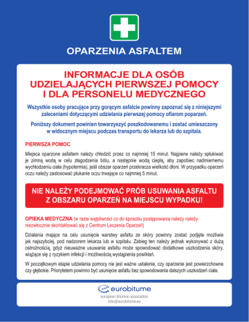 OPARZENIA ASFALTEM INFORMACJE DLA OSÓB UDZIELAJĄCYCH PIERWSZEJ POMOCY I DLA PERSONELU MEDYCZNEGO Wszystkie osoby pracujące przy gorącym asfalcie powinny zapoznać się z niniejszymi zaleceniami dotyczącymi udzielania pierwszej pomocy ofiarom poparzeń. Poniższy dokument powinien towarzyszyć poszkodowanemu i zostać umieszczony w widocznym miejscu podczas transportu do lekarza lub do szpitala. PIERWSZA POMOC Miejsca oparzone asfaltem należy chłodzić przez co najmniej 15 minut. Najpierw należy spłukiwać je zimną wodą w celu złagodzenia bólu, a następnie wodą ciepłą, aby zapobiec nadmiernemu wychłodzeniu ciała (hypotermia), jeśli obszar oparzeń przekracza wielkość dłoni. W przypadku oparzeń oczu należy zastosować płukanie oczu trwające co najmniej 5 minut. NIE NALEŻY PODEJMOWAĆ PRÓB USUWANIA ASFALTU Z OBSZARU OPARZEŃ NA MIEJSCU WYPADKU! OPIEKA MEDYCZNA (w razie wątpliwości co do sposobu postępowania należy należy niezwłocznie skontaktować się z Centrum Leczenia Oparzeń) Działania mające na celu usunięcie warstwy asfaltu ze skóry powinny zostać podjęte możliwie jak najszybciej, pod nadzorem lekarza lub w szpitalu. Zabieg ten należy jednak wykonywać z dużą ostrożnością, gdyż nieuważne usuwanie asfaltu może spowodować dodatkowe uszkodzenia skóry, wiążące się z ryzykiem infekcji i możliwością wystąpienia powikłań. W początkowym etapie udzielania pomocy nie jest ważne ustalenie, czy oparzenie jest powierzchowne czy głębokie. Priorytetem powinno być usunięcie asfaltu bez spowodowania dalszych uszkodzeń ciała. european bitumen association [email protected] OPARZENIA ASFALTEM USUWANIE ASFALTU PRZYLEGAJĄCEGO DO POPARZONEJ SKÓRY Zalecane są różne metody: Warstwę asfaltu należy pozostawić w miejscu oparzenia i przykryć grubą gazą, na którą nałożono parafinę lub maść antybiotykową na bazie parafiny, np. krem Flammazine (zawierający sól srebrową sulfadiazyny). Zastosowanie takiego leku spowoduje zmiękczenie asfaltu umożliwiające delikatne usunięcie go po upływie kilku dni. Inna metoda, to pokrycie na okres kilku godzin przylegajacego do skóry asfaltu olejem z oliwek (z nowego opakowania). Następnie asfalt może zostać usunięty poprzez delikatne pocieranie go gazą nasączoną olejem z oliwek. Wszelkie pozostałości asfaltu można usuwać przez owijanie dotkniętych oparzeniem obszarów ciała gazą nasączoną olejem z oliwek. Opatrunek należy zmieniać co 4 godziny. Po 24 godzinach można usunąć wszystkie pozostałości asfaltu. Następnie oparzenia należy zdezynfekować i poddać konwencjonalnemu leczeniu. OPARZENIA OKRĘŻNE Z EFEKTEM OPASKI UCISKOWEJ Gdy, płynny asfalt całkowicie otoczy kończynę lub inną część ciała, stwardnienie stygnącego asfaltu może spowodować efekt opaski uciskowej i związane z nim wystąpienie obrzęku (opuchlizny) w miejscu oparzenia. W takim przypadku należy jak najszybciej rozmiękczyć i/lub rozkruszyć asfalt, aby zapobiec zaburzeniu krążenia krwi. OPARZENIA OCZU GORĄCYM ASFALTEM Osoby niewykwalifikowane nie powinny podejmować żadnych prób usunięcia asfaltu z oczu. Poszkodowany powinien zostać niezwłocznie skierowany do okulisty bądź do szpitala z oddziałem okulistycznym, w celu ustalenia diagnozy i podjęcia odpowiedniego leczenia. Firma Eurobitume dołożyła wszelkich starań, by opracowania niniejszej publikacji dokonano na podstawie najbardziej wiarygodnych źródeł. Publikacja ta, powstała z pomocą profesora Stana Monstrey, ordynatora Oddziału Oparzeń Szpitala Akademickiego (UZG) w Gandawie (Belgia) i pana Jean-Pierre Arnould, dyrektora naczelnego belgijskiej Fundacji ds. Leczenia Oparzeń (Belgische Brandwondenstichting), odzwierciedla opinie przeważające w medycynie na dzień 13-06-2013 roku. Eurobitume, ani żadna z spółek powiązanych z Eurobitume nie ponosi odpowiedzialności za jakiekolwiek straty, szkody lub obrażenia powstałe w wyniku korzystania z zaleceń i informacji zamieszczonych w tym dokumencie. Eurobitume dziękuje profesorowi Stanowi Monstrey i panu Jean-Pierre Arnould za ich wkład w opracowanie tego przewodnika. european bitumen association [email protected]