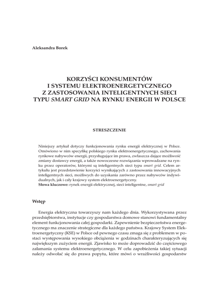 aleksandra borek korzYści konSumentów i SYStemu elektroenerGetYczneGo z zaStoSowania inteliGentnYch Sieci tYpu SMARt GRId na rYnku enerGii w polSce StreSzczenie Niniejszy artykuł dotyczy funkcjonowania rynku energii elektrycznej w Polsce. Omówiono w nim specyfikę polskiego rynku elektroenergetycznego, zachowania rynkowe nabywców energii, przysługujące im prawa, zwłaszcza dające możliwość zmiany dostawcy energii, a także nowoczesne rozwiązania wprowadzane na rynku przez operatorów, którymi są inteligentnych sieci typu smart grid. Celem artykułu jest przedstawienie korzyści wynikających z zastosowania innowacyjnych inteligentnych sieci, możliwych do uzyskania zarówno przez nabywców indywidualnych, jak i cały krajowy system elektroenergetyczny. Słowa kluczowe: rynek energii elektrycznej, sieci inteligentne, smart grid wstęp Energia elektryczna towarzyszy nam każdego dnia. Wykorzystywana przez przedsiębiorstwa, instytucje czy gospodarstwa domowe stanowi fundamentalny element funkcjonowania całej gospodarki. Zapewnienie bezpieczeństwa energetycznego ma znaczenie strategiczne dla każdego państwa. Krajowy System Elektroenergetyczny (KSE) w Polsce od pewnego czasu zmaga się z problemem w postaci występowania wysokiego obciążenia w godzinach charakteryzujących się największym zużyciem energii. Zjawisko to może doprowadzić do częściowego załamania systemu elektroenergetycznego. W celu zapobieżenia takiej sytuacji należy odwołać się do prawa popytu, które mówi o wrażliwości gospodarstw 178 Aleksandra Borek domowych na ceny. Należy jednak zwrócić uwagę, że część konsumentów nie do końca rozumie, a nawet nie zna zasad funkcjonowania rynku energii, co powoduje, że świadomość konieczności efektywnego zarządzania energią jest niewielka. Jest to zapewne efekt trudności, które do niedawna towarzyszyły pozyskiwaniu i analizie danych pomiarowych. W dobie rozwoju nowych technologii rynek energii ulega przeobrażeniu. Dzięki włączeniu nowych technologii do rynku energii można spodziewać się wymiernych korzyści zarówno dla konsumentów, sprzedawców, operatorów dystrybucyjnych, jak i dla całego systemu elektroenergetycznego. W artykule scharakteryzowano rynek energii elektrycznej w Polsce, a także zaprezentowano inteligentne rozwiązania informatyczne, z sukcesem na nim wdrażane. Głównym celem artykułu jest przedstawienie korzyści, jakie nabywcom i całemu krajowemu systemowi elektroenergetycznemu daje wdrożenie inteligentnych sieci typu smart grid. 1. rynek energii elektrycznej w polsce Obecny kształt rynku energii elektrycznej w Polsce jest wynikiem wieloletnich przekształceń w sektorze energetycznym, zmierzających do zbudowania w kraju w pełni konkurencyjnego rynku elektroenergetycznego. Jednym z bazowych założeń dla tworzenia rynku energii jest oddzielenie energii elektrycznej, jako towaru, od jej przesyłu i rozdziału, jako usług sieciowych1. Energia elektryczna przez długi czas była postrzegana jako dobro podstawowe, którego dostarczenie do odbiorców końcowych należało do obowiązków przedsiębiorstw użyteczności publicznej. Obecnie na rynku elektroenergetycznym energia przestaje być dobrem, a staje się pełnowartościowym towarem. Mimo że energia jest towarem, to rynek energii różni się od tradycyjnych rynków towarowych. Uzasadnieniem dla tego stwierdzenia są specyficzne cechy energii jako towaru i rynku elektroenergetycznego, a w szczególności2: – brak możliwości magazynowania energii w sposób trwały, – niska elastyczność cenowa popytu, – niska elastyczność cenowa podaży, – konieczność zapewnienia ciągłego równoważenia popytu i podaży, – konieczność zapewnienia bezawaryjnego funkcjonowania systemu elektroenergetycznego, – skłonność rynku do monopolizacji z uwagi na specyfikę systemu elektroenergetycznego. Stabilność i ciągłość dostaw energii elektrycznej są gwarantowane przez zespół podmiotów należących do podsystemu KSE3: 1 http://www.pse.pl/index.php?dzid=81&did=40 (dostęp: 2.04.2016). A. Pach-Gurgul, Jednolity rynek energii elektrycznej w Unii Europejskiej, Difin, Warszawa 2012, s. 21. 3 Krajowy System Elektroenergetyczny (KSE) jest zbiorem urządzeń służących do rozdziału, przesyłu i wytwarzania energii elektrycznej, połączonych w system pozwalający na dostawy energii elektrycznej w sposób ciągły i nieprzerwany, http://www.paiz.gov.pl/publikacje/ opracowania_sektorowe 2 Korzyści konsumentów i systemu elektroenergetycznego z zastosowania… 179 – – – – podsystem wytwórczy, sieć przesyłową, sieć dystrybucyjną, podmioty zajmujące się obrotem. Głównym obszarem działalności podsystemu wytwórczego jest wytwarzanie energii elektrycznej pochodzącej z nośników energetycznych. W Polsce przeważa energia pozyskiwana z paliw kopalnianych. Odnosząc się do danych ilościowych dotyczących funkcjonowania KSE, w 2015 r. procentowy udział energii wytworzonej z węgla w polskim rynku elektroenergetycznym wyniósł aż 88,73%, gdy tymczasem udział energii pozyskanej z OZE stanowił zaledwie 7,65%4. Sieci przesyłowe stanowią pierwszy element systemu transportu energii do odbiorców końcowych. Linie przesyłowe mają za zadanie przesłanie energii elektrycznej o wysokim napięciu od wytwórcy do głównych punktów zasilania (GPZ), gdzie za pomocą transformatorów energii dochodzi do zamiany napięcia z wysokiego i średniego na niskie. Następnie energia jest transportowana do sieci dystrybucyjnych5. Właścicielem sieci przesyłowych w Polsce są Polskie Sieci Energetyczne. Sieci dystrybucyjne transportują energię z GPZ, a następnie przesyłają energię do odbiorców. Podmiotami zarządzającymi sieciami dystrybucyjnymi w Polsce są tzw. operatorzy systemów dystrybucyjnych6. Rynek dystrybucji energii w Polsce został podzielony pomiędzy pięciu głównych OSD (rys. 1)7: – Energa, – Enea, – PGE,
