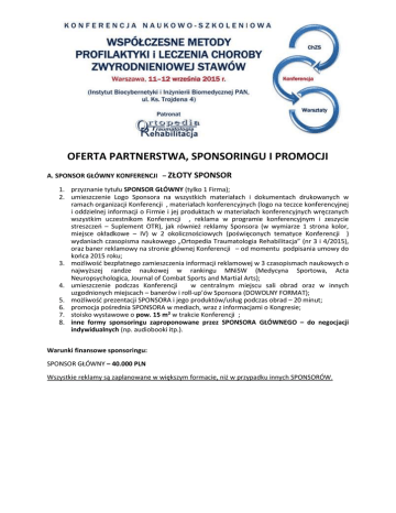 OFERTA PARTNERSTWA, SPONSORINGU I PROMOCJI A. SPONSOR GŁÓWNY KONFERENCJI – ZŁOTY SPONSOR 1. przyznanie tytułu SPONSOR GŁÓWNY (tylko 1 Firma); 2. umieszczenie Logo Sponsora na wszystkich materiałach i dokumentach drukowanych w ramach organizacji Konferencji , materiałach konferencyjnych (logo na teczce konferencyjnej i oddzielnej informacji o Firmie i jej produktach w materiałach konferencyjnych wręczanych wszystkim uczestnikom Konferencji , reklama w programie konferencyjnym i zeszycie streszczeń – Suplement OTR), jak również reklamy Sponsora (w wymiarze 1 strona kolor, miejsce okładkowe – IV) w 2 okolicznościowych (poświęconych tematyce Konferencji ) wydaniach czasopisma naukowego „Ortopedia Traumatologia Rehabilitacja” (nr 3 i 4/2015), oraz baner reklamowy na stronie głównej Konferencji – od momentu podpisania umowy do końca 2015 roku; 3. możliwość bezpłatnego zamieszczenia informacji reklamowej w 3 czasopismach naukowych o najwyższej randze naukowej w rankingu MNiSW (Medycyna Sportowa, Acta Neuropsychologica, Journal of Combat Sports and Martial Arts); 4. umieszczenie podczas Konferencji w centralnym miejscu sali obrad oraz w innych uzgodnionych miejscach – banerów i roll-up’ów Sponsora (DOWOLNY FORMAT); 5. możliwość prezentacji SPONSORA i jego produktów/usług podczas obrad – 20 minut; 6. promocja pośrednia SPONSORA w mediach, wraz z informacjami o Kongresie; 7. stoisko wystawowe o pow. 15 m² w trakcie Konferencji ; 8. inne formy sponsoringu zaproponowane przez SPONSORA GŁÓWNEGO – do negocjacji indywidualnych (np. audiobooki itp.). Warunki finansowe sponsoringu: SPONSOR GŁÓWNY – 40.000 PLN Wszystkie reklamy są zaplanowane w większym formacie, niż w przypadku innych SPONSORÓW. B. SPONSOR KONFERENCJI – SREBRNY SPONSOR 1. przyznanie tytułu SPONSORA SREBRNEGO (max. 3 Firmy); 2. umieszczenie oficjalnego Logo Sponsora na wszystkich materiałach i dokumentach drukowanych w ramach Konferencji , materiałach konferencyjnych (logo na teczce kongresowych i oddzielnej informacji o Firmie i jej produktach w materiałach kongresowych wręczanych wszystkim uczestnikom Konferencji , reklama w programie konferencyjnym), jak również reklamy Sponsora (w wymiarze 1 strona kolor, miejsce okładkowe – II) w 2 okolicznościowych (poświęconych tematyce Kampanii) wydaniach czasopisma naukowego „Ortopedia Traumatologia Rehabilitacja” (nr 3 i 4/2015), plus reklama w Suplemencie (program + streszczenia; A4 kolor, miejsce okładkowe – II); 3. umieszczenie podczas Konferencji w sali obrad oraz w innych uzgodnionych miejscach – banerów i roll-up’ów Sponsora (ŚREDNI FORMAT); 4. możliwość prezentacji SPONSORA i jego produktów podczas obrad – 15 minut; 5. promocja pośrednia SPONSORA w mediach, wraz z informacjami o Kongresie; 6. stoisko wystawowe o pow. 10 m² w trakcie Konferencji ; Warunki finansowe sponsoringu: SREBRNY SPONSOR – 25.000 PLN C. SPONSOR KONFERENCJI – BRĄZOWY SPONSOR 1. przyznanie tytułu SPONSORA; 2. umieszczenie oficjalnego Logo Sponsora na wszystkich materiałach i dokumentach drukowanych w ramach Konferencji , materiałach kongresowych (logo na teczce kongresowej i oddzielnej informacji o Firmie i jej produktach w materiałach kongresowych wręczanych wszystkim uczestnikom Konferencji , reklama w programie kongresowym), jak również reklamy Sponsora (w wymiarze 1 strona kolor, wew. pisma) w 2 okolicznościowych (poświęconych tematyce Kampanii) wydaniach czasopisma naukowego „Ortopedia Traumatologia Rehabilitacja” (wydanie 3 i 4/2015) plus reklama w Suplemencie (program + streszczenia; A4 kolor, wew. pisma); 3. umieszczenie podczas Konferencji w sali obrad oraz w innych uzgodnionych miejscach – banerów i roll-up’ów Sponsora; 4. możliwość prezentacji SPONSORA i jego produktów podczas obrad – 10 minut; 5. promocja pośrednia SPONSORA w mediach, wraz z informacjami o Konferencji ; 6. stoisko wystawowe o pow. 8 m² w trakcie Konferencji ; Warunki finansowe sponsoringu: BRĄZOWY SPONSOR – 15.000 PLN IM WCZEŚNIEJ TYM DŁUŻEJ! ponieważ od momentu podpisania umowy na wszelkich informacjach na temat Konferencji pojawi się logo Sponsora! ISTOTNE INFORMACJE DODATKOWE Przyjęcie tytułu SPONSORA gwarantuje także dodatkowe profity związane z promocją Konferencji realizowaną przez organizatorów w ramach innych, zaplanowanych działań niezwiązanych bezpośrednio z Kongresem, które umożliwią dotarcie do szerokiego kręgu odbiorców ze środowiska medycznego i sportowego poprzez: - działalność wydawniczą w obszarach niezwiązanych z Kongresem; - możliwość wysyłki komunikatu na prywatne adresy lekarzy różnych specjalności i fizjoterapeutów (baza ok. 11 tys. rekordów), do których, zgodnie z Ustawą o Ochronie Danych Osobowych, nie mają dostępu inne podmioty.