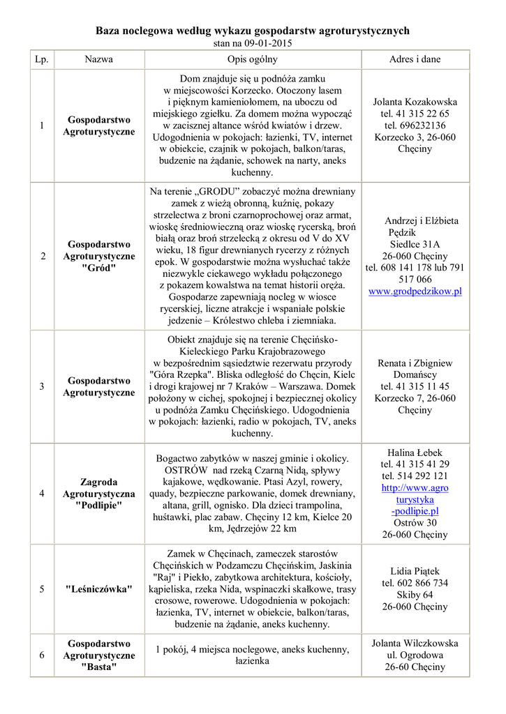 Baza noclegowa według wykazu gospodarstw agroturystycznych stan na 09-01-2015 Lp. 1 Nazwa Opis ogólny Adres i dane Gospodarstwo Agroturystyczne Dom znajduje się u podnóża zamku w miejscowości Korzecko. Otoczony lasem i pięknym kamieniołomem, na uboczu od miejskiego zgiełku. Za domem można wypocząć w zacisznej altance wśród kwiatów i drzew. Udogodnienia w pokojach: łazienki, TV, internet w obiekcie, czajnik w pokojach, balkon/taras, budzenie na żądanie, schowek na narty, aneks kuchenny. Jolanta Kozakowska tel. 41 315 22 65 tel. 696232136 Korzecko 3, 26-060 Chęciny Gospodarstwo Agroturystyczne "Gród" Na terenie „GRODU” zobaczyć można drewniany zamek z wieżą obronną, kuźnię, pokazy strzelectwa z broni czarnoprochowej oraz armat, Andrzej i Elżbieta wioskę średniowieczną oraz wioskę rycerską, broń Pędzik białą oraz broń strzelecką z okresu od V do XV Siedlce 31A wieku, 18 figur drewnianych rycerzy z różnych 26-060 Chęciny epok. W gospodarstwie można wysłuchać także tel. 608 141 178 lub 791 niezwykle ciekawego wykładu połączonego 517 066 z pokazem kowalstwa na temat historii oręża. www.grodpedzikow.pl Gospodarze zapewniają nocleg w wiosce rycerskiej, liczne atrakcje i wspaniałe polskie jedzenie – Królestwo chleba i ziemniaka. Gospodarstwo Agroturystyczne Obiekt znajduje się na terenie ChęcińskoKieleckiego Parku Krajobrazowego w bezpośrednim sąsiedztwie rezerwatu przyrody "Góra Rzepka". Bliska odległość do Chęcin, Kielc i drogi krajowej nr 7 Kraków – Warszawa. Domek położony w cichej, spokojnej i bezpiecznej okolicy u podnóża Zamku Chęcińskiego. Udogodnienia w pokojach: łazienki, radio w pokojach, TV, aneks kuchenny. Renata i Zbigniew Domańscy tel. 41 315 11 45 Korzecko 7, 26-060 Chęciny Zagroda Agroturystyczna "Podlipie" Bogactwo zabytków w naszej gminie i okolicy. OSTRÓW nad rzeką Czarną Nidą, spływy kajakowe, wędkowanie. Ptasi Azyl, rowery, quady, bezpieczne parkowanie, domek drewniany, altana, grill, ognisko. Dla dzieci trampolina, huśtawki, plac zabaw. Chęciny 12 km, Kielce 20 km, Jędrzejów 22 km Halina Łebek tel. 41 315 41 29 tel. 514 292 121 http://www.agro turystyka -podlipie.pl Ostrów 30 26-060 Chęciny 5 "Leśniczówka" Zamek w Chęcinach, zameczek starostów Chęcińskich w Podzamczu Chęcińskim, Jaskinia "Raj" i Piekło, zabytkowa architektura, kościoły, kąpieliska, rzeka Nida, wspinaczki skałkowe, trasy crosowe, rowerowe. Udogodnienia w pokojach: łazienka, TV, internet w obiekcie, balkon/taras, budzenie na żądanie, aneks kuchenny. Lidia Piątek tel. 602 866 734 Skiby 64 26-060 Chęciny 6 Gospodarstwo Agroturystyczne "Basta" 1 pokój, 4 miejsca noclegowe, aneks kuchenny, łazienka Jolanta Wilczkowska ul. Ogrodowa 26-60 Chęciny 2 3 4 tel. 782505388 Gospodarstwo Agroturystyczne Zamek w Chęcinach, Jaskinia Raj, Skansen w Tokarni, Basen kryty "Perła" w Nowinach. Udogodnienia w pokojach: dom mieszkalny w pełni wyposażony, telewizja satelitarna, kominek. Halina Tomaszewska tel. 660 564 910 tel. 41 361 57 41 8 Gospodarstwo Agroturystyczne "U Andrzeja" W pobliżu obiektu znajdują się ruiny Zamku Chęcińskiego, Muzeum Wsi Kieleckiej w Tokarni, Jaskinia Raj i Piekło, Dwór Obronny starostów Chęcińskich. Brama w formie łuku tryumfalnego w podzamczu Chęcińskim. Zamek rycerski w Sobkowie. Udogodnienia w pokojach: radio, TV, czajnik, balkon/taras, aneks kuchenny Andrzej Majewski tel. 41 315 17 56 Radkowice 26 26-060 Chęciny 9 Apartament z widokiem na Zamek Ruiny Zamku w Chęcinach, Jaskinia Raj, fortalicja w Sobkowie, zalew w Bolminie. Udogodnienia w pokojach: apartamenty, radio, TV, czajnik, balkon/taras, internet w obiekcie, aneks kuchenny. 7 10 Gospodarstwo Agroturystyczne Tomasz Bień tel. 608 369 773 Dużo zieleni, sad owocowy w nim znajdują się ławeczki, grill, kozie mleko, ser, kąpiel w kozim mleku; miejsce na namioty, staw zarybiony. Udogodnienia w pokojach: łazienka, radio, TV, czajnik, aneks kuchenny. Halina Curyl tel. 509 448 176 tel. 41 315 44 72 Wojkowiec 7 26-060 Chęciny Zdzisława Wilk tel. 41 315 14 00 tel. 662 516 197 Ul. Zatropie 5 26-060 Chęciny 11 Gospodarstwo Agroturystyczne "Krystyna" W pobliżu Jaskinie Raj, Piekło, Zamek w Chęcinach. Skansen w Tokarni, kąpielisko w Bolminie. Udogodnienia w pokojach: łazienka, możliwość dostawki, radio, TV, telefon w pokojach, internet w obiekcie, czajnik, balkon/taras, schowek na narty, aneks kuchenny. 12 Noclegi "Pod Zamkową Górą" Pokoje z łazienkami, TV, aneks kuchenny z wyposażeniem. Ogród z miejscem do grilowania, oczko wodne, miejsca parkingowe. Piękny widok na ruiny Zamku Ewa Gruszka ul. Jędrzejowska 7 tel. 500 566 466 email: [email protected] 13 Powiatowe Szkolne Schronisko Młodzieżowe 180 miejsc noclegowych, świetlice, aneksy kuchenne, węzły sanitarne. Wycieczki szkolne, grupy zorganizowane i turyści indywidualni 26-060 Chęciny, ul. Białego Zagłębia 1 tel./fax 41 315 26 54 email: [email protected] Gospodarstwo Agroturystyczne 100 m. do zalewu Bolmin, dom dwa pokoje, kuchnia, WC, prysznic, TV, pole namiotowe, camping, pole do gry w siatkówkę, ognisko, grill Jarosław Turlej tel. 888 646 303 Wymysłów 12 26-060 Chęciny 14 15 Zajazd Pod Srebrną Górą Zajazd Pod Srebrną Górą mieści się w świeżo wyremontowanej, zabytkowej kamienicy położonej w samym centrum Chęcin - przy Placu 2-go Czerwca, tuż obok budynku Urzędu Miasta i Gminy. Zajazd oferuje miejsca noclegowe w 5ciu pokojach 2-osobowych z łazienkami i TV. Obiekt jest całodobowo monitorowany. Plac 2 Czerwca 28 26-060 Chęciny tel. 41-315-10-09, tel. 664 763 281 www.zajazd-checiny.pl Biała Dama Gospodarstwo Agroturystyczne. Domostwo pod Górą Zamkową. Pokoje z łazienkami + internet. Kuchnia z wyposażeniem do dyspozycji gości. Ogród, zieleń, grill, ławeczki, piękne widoki. Agnieszka Kułagowska 26-060 Chęciny ul. Jędrzejowska 17 tel. 880 095 547 www.bialadama. checiny.eu 17 Gospodarstwo agroturystyczne Agro