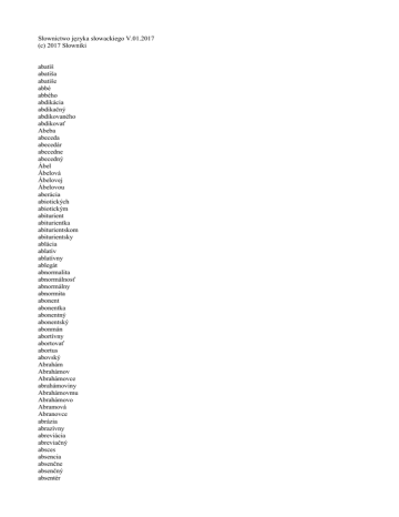 Słownictwo języka słowackiego V.01.2017 (c) 2017 Słowniki abatíš abatiša abatiše abbé abbého abdikácia abdikačný abdikovaného abdikovať Abeba abeceda abecedár abecedne abecedný Ábel Ábelová Ábelovej Ábelovou aberácia abiotických abiotickým abiturient abiturientka abiturientskom abiturientsky ablácia ablatív ablatívny ablegát abnormalita abnormálnosť abnormálny abnormita abonent abonentka abonentný abonentský abonmán abortívny abortovať abortus abovský Abrahám Abrahámov Abrahámovce abrahámoviny Abrahámovmu Abrahámovo Abramová Abranovce abrázia abrazívny abreviácia abreviačný absces absencia absenčne absenčný absentér absentérka absentérsky absentérstvo absentoval absentovala absentovali absentovalo absentovaní absentovania absentovanie absentovaniu absentovanú absentovať absentuje absentujú absint absintový Absolón absolutista absolutisticky absolutistický absolutistka absolutizácia absolutizmus absolutizovanie absolutizovať absolútnosť absolútny absolutórium absolvent absolventka absolventove absolventský absolvovanie absolvovaný absolvovať absorbovaná absorbované absorbovanej absorbovanie Absorbovanú absorbovaný absorbovať absorbujúci absorpcia absorpčne absorpčný abstinencia abstinenčný abstinent abstinentka abstinentný abstinentský abstinovala abstinovalo abstinovania abstrahovaná abstrahovanie abstrahovať abstrahujúci abstrakcia abstrakcionista abstrakcionistický abstrakcionistka abstrakcionizmus abstrakčný abstrakt abstraktne abstraktnosť abstraktnosti abstraktný absurdít absurdita absurditách absurditám absurditami absurdite absurditou absurditu absurdity absurdne absurdnosť absurdný absurdum aby abyže accelerando acetón acetónový acetylén acetylénový ach ách achát achátovo achátový Achilles achillova Achillovej achillovi Achillovou achillovský achillovu Achillových Achillovým achilovka achkať achromatický acidofilný áčka áčkar áčkarka áčkarský Áčko áčkom acrylová acrylové acrylový acta acyklický acylpyrín ad ad justujú adagio adagiový Adam Adamami adamita adamitka adamitský Adamova Adamove Adamovej Adamovho Adamovia Adamovom adaptabilnosť adaptabilný adaptácia adaptačne adaptačný adaptér adaptérmi adaptéry adaptívne adaptovaná adaptované adaptovaného adaptovanej adaptovaní adaptovania adaptovanie adaptovaním adaptovaniu adaptovanú adaptovaný adaptovaných adaptovať adaptujúci Addis Addisabebčan Addisabebčanka adekvátnosť adekvátny Adela Adele Aden Adene Adenského adenskom Adenským adept adeptiek adeptka adeptova adhézia adhézny adícia adičný adié adieu aditívny adjektív adjektívny adjektívum adjunkt adjunktiek adjunktka adjunktský adjustácia adjustačný Adlerova administrácia administratíva administratívnoprávny administratívnosprávny administratívny administrátor administrátorka administrátormi administrátorsky administrátorský administrovala administrovali administrované administrovanej administrovaní administrovania administrovanie administrovaním administrovaniu administrovaný administrovaných administrovať administruje administrujú admirál admiralita admirálsky ADN Adobe adolescencia adolescent adolescentný Adolfovia adopcia adopčný adoptácia adoptačný adoptant adoptívny adoptovaná adoptované adoptovanec adoptovaní adoptovania adoptovanie adoptovanou adoptovanú adoptovaný adoptovaným adoptovanými adoptovať adorovať adorujú adrenalín adrenalínový adresa adresár adresármi adresárový adresát adresátka adresátové adresne adresnosť adresný adresovaná adresovane adresované adresovaní adresovania adresovanie adresovaný adresovať Adrián Adriána Adrianin Adriánovia Adriatické adriatického Adriatickej adriatický adries adsorbované adsorbovať adsorpcia adsorpčný adut advent adventný adverbiálny adverbium advokácia advokát advokátka advokátovej advokátovho advokátovým advokátsky advokátstvo aerobik aerodróm aerodynamickosť aerodynamicky aerodynamický aerodynamika aerofília aerofóbia aerogram aerogramu aeroklub aerolínia aeronautika aeronautike aeronautiku aeronautiky aerosól aerosólový aerosólovými aerosóly aerostat aerotaxi aerotaxík afázia afekcia afekt afektácia afektívny afektovane afektovanie afektovanosť afektovaný afektovať afektový afektujúci afélium aféra aférista Afganec Afganistan Afganka afganský afiliácia afiliačný afinácia afinačný afinita afinitný afirmácia afirmatívny afirmovať afiš aforickosť aforicky aforický aforista aforisticky aforistický aforizmus Afričan Afričanka Africká africký Afrika afrikánčina Afrodita afrodiziakum aga agar agát Agáta agátina agátový agáva agend agenda agens agensový agent Agenta agentka agentovej agentovho agentových agentský agentúra agentúrny agilita Agilitou agility agilne agilnosť agilný agitácia agitačný agitátor agitátorka agitátorské agitátorský agitka agitovanie agitovať aglomerácia aglomeračne aglomeračný aglomerát aglomerované aglomerovaného aglomerovanie aglomerovaný aglomerovaných aglomerovať aglutinácia aglutinačné Agnesa Agneša agnostici agnosticizmus agnostik agnusok agnuštek agogika agónia agonický agrárnický agrárnik agrárny agregát agregátmi agregátový Agregovaná agregované agregovaného agregovanej agregovanom agregovanou agregovanú agregovaný agregovaných agregovaným agregovanými agregovať agresia agresivita agresivite agresivitou agresivitu agresivity agresívnosť agresívny agresor agresorský agrikultúra agrikultúrny agrobiológ agrobiológia agrobiologička agrobiologický agrokomplex agronóm agronómami agronómia agronomický agronómka agrotechnička agrotechnicky agrotechnický agrotechnik agrotechnika agroturistický agroturistika AGU ah áh aha ahá Ahasver ahasverovský Ahasverových ahistorickosť ahistoricky ahistorický ahoj aids aidsový aj ajaj ajáj ajh