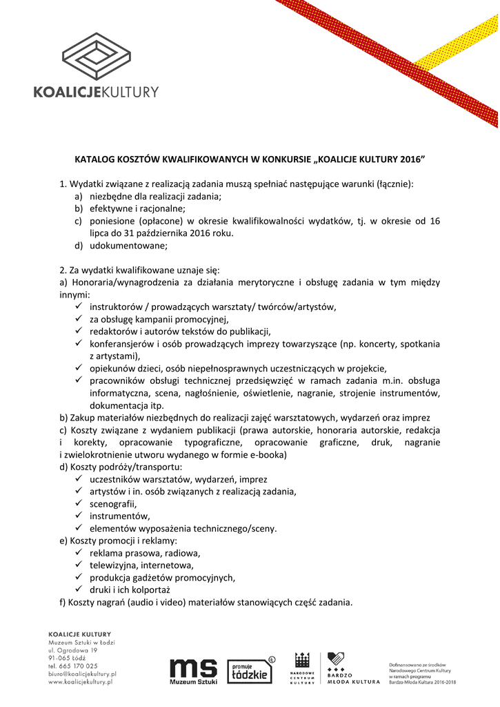 KATALOG KOSZTÓW KWALIFIKOWANYCH W KONKURSIE „KOALICJE KULTURY 2016” 1. Wydatki związane z realizacją zadania muszą spełniać następujące warunki (łącznie): a) niezbędne dla realizacji zadania; b) efektywne i racjonalne; c) poniesione (opłacone) w okresie kwalifikowalności wydatków, tj. w okresie od 16 lipca do 31 października 2016 roku. d) udokumentowane; 2. Za wydatki kwalifikowane uznaje się: a) Honoraria/wynagrodzenia za działania merytoryczne i obsługę zadania w tym między innymi: instruktorów / prowadzących warsztaty/ twórców/artystów, za obsługę kampanii promocyjnej, redaktorów i autorów tekstów do publikacji, konferansjerów i osób prowadzących imprezy towarzyszące (np. koncerty, spotkania z artystami), opiekunów dzieci, osób niepełnosprawnych uczestniczących w projekcie, pracowników obsługi technicznej przedsięwzięć w ramach zadania m.in. obsługa informatyczna, scena, nagłośnienie, oświetlenie, nagranie, strojenie instrumentów, dokumentacja itp. b) Zakup materiałów niezbędnych do realizacji zajęć warsztatowych, wydarzeń oraz imprez c) Koszty związane z wydaniem publikacji (prawa autorskie, honoraria autorskie, redakcja i korekty, opracowanie typograficzne, opracowanie graficzne, druk, nagranie i zwielokrotnienie utworu wydanego w formie e-booka) d) Koszty podróży/transportu: uczestników warsztatów, wydarzeń, imprez artystów i in. osób związanych z realizacją zadania, scenografii, instrumentów, elementów wyposażenia technicznego/sceny. e) Koszty promocji i reklamy: reklama prasowa, radiowa, telewizyjna, internetowa, produkcja gadżetów promocyjnych, druki i ich kolportaż f) Koszty nagrań (audio i video) materiałów stanowiących część zadania. g) Koszt wynajęcia sali/pomieszczeń/placu na potrzeby zadania. h) Scena i wyposażenie niezbędne do realizacji zadania: montaż i demontaż/ wynajem sceny na potrzeby zadania, wynajem niezbędnego sprzętu i wyposażenia (np. instrumenty, nagłośnienie, światło, telebimy, rzutniki). i) Noclegi i wyżywienie dla uczestników przedsięwzięć organizowanych w ramach zadania, w tym artystów j) Dokumentacja/rejestracja realizacji zadania (filmowa, dźwiękowa, zdjęciowa). k) Koszty związane z dostosowaniem działań i formy przekazu do potrzeb osób z niepełnosprawnościami. UWAGA: Kosztem niekwalifikowanym jest zakupu sprzętu, wyposażenia i innych środków trwałych