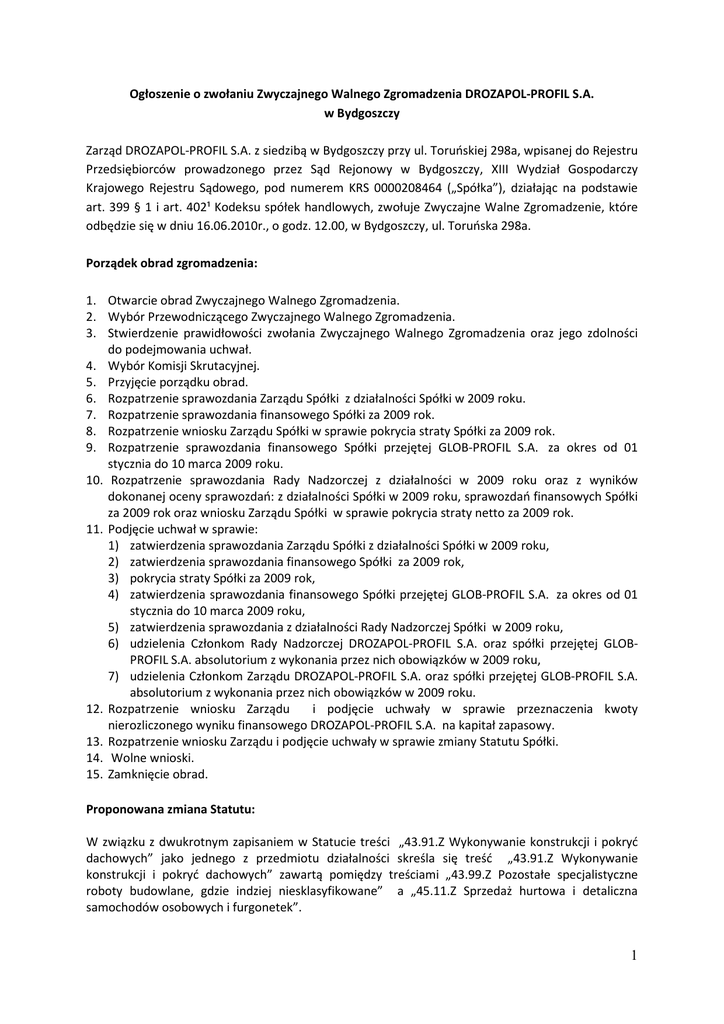 Ogłoszenie o zwołaniu Zwyczajnego Walnego Zgromadzenia DROZAPOL-PROFIL S.A. w Bydgoszczy Zarząd DROZAPOL-PROFIL S.A. z siedzibą w Bydgoszczy przy ul. Toruńskiej 298a, wpisanej do Rejestru Przedsiębiorców prowadzonego przez Sąd Rejonowy w Bydgoszczy, XIII Wydział Gospodarczy Krajowego Rejestru Sądowego, pod numerem KRS 0000208464 („Spółka”), działając na podstawie art. 399 § 1 i art. 402¹ Kodeksu spółek handlowych, zwołuje Zwyczajne Walne Zgromadzenie, które odbędzie się w dniu 16.06.2010r., o godz. 12.00, w Bydgoszczy, ul. Toruńska 298a. Porządek obrad zgromadzenia: 1. Otwarcie obrad Zwyczajnego Walnego Zgromadzenia. 2. Wybór Przewodniczącego Zwyczajnego Walnego Zgromadzenia. 3. Stwierdzenie prawidłowości zwołania Zwyczajnego Walnego Zgromadzenia oraz jego zdolności do podejmowania uchwał. 4. Wybór Komisji Skrutacyjnej. 5. Przyjęcie porządku obrad. 6. Rozpatrzenie sprawozdania Zarządu Spółki z działalności Spółki w 2009 roku. 7. Rozpatrzenie sprawozdania finansowego Spółki za 2009 rok. 8. Rozpatrzenie wniosku Zarządu Spółki w sprawie pokrycia straty Spółki za 2009 rok. 9. Rozpatrzenie sprawozdania finansowego Spółki przejętej GLOB-PROFIL S.A. za okres od 01 stycznia do 10 marca 2009 roku. 10. Rozpatrzenie sprawozdania Rady Nadzorczej z działalności w 2009 roku oraz z wyników dokonanej oceny sprawozdań: z działalności Spółki w 2009 roku, sprawozdań finansowych Spółki za 2009 rok oraz wniosku Zarządu Spółki w sprawie pokrycia straty netto za 2009 rok. 11. Podjęcie uchwał w sprawie: 1) zatwierdzenia sprawozdania Zarządu Spółki z działalności Spółki w 2009 roku, 2) zatwierdzenia sprawozdania finansowego Spółki za 2009 rok, 3) pokrycia straty Spółki za 2009 rok, 4) zatwierdzenia sprawozdania finansowego Spółki przejętej GLOB-PROFIL S.A. za okres od 01 stycznia do 10 marca 2009 roku, 5) zatwierdzenia sprawozdania z działalności Rady Nadzorczej Spółki w 2009 roku, 6) udzielenia Członkom Rady Nadzorczej DROZAPOL-PROFIL S.A. oraz spółki przejętej GLOBPROFIL S.A. absolutorium z wykonania przez nich obowiązków w 2009 roku, 7) udzielenia Członkom Zarządu DROZAPOL-PROFIL S.A. oraz spółki przejętej GLOB-PROFIL S.A. absolutorium z wykonania przez nich obowiązków w 2009 roku. 12. Rozpatrzenie wniosku Zarządu i podjęcie uchwały w sprawie przeznaczenia kwoty nierozliczonego wyniku finansowego DROZAPOL-PROFIL S.A. na kapitał zapasowy. 13. Rozpatrzenie wniosku Zarządu i podjęcie uchwały w sprawie zmiany Statutu Spółki. 14. Wolne wnioski. 15. Zamknięcie obrad. Proponowana zmiana Statutu: W związku z dwukrotnym zapisaniem w Statucie treści „43.91.Z Wykonywanie konstrukcji i pokryć dachowych” jako jednego z przedmiotu działalności skreśla się treść „43.91.Z Wykonywanie konstrukcji i pokryć dachowych” zawartą pomiędzy treściami „43.99.Z Pozostałe specjalistyczne roboty budowlane, gdzie indziej niesklasyfikowane” a „45.11.Z Sprzedaż hurtowa i detaliczna samochodów osobowych i furgonetek”. 1 Na podstawie art. 4022 Kodeksu spółek handlowych Spółka przekazuje informacje dotyczące udziału w Zwyczajnym Walnym Zgromadzeniu: 1. Akcjonariuszowi lub akcjonariuszom reprezentującym co najmniej 1/20 kapitału zakładowego przysługuje prawo żądania umieszczenia określonych spraw w porządku obrad Zwyczajnego Walnego Zgromadzenia Spółki. Żądanie powinno zostać zgłoszone Zarządowi Spółki nie później niż na 21 dni przed terminem Walnego Zgromadzenia. Żądanie powinno zawierać uzasadnienie lub projekt uchwały dotyczącej proponowanego punktu porządku obrad. Żądanie może zostać złożone na piśmie w siedzibie Spółki pod adresem ul. Toruńska 298a, 85-880 Bydgoszcz lub w postaci elektronicznej i przesłane na następujący adres poczty elektronicznej Spółki: [email protected]. Akcjonariusz/akcjonariusze powinien/powinni wykazać posiadanie odpowiedniej liczby akcji na dzień złożenia żądania, załączając do żądania świadectwo/a depozytowe, a w przypadku akcjonariuszy będących osobami prawnymi i spółkami osobowymi potwierdzić również uprawnienie do działania w imieniu tego, załączając aktualny odpis z KRS. 2. Akcjonariusz lub akcjonariusze Spółki reprezentujący co najmniej 1/20 kapitału zakładowego mogą przed terminem Zwyczajnego Walnego Zgromadzenia zgłaszać na piśmie w siedzibie Spółki pod adresem ul. Toruńska 298a, 85-880 Bydgoszcz lub przy wykorzystaniu środków komunikacji elektronicznej (w sposób i na adres poczty elektronicznej Spółki podany w pkt 1 powyżej) projekty uchwał dotyczące spraw wprowadzonych do porządku obrad Zwyczajnego Walnego Zgromadzenia lub spraw, które mają zostać wprowadzone do porządku obrad. Podobnie jak w pkt 1, akcjonariusz/akcjonariusze powinien/powinni wykazać posiadanie odpowiedniej liczby akcji na dzień złożenia żądania, załączając do żądania świadectwo/a depozytowe, a w przypadku akcjonariuszy będących osobami prawnymi i spółkami osobowymi potwierdzić również uprawnienie do działania w imieniu tego podmiotu, załączając aktualny odpis z KRS. 3. Każdy z akcjonariuszy uprawnionych do uczestnictwa w Walnym Zgromadzeniu może podczas Zwyczajnego Walnego Zgromadzenia zgłaszać projekty uchwał dotyczące spraw wprowadzonych do porządku obrad. 4. Akcjonariusz może uczestniczyć w Zwyczajnym Walnym Zgromadzeniu oraz wykonywać prawo głosu osobiście lub przez pełnomocnika. Spółka informuje, że wzór formularza pozwalającego na wykonywanie prawa głosu przez pełnomocnika zawierającego dane określone art. 4023 ksh został zamieszczony na stronie internetowej http://www.drozapol.pl/index.php?id=507. Pełnomocnictwo do głosowania przez pełnomocnika powinno być udzielone na piśmie lub w postaci elektronicznej. Udzielenie pełnomocnictwa w postaci elektronicznej nie wymaga opatrzenia bezpiecznym podpisem elektronicznym weryfikowanym przy pomocy ważneg
