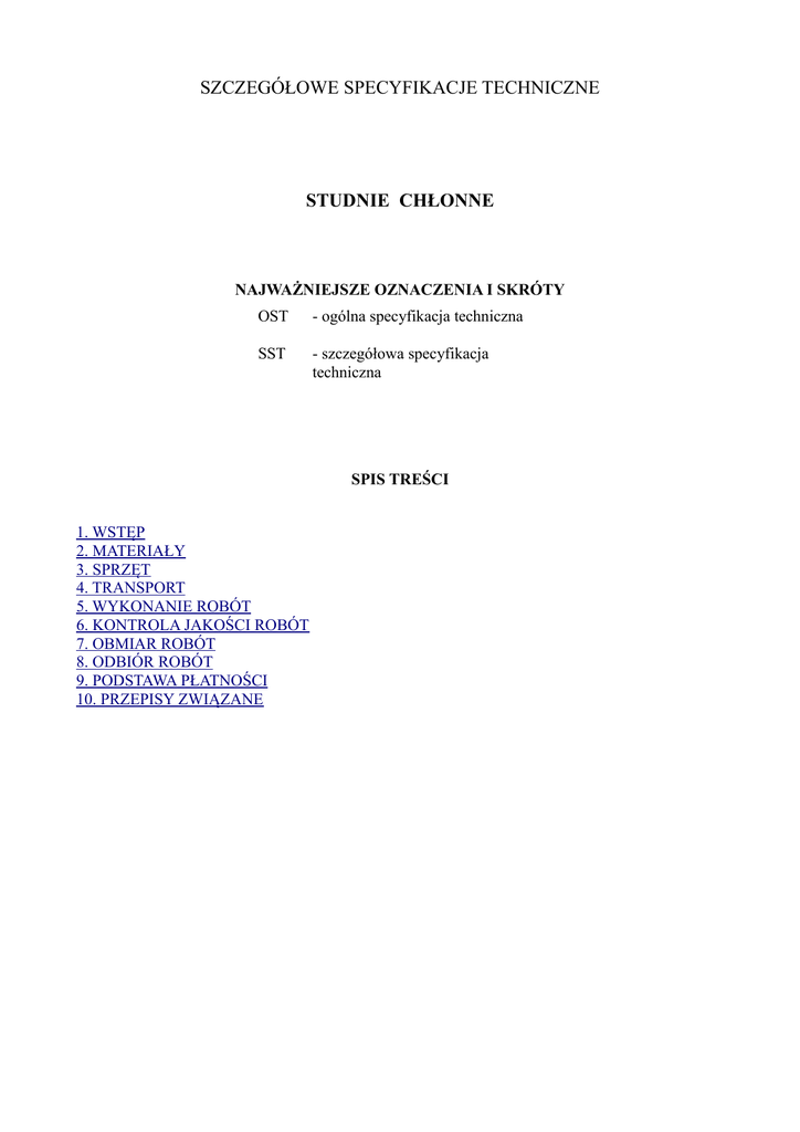 SZCZEGÓŁOWE SPECYFIKACJE TECHNICZNE STUDNIE CHŁONNE NAJWAŻNIEJSZE OZNACZENIA I SKRÓTY OST - ogólna specyfikacja techniczna SST - szczegółowa specyfikacja techniczna SPIS TREŚCI 1. WSTĘP 2. MATERIAŁY 3. SPRZĘT 4. TRANSPORT 5. WYKONANIE ROBÓT 6. KONTROLA JAKOŚCI ROBÓT 7. OBMIAR ROBÓT 8. ODBIÓR ROBÓT 9. PODSTAWA PŁATNOŚCI 10. PRZEPISY ZWIĄZANE 1. WSTĘP 1.1. Przedmiot OST Przedmiotem niniejszej szczegółowej specyfikacji technicznej (SST) są wymagania dotyczące wykonania i odbioru robót związanych z wykonaniem studni chłonnych na terenie miasta Legionowo. 1.2. Zakres stosowania OST Ogólna specyfikacja techniczna (OST) stanowi obowiązującą podstawę opracowania szczegółowej specyfikacji technicznej (SST) stosowanej jako dokument przetargowy i kontraktowy przy zlecaniu i realizacji robót na drogach publicznych. 1.3. Zakres robót objętych SST Ustalenia zawarte w niniejszej specyfikacji dotyczą zasad prowadzenia robót związanych z wykonywaniem studni chłonnych, które stosuje się w terenie równinnym, gdy istnieją trudności odprowadzenia wody rowami, a pod wierzchnią nieprzepuszczalną lub częściowo przepuszczalną warstwą gruntu znajduje się grunt przepuszczalny o dostatecznej chłonności. Studnie chłonne wykonuje się jako gruntowe (wykop jamisty ze skarpami), z kręgów betonowych, wiercono-kopane i inne. Wymiary komory studni z kręgów betonowych: średnica 1,2 m, głębokość 2 m Studnię chłonną wypełnia się filtrem z przepuszczalnych warstw kruszyw od gruboziarnistych (z tłucznia i żwirów) położonych u spodu do drobnoziarnistych (z piasku) położonych u góry. Górną warstwę piasku okresowo wymienia się, po jej zamuleniu, ręcznie lub mechanicznie. 1.4. Określenia podstawowe 1.4.1. Studnia chłonna - wykop jamisty lub studzienka z kręgów, przeznaczona do zbierania wody powierzchniowej i wchłaniania jej przez podłoże gruntowe. 1.4.2. Pozostałe określenia podstawowe są zgodne z obowiązującymi, odpowiednimi polskimi normami i z definicjami podanymi w OST D-M-00.00.00 „Wymagania ogólne” pkt 1.4. 1.5. Ogólne wymagania dotyczące robót Ogólne wymagania dotyczące robót podano w OST D-M-00.00.00 „Wymagania ogólne” pkt 1.5. 2. MATERIAŁY 2.1. Ogólne wymagania dotyczące materiałów Ogólne wymagania dotyczące materiałów, ich pozyskiwania i składowania, podano w OST D-M-00.00.00 „Wymagania ogólne” pkt 2. Stosować należy wyroby budowlane wprowadzone do obrotu zgodnie z ustawą o wyrobach budowlanych [11]. 2.2. Rodzaje materiałów stosowanych w studniach chłonnych Materiałami stosowanymi przy wykonywaniu studni chłonnych są: dla studni z kręgów - kręgi betonowe lub żelbetowe i materiały filtracyjne, 2.3. Materiał filtracyjny w studni chłonnej Jako materiał filtracyjny, którym zasypuje się studnię chłonną, stosuje się tłuczeń i żwir o frakcjach od 2 do 4, od 4 do 8, od 8 do 16, od 16 do 31,5, od 31,5 do 63 mm wg PN-EN 13043 [4] oraz piasek gruby wg PN-86/B-02480 [6]. Wskaźnik wodoprzepuszczalności piasków powinien wynosić co najmniej 8 m/dobę, wg PN-55/B-04492 [5]. Żwiry i piaski nie powinny mieć zawartości związków siarki w przeliczeniu na SO3 większej niż 0,2 % masy, wg PN-EN 1744-1 [3]. 2.4. Kręgi betonowe i żelbetowe Kręgi betonowe i żelbetowe powinny odpowiadać wymaganiom określonym przez BN86/8971-08 [10] i podanym w tablicach 1 i 2. Kręgi betonowe powinny być wykonane z betonu klasy nie niższej niż C-20/25, a kręgi żelbetowe C-16/20. Kręgi przeznaczone na studnię, do której wprowadza się wodę powierzchniową z rowu powinny być „typu I” wg BN-86/8971-08 [10], bez gniazd na stopnie złazowe (studnie chłonne przeznaczone do odbioru wody ze studzienek ściekowych powinny być „typu II” z gniazdami na stopnie złazowe). Powierzchnie kręgów powinny być gładkie, jednolite, bez rys, pęknięć, ubytków i rozwarstwień. Wtrącenie ciał obcych widoczne na powierzchni wyrobu, np. drewno, odłamki cegły itp. należy traktować jako ubytki betonu o rozmiarach tych wtrąceń. Naddatki betonu na powierzchniach roboczych elementu złącza są niedopuszczalne. Tablica 1. Wymiary kręgów betonowych i żelbetowych Wymiary podstawowe, mm średnica wewnętrzn a kręgu Dopuszczalne odchyłki, mm wysokość kręgu grubość betono- żelbeto- ścianki średnicy wysokośc grubości i wego wego 800 300 1000 500 1200 lub 120 1400 600 120 ±3 80 600 100 ±8 ±5 ±5 Tablica 2. Dopuszczalne wady powierzchni kręgów betonowych i żelbetowych studni chłonnych Ubytek betonu na powierzchni Średnica wewnętrzn a kręgu, mm Rysy jednego elementu złącza pozostałej - nie więcej włoskowate - nie więcej niż niż 5 uszkodzeń skurczowe na 3 uszkodzenia dowolnej powierzchni o głębokości do 10 mm i powierzchni jednego uszkodzenia nie większej niż cm2 800 10 100 12 125 1200 15 150 1400 18 175 1000 nie ogranicza się Prostopadłość czoła mierzona różnicą wysokości kręgu powinna wynosić ± 5 mm. Kręg badany pod ciśnieniem 0,5 Mpa powinien spełniać normę PNEN 1917:2004 i nie powinien wykazywać przecieków wody. Dopuszcza się zawilgocenie zewnętrznej powierzchni kręgu, jednak bez występowania widocznych kropel. Składowanie kręgów powinno odbywać się na terenie utwardzonym z możliwością odprowadzenia wód opadowych. Składowanie na wyrównanym gruncie nieutwardzonym jest możliwe, jeśli naciski przekazywane na grunt nie przekroczą 0,5 MPa. Kręgi mogą być składowane, z zapewnieniem stateczności, w pozycji wbudowania (wielowarstwowo do wysokości 1,8 m) bez podkładów lub prostopadle do pozycji wbudowania (jednowarstwowo) z zabezpieczeniem przed przesunięciem. 2.4. Prefabrykaty z rur CFW-GRP Prefabrykaty powinny być wykonane z rur CFW-GRP zgodnych z normą PN-EN 1115 [2]. Wysokość prefabrykatów o średnicach 0,8÷1,4 powinna odpowiadać wymiarom ustalonym w dokumentacji projektowej. Prefabrykaty muszą być zgodne z apr
