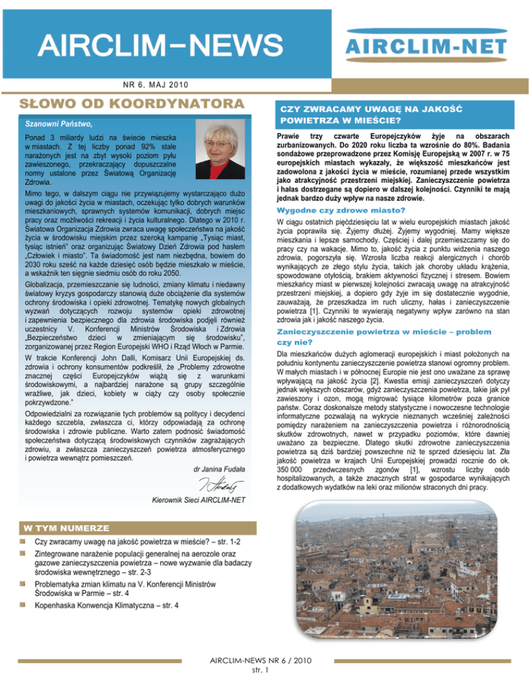 NR 6, M AJ 20 10 SŁOWO OD KOORDYNATORA Szanowni Państwo, Ponad 3 miliardy ludzi na świecie mieszka w miastach. Z tej liczby ponad 92% stale narażonych jest na zbyt wysoki poziom pyłu zawieszonego, przekraczający dopuszczalne normy ustalone przez Światową Organizację Zdrowia. Mimo tego, w dalszym ciągu nie przywiązujemy wystarczająco dużo uwagi do jakości życia w miastach, oczekując tylko dobrych warunków mieszkaniowych, sprawnych systemów komunikacji, dobrych miejsc pracy oraz możliwości rekreacji i życia kulturalnego. Dlatego w 2010 r. Światowa Organizacja Zdrowia zwraca uwagę społeczeństwa na jakość życia w środowisku miejskim przez szeroką kampanię „Tysiąc miast, tysiąc istnień” oraz organizując Światowy Dzień Zdrowia pod hasłem „Człowiek i miasto”. Ta świadomość jest nam niezbędna, bowiem do 2030 roku sześć na każde dziesięć osób będzie mieszkało w mieście, a wskaźnik ten sięgnie siedmiu osób do roku 2050. Globalizacja, przemieszczanie się ludności, zmiany klimatu i niedawny światowy kryzys gospodarczy stanowią duże obciążenie dla systemów ochrony środowiska i opieki zdrowotnej. Tematykę nowych globalnych wyzwań dotyczących rozwoju systemów opieki zdrowotnej i zapewnienia bezpiecznego dla zdrowia środowiska podjęli również uczestnicy V. Konferencji Ministrów Środowiska i Zdrowia „Bezpieczeństwo dzieci w zmieniającym się środowisku”, zorganizowanej przez Region Europejski WHO i Rząd Włoch w Parmie. W trakcie Konferencji John Dalli, Komisarz Unii Europejskiej ds. zdrowia i ochrony konsumentów podkreślił, że „Problemy zdrowotne znacznej części Europejczyków wiążą się z warunkami środowiskowymi, a najbardziej narażone są grupy szczególnie wrażliwe, jak dzieci, kobiety w ciąży czy osoby społecznie pokrzywdzone.” Odpowiedzialni za rozwiązanie tych problemów są politycy i decydenci każdego szczebla, zwłaszcza ci, którzy odpowiadają za ochronę środowiska i zdrowie publiczne. Warto zatem podnosić świadomość społeczeństwa dotyczącą środowiskowych czynników zagrażających zdrowiu, a zwłaszcza zanieczyszczeń powietrza atmosferycznego i powietrza wewnątrz pomieszczeń. dr Janina Fudała CZY ZWRACAMY UWAGĘ NA JAKOŚĆ POWIETRZA W MIEŚCIE? Prawie trzy czwarte Europejczyków żyje na obszarach zurbanizowanych. Do 2020 roku liczba ta wzrośnie do 80%. Badania sondażowe przeprowadzone przez Komisję Europejską w 2007 r. w 75 europejskich miastach wykazały, że większość mieszkańców jest zadowolona z jakości życia w mieście, rozumianej przede wszystkim jako atrakcyjność przestrzeni miejskiej. Zanieczyszczenie powietrza i hałas dostrzegane są dopiero w dalszej kolejności. Czynniki te mają jednak bardzo duży wpływ na nasze zdrowie. Wygodne czy zdrowe miasto? W ciągu ostatnich pięćdziesięciu lat w wielu europejskich miastach jakość życia poprawiła się. Żyjemy dłużej. Żyjemy wygodniej. Mamy większe mieszkania i lepsze samochody. Częściej i dalej przemieszczamy się do pracy czy na wakacje. Mimo to, jakość życia z punktu widzenia naszego zdrowia, pogorszyła się. Wzrosła liczba reakcji alergicznych i chorób wynikających ze złego stylu życia, takich jak choroby układu krążenia, spowodowane otyłością, brakiem aktywności fizycznej i stresem. Bowiem mieszkańcy miast w pierwszej kolejności zwracają uwagę na atrakcyjność przestrzeni miejskiej, a dopiero gdy żyje im się dostatecznie wygodnie, zauważają, że przeszkadza im ruch uliczny, hałas i zanieczyszczenie powietrza [1]. Czynniki te wywierają negatywny wpływ zarówno na stan zdrowia jak i jakość naszego życia. Zanieczyszczenie powietrza w mieście – problem czy nie? Dla mieszkańców dużych aglomeracji europejskich i miast położonych na południu kontynentu zanieczyszczenie powietrza stanowi ogromny problem. W małych miastach i w północnej Europie nie jest ono uważane za sprawę wpływającą na jakość życia [2]. Kwestia emisji zanieczyszczeń dotyczy jednak większych obszarów, gdyż zanieczyszczenia powietrza, takie jak pył zawieszony i ozon, mogą migrować tysiące kilometrów poza granice państw. Coraz doskonalsze metody statystyczne i nowoczesne technologie informatyczne pozwalają na wykrycie nieznanych wcześniej zależności pomiędzy narażeniem na zanieczyszczenia powietrza i różnorodnością skutków zdrowotnych, nawet w przypadku poziomów, które dawniej uważano za bezpieczne. Dlatego skutki zdrowotne zanieczyszczenia powietrza są dziś bardziej powszechne niż te sprzed dziesięciu lat. Zła jakość powietrza w krajach Unii Europejskiej prowadzi rocznie do ok. 350 000 przedwczesnych zgonów [1], wzrostu liczby osób hospitalizowanych, a także znacznych strat w gospodarce wynikających z dodatkowych wydatków na leki oraz milionów straconych dni pracy. Kierownik Sieci AIRCLIM-NET W TYM NUMERZE Czy zwracamy uwagę na jakość powietrza w mieście? – str. 1-2 Zintegrowane narażenie populacji generalnej na aerozole oraz gazowe zanieczyszczenia powietrza – nowe wyzwanie dla badaczy środowiska wewnętrznego – str. 2-3 Problematyka zmian klimatu na V. Konferencji Ministrów Środowiska w Parmie – str. 4 Kopenhaska Konwencja Klimatyczna – str. 4 AIRCLIM-NEWS NR 6 / 2010 str. 1 Skutki zdrowotne zanieczyszczenia powietrza w miastach europejskich Głównymi zanieczyszczeniami powietrza w strefach zurbanizowanych są pył zawieszony, ozon i tlenki azotu. Powodują one problemy z oddychaniem, uciążliwą astmę i wpływają na niewydolność płuc, zwłaszcza u dzieci i osób starszych. Ozon wywołuje podrażnienia oczu i dróg oddechowych. Badania jakości powietrza wskazują, że prawie 90% mieszkańców europejskich miast, w których były mierzone stężenia PM10, jest narażonych na stężenia przekraczające wartość progową określoną przez WHO - 20 µg/m3. W wielu miastach narażenie na stężenia PM10 o warto